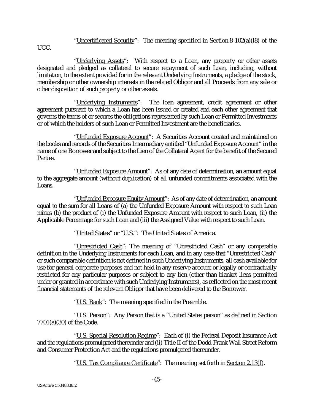 “Uncertificated Security”: The meaning specified in Section 8-102(a)(l8) of the UCC. “Underlying Assets”: With respect to a Loan, any property or other assets designated and pledged as collateral to secure repayment of such Loan, including, without limitation, to the extent provided for in the relevant Underlying Instruments, a pledge of the stock, membership or other ownership interests in the related Obligor and all Proceeds from any sale or other disposition of such property or other assets. “Underlying Instruments”: The loan agreement, credit agreement or other agreement pursuant to which a Loan has been issued or created and each other agreement that governs the terms of or secures the obligations represented by such Loan or Permitted Investments or of which the holders of such Loan or Permitted Investment are the beneficiaries. “Unfunded Exposure Account”: A Securities Account created and maintained on the books and records of the Securities Intermediary entitled “Unfunded Exposure Account” in the name of one Borrower and subject to the Lien of the Collateral Agent for the benefit of the Secured Parties. “Unfunded Exposure Amount”: As of any date of determination, an amount equal to the aggregate amount (without duplication) of all unfunded commitments associated with the Loans. “Unfunded Exposure Equity Amount”: As of any date of determination, an amount equal to the sum for all Loans of (a) the Unfunded Exposure Amount with respect to such Loan minus (b) the product of (i) the Unfunded Exposure Amount with respect to such Loan, (ii) the Applicable Percentage for such Loan and (iii) the Assigned Value with respect to such Loan. “United States” or “U.S.”: The United States of America. “Unrestricted Cash”: The meaning of “Unrestricted Cash” or any comparable definition in the Underlying Instruments for each Loan, and in any case that “Unrestricted Cash” or such comparable definition is not defined in such Underlying Instruments, all cash available for use for general corporate purposes and not held in any reserve account or legally or contractually restricted for any particular purposes or subject to any lien (other than blanket liens permitted under or granted in accordance with such Underlying Instruments), as reflected on the most recent financial statements of the relevant Obligor that have been delivered to the Borrower. “U.S. Bank”: The meaning specified in the Preamble. “U.S. Person”: Any Person that is a “United States person” as defined in Section 7701(a)(30) of the Code. “U.S. Special Resolution Regime”: Each of (i) the Federal Deposit Insurance Act and the regulations promulgated thereunder and (ii) Title II of the Dodd-Frank Wall Street Reform and Consumer Protection Act and the regulations promulgated thereunder. “U.S. Tax Compliance Certificate”: The meaning set forth in Section 2.13(f). -45- USActive 55348338.2