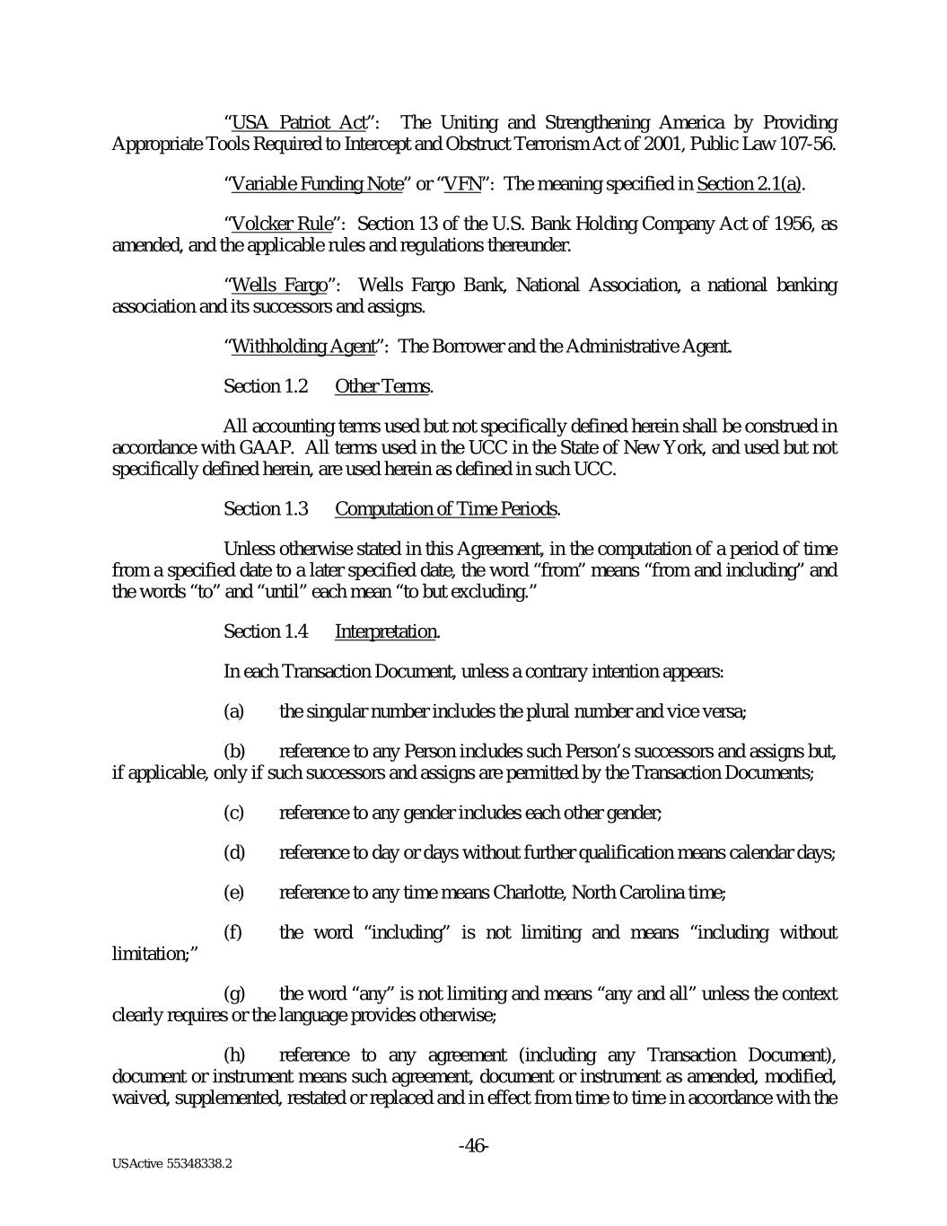 “USA Patriot Act”: The Uniting and Strengthening America by Providing Appropriate Tools Required to Intercept and Obstruct Terrorism Act of 2001, Public Law 107-56. “Variable Funding Note” or “VFN”: The meaning specified in Section 2.1(a). “Volcker Rule”: Section 13 of the U.S. Bank Holding Company Act of 1956, as amended, and the applicable rules and regulations thereunder. “Wells Fargo”: Wells Fargo Bank, National Association, a national banking association and its successors and assigns. “Withholding Agent”: The Borrower and the Administrative Agent. Section 1.2 Other Terms. All accounting terms used but not specifically defined herein shall be construed in accordance with GAAP. All terms used in the UCC in the State of New York, and used but not specifically defined herein, are used herein as defined in such UCC. Section 1.3 Computation of Time Periods. Unless otherwise stated in this Agreement, in the computation of a period of time from a specified date to a later specified date, the word “from” means “from and including” and the words “to” and “until” each mean “to but excluding.” Section 1.4 Interpretation. In each Transaction Document, unless a contrary intention appears: (a) the singular number includes the plural number and vice versa; (b) reference to any Person includes such Person’s successors and assigns but, if applicable, only if such successors and assigns are permitted by the Transaction Documents; (c) reference to any gender includes each other gender; (d) reference to day or days without further qualification means calendar days; (e) reference to any time means Charlotte, North Carolina time; (f) the word “including” is not limiting and means “including without limitation;” (g) the word “any” is not limiting and means “any and all” unless the context clearly requires or the language provides otherwise; (h) reference to any agreement (including any Transaction Document), document or instrument means such agreement, document or instrument as amended, modified, waived, supplemented, restated or replaced and in effect from time to time in accordance with the -46- USActive 55348338.2