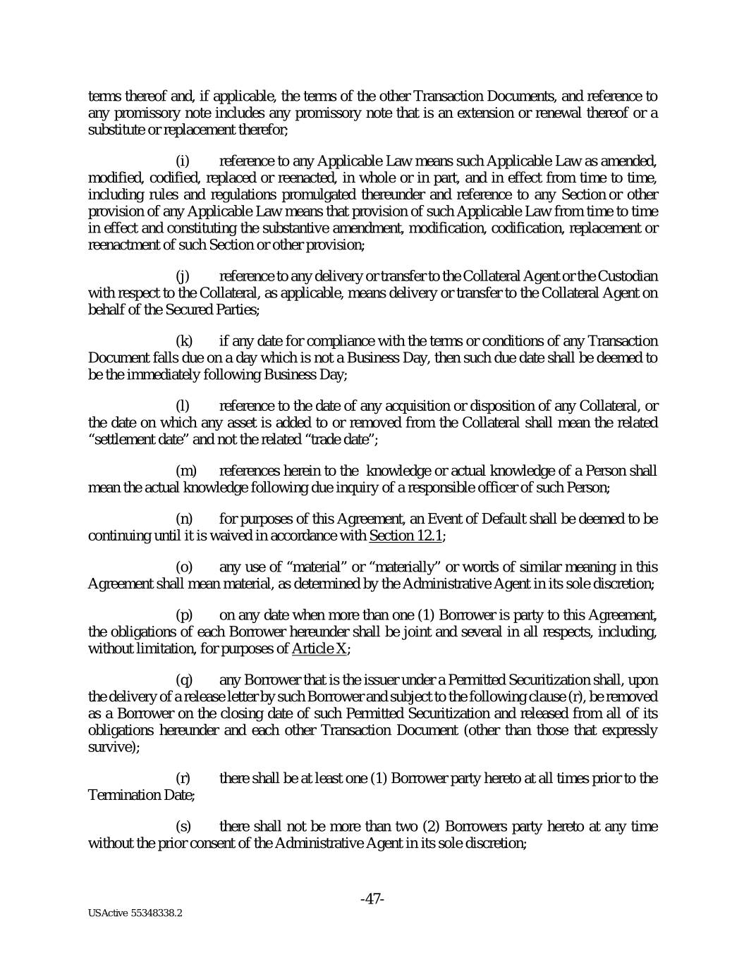 terms thereof and, if applicable, the terms of the other Transaction Documents, and reference to any promissory note includes any promissory note that is an extension or renewal thereof or a substitute or replacement therefor; (i) reference to any Applicable Law means such Applicable Law as amended, modified, codified, replaced or reenacted, in whole or in part, and in effect from time to time, including rules and regulations promulgated thereunder and reference to any Section or other provision of any Applicable Law means that provision of such Applicable Law from time to time in effect and constituting the substantive amendment, modification, codification, replacement or reenactment of such Section or other provision; (j) reference to any delivery or transfer to the Collateral Agent or the Custodian with respect to the Collateral, as applicable, means delivery or transfer to the Collateral Agent on behalf of the Secured Parties; (k) if any date for compliance with the terms or conditions of any Transaction Document falls due on a day which is not a Business Day, then such due date shall be deemed to be the immediately following Business Day; (l) reference to the date of any acquisition or disposition of any Collateral, or the date on which any asset is added to or removed from the Collateral shall mean the related “settlement date” and not the related “trade date”; (m) references herein to the knowledge or actual knowledge of a Person shall mean the actual knowledge following due inquiry of a responsible officer of such Person; (n) for purposes of this Agreement, an Event of Default shall be deemed to be continuing until it is waived in accordance with Section 12.1; (o) any use of “material” or “materially” or words of similar meaning in this Agreement shall mean material, as determined by the Administrative Agent in its sole discretion; (p) on any date when more than one (1) Borrower is party to this Agreement, the obligations of each Borrower hereunder shall be joint and several in all respects, including, without limitation, for purposes of Article X; (q) any Borrower that is the issuer under a Permitted Securitization shall, upon the delivery of a release letter by such Borrower and subject to the following clause (r), be removed as a Borrower on the closing date of such Permitted Securitization and released from all of its obligations hereunder and each other Transaction Document (other than those that expressly survive); (r) there shall be at least one (1) Borrower party hereto at all times prior to the Termination Date; (s) there shall not be more than two (2) Borrowers party hereto at any time without the prior consent of the Administrative Agent in its sole discretion; -47- USActive 55348338.2