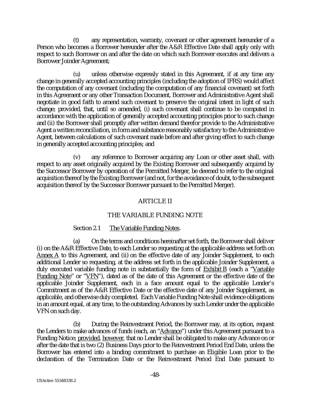(t) any representation, warranty, covenant or other agreement hereunder of a Person who becomes a Borrower hereunder after the A&R Effective Date shall apply only with respect to such Borrower on and after the date on which such Borrower executes and delivers a Borrower Joinder Agreement; (u) unless otherwise expressly stated in this Agreement, if at any time any change in generally accepted accounting principles (including the adoption of IFRS) would affect the computation of any covenant (including the computation of any financial covenant) set forth in this Agreement or any other Transaction Document, Borrower and Administrative Agent shall negotiate in good faith to amend such covenant to preserve the original intent in light of such change; provided, that, until so amended, (i) such covenant shall continue to be computed in accordance with the application of generally accepted accounting principles prior to such change and (ii) the Borrower shall promptly after written demand therefor provide to the Administrative Agent a written reconciliation, in form and substance reasonably satisfactory to the Administrative Agent, between calculations of such covenant made before and after giving effect to such change in generally accepted accounting principles; and (v) any reference to Borrower acquiring any Loan or other asset shall, with respect to any asset originally acquired by the Existing Borrower and subsequently acquired by the Successor Borrower by operation of the Permitted Merger, be deemed to refer to the original acquisition thereof by the Existing Borrower (and not, for the avoidance of doubt, to the subsequent acquisition thereof by the Successor Borrower pursuant to the Permitted Merger). ARTICLE II THE VARIABLE FUNDING NOTE Section 2.1 The Variable Funding Notes. (a) On the terms and conditions hereinafter set forth, the Borrower shall deliver (i) on the A&R Effective Date, to each Lender so requesting at the applicable address set forth on Annex A to this Agreement, and (ii) on the effective date of any Joinder Supplement, to each additional Lender so requesting, at the address set forth in the applicable Joinder Supplement, a duly executed variable funding note in substantially the form of Exhibit B (each a “Variable Funding Note” or “VFN”), dated as of the date of this Agreement or the effective date of the applicable Joinder Supplement, each in a face amount equal to the applicable Lender’s Commitment as of the A&R Effective Date or the effective date of any Joinder Supplement, as applicable, and otherwise duly completed. Each Variable Funding Note shall evidence obligations in an amount equal, at any time, to the outstanding Advances by such Lender under the applicable VFN on such day. (b) During the Reinvestment Period, the Borrower may, at its option, request the Lenders to make advances of funds (each, an “Advance”) under this Agreement pursuant to a Funding Notice; provided, however, that no Lender shall be obligated to make any Advance on or after the date that is two (2) Business Days prior to the Reinvestment Period End Date, unless the Borrower has entered into a binding commitment to purchase an Eligible Loan prior to the declaration of the Termination Date or the Reinvestment Period End Date pursuant to -48- USActive 55348338.2