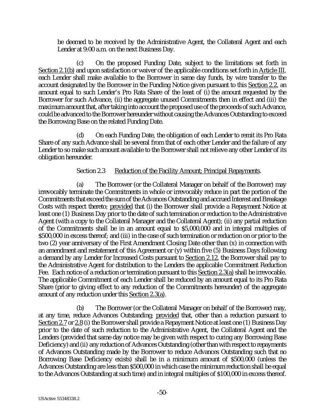 be deemed to be received by the Administrative Agent, the Collateral Agent and each Lender at 9:00 a.m. on the next Business Day. (c) On the proposed Funding Date, subject to the limitations set forth in Section 2.1(b) and upon satisfaction or waiver of the applicable conditions set forth in Article III, each Lender shall make available to the Borrower in same day funds, by wire transfer to the account designated by the Borrower in the Funding Notice given pursuant to this Section 2.2, an amount equal to such Lender’s Pro Rata Share of the least of (i) the amount requested by the Borrower for such Advance, (ii) the aggregate unused Commitments then in effect and (iii) the maximum amount that, after taking into account the proposed use of the proceeds of such Advance, could be advanced to the Borrower hereunder without causing the Advances Outstanding to exceed the Borrowing Base on the related Funding Date. (d) On each Funding Date, the obligation of each Lender to remit its Pro Rata Share of any such Advance shall be several from that of each other Lender and the failure of any Lender to so make such amount available to the Borrower shall not relieve any other Lender of its obligation hereunder. Section 2.3 Reduction of the Facility Amount; Principal Repayments. (a) The Borrower (or the Collateral Manager on behalf of the Borrower) may irrevocably terminate the Commitments in whole or irrevocably reduce in part the portion of the Commitments that exceed the sum of the Advances Outstanding and accrued Interest and Breakage Costs with respect thereto; provided that (i) the Borrower shall provide a Repayment Notice at least one (1) Business Day prior to the date of such termination or reduction to the Administrative Agent (with a copy to the Collateral Manager and the Collateral Agent); (ii) any partial reduction of the Commitments shall be in an amount equal to $5,000,000 and in integral multiples of $500,000 in excess thereof; and (iii) in the case of such termination or reduction on or prior to the two (2) year anniversary of the First Amendment Closing Date other than (x) in connection with an amendment and restatement of this Agreement or (y) within five (5) Business Days following a demand by any Lender for Increased Costs pursuant to Section 2.12, the Borrower shall pay to the Administrative Agent for distribution to the Lenders the applicable Commitment Reduction Fee. Each notice of a reduction or termination pursuant to this Section 2.3(a) shall be irrevocable. The applicable Commitment of each Lender shall be reduced by an amount equal to its Pro Rata Share (prior to giving effect to any reduction of the Commitments hereunder) of the aggregate amount of any reduction under this Section 2.3(a). (b) The Borrower (or the Collateral Manager on behalf of the Borrower) may, at any time, reduce Advances Outstanding; provided that, other than a reduction pursuant to Section 2.7 or 2.8 (i) the Borrower shall provide a Repayment Notice at least one (1) Business Day prior to the date of such reduction to the Administrative Agent, the Collateral Agent and the Lenders (provided that same day notice may be given with respect to curing any Borrowing Base Deficiency) and (ii) any reduction of Advances Outstanding (other than with respect to repayments of Advances Outstanding made by the Borrower to reduce Advances Outstanding such that no Borrowing Base Deficiency exists) shall be in a minimum amount of $500,000 (unless the Advances Outstanding are less than $500,000 in which case the minimum reduction shall be equal to the Advances Outstanding at such time) and in integral multiples of $100,000 in excess thereof. -50- USActive 55348338.2