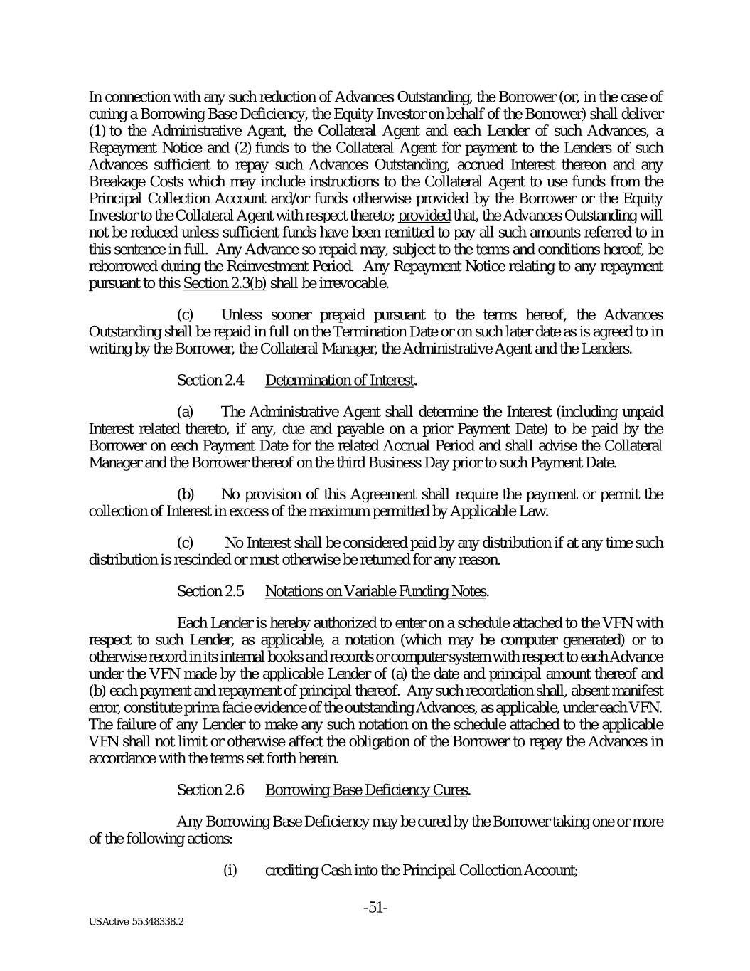 In connection with any such reduction of Advances Outstanding, the Borrower (or, in the case of curing a Borrowing Base Deficiency, the Equity Investor on behalf of the Borrower) shall deliver (1) to the Administrative Agent, the Collateral Agent and each Lender of such Advances, a Repayment Notice and (2) funds to the Collateral Agent for payment to the Lenders of such Advances sufficient to repay such Advances Outstanding, accrued Interest thereon and any Breakage Costs which may include instructions to the Collateral Agent to use funds from the Principal Collection Account and/or funds otherwise provided by the Borrower or the Equity Investor to the Collateral Agent with respect thereto; provided that, the Advances Outstanding will not be reduced unless sufficient funds have been remitted to pay all such amounts referred to in this sentence in full. Any Advance so repaid may, subject to the terms and conditions hereof, be reborrowed during the Reinvestment Period. Any Repayment Notice relating to any repayment pursuant to this Section 2.3(b) shall be irrevocable. (c) Unless sooner prepaid pursuant to the terms hereof, the Advances Outstanding shall be repaid in full on the Termination Date or on such later date as is agreed to in writing by the Borrower, the Collateral Manager, the Administrative Agent and the Lenders. Section 2.4 Determination of Interest. (a) The Administrative Agent shall determine the Interest (including unpaid Interest related thereto, if any, due and payable on a prior Payment Date) to be paid by the Borrower on each Payment Date for the related Accrual Period and shall advise the Collateral Manager and the Borrower thereof on the third Business Day prior to such Payment Date. (b) No provision of this Agreement shall require the payment or permit the collection of Interest in excess of the maximum permitted by Applicable Law. (c) No Interest shall be considered paid by any distribution if at any time such distribution is rescinded or must otherwise be returned for any reason. Section 2.5 Notations on Variable Funding Notes. Each Lender is hereby authorized to enter on a schedule attached to the VFN with respect to such Lender, as applicable, a notation (which may be computer generated) or to otherwise record in its internal books and records or computer system with respect to each Advance under the VFN made by the applicable Lender of (a) the date and principal amount thereof and (b) each payment and repayment of principal thereof. Any such recordation shall, absent manifest error, constitute prima facie evidence of the outstanding Advances, as applicable, under each VFN. The failure of any Lender to make any such notation on the schedule attached to the applicable VFN shall not limit or otherwise affect the obligation of the Borrower to repay the Advances in accordance with the terms set forth herein. Section 2.6 Borrowing Base Deficiency Cures. Any Borrowing Base Deficiency may be cured by the Borrower taking one or more of the following actions: (i) crediting Cash into the Principal Collection Account; -51- USActive 55348338.2