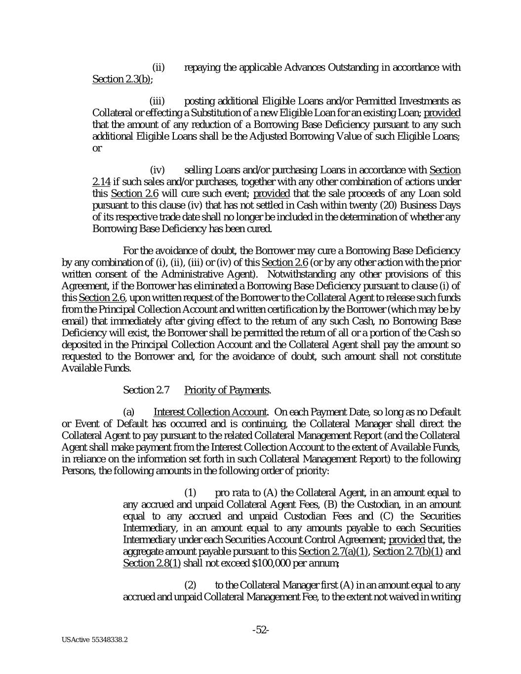 (ii) repaying the applicable Advances Outstanding in accordance with Section 2.3(b); (iii) posting additional Eligible Loans and/or Permitted Investments as Collateral or effecting a Substitution of a new Eligible Loan for an existing Loan; provided that the amount of any reduction of a Borrowing Base Deficiency pursuant to any such additional Eligible Loans shall be the Adjusted Borrowing Value of such Eligible Loans; or (iv) selling Loans and/or purchasing Loans in accordance with Section 2.14 if such sales and/or purchases, together with any other combination of actions under this Section 2.6 will cure such event; provided that the sale proceeds of any Loan sold pursuant to this clause (iv) that has not settled in Cash within twenty (20) Business Days of its respective trade date shall no longer be included in the determination of whether any Borrowing Base Deficiency has been cured. For the avoidance of doubt, the Borrower may cure a Borrowing Base Deficiency by any combination of (i), (ii), (iii) or (iv) of this Section 2.6 (or by any other action with the prior written consent of the Administrative Agent). Notwithstanding any other provisions of this Agreement, if the Borrower has eliminated a Borrowing Base Deficiency pursuant to clause (i) of this Section 2.6, upon written request of the Borrower to the Collateral Agent to release such funds from the Principal Collection Account and written certification by the Borrower (which may be by email) that immediately after giving effect to the return of any such Cash, no Borrowing Base Deficiency will exist, the Borrower shall be permitted the return of all or a portion of the Cash so deposited in the Principal Collection Account and the Collateral Agent shall pay the amount so requested to the Borrower and, for the avoidance of doubt, such amount shall not constitute Available Funds. Section 2.7 Priority of Payments. (a) Interest Collection Account. On each Payment Date, so long as no Default or Event of Default has occurred and is continuing, the Collateral Manager shall direct the Collateral Agent to pay pursuant to the related Collateral Management Report (and the Collateral Agent shall make payment from the Interest Collection Account to the extent of Available Funds, in reliance on the information set forth in such Collateral Management Report) to the following Persons, the following amounts in the following order of priority: (1) pro rata to (A) the Collateral Agent, in an amount equal to any accrued and unpaid Collateral Agent Fees, (B) the Custodian, in an amount equal to any accrued and unpaid Custodian Fees and (C) the Securities Intermediary, in an amount equal to any amounts payable to each Securities Intermediary under each Securities Account Control Agreement; provided that, the aggregate amount payable pursuant to this Section 2.7(a)(1), Section 2.7(b)(1) and Section 2.8(1) shall not exceed $100,000 per annum; (2) to the Collateral Manager first (A) in an amount equal to any accrued and unpaid Collateral Management Fee, to the extent not waived in writing -52- USActive 55348338.2