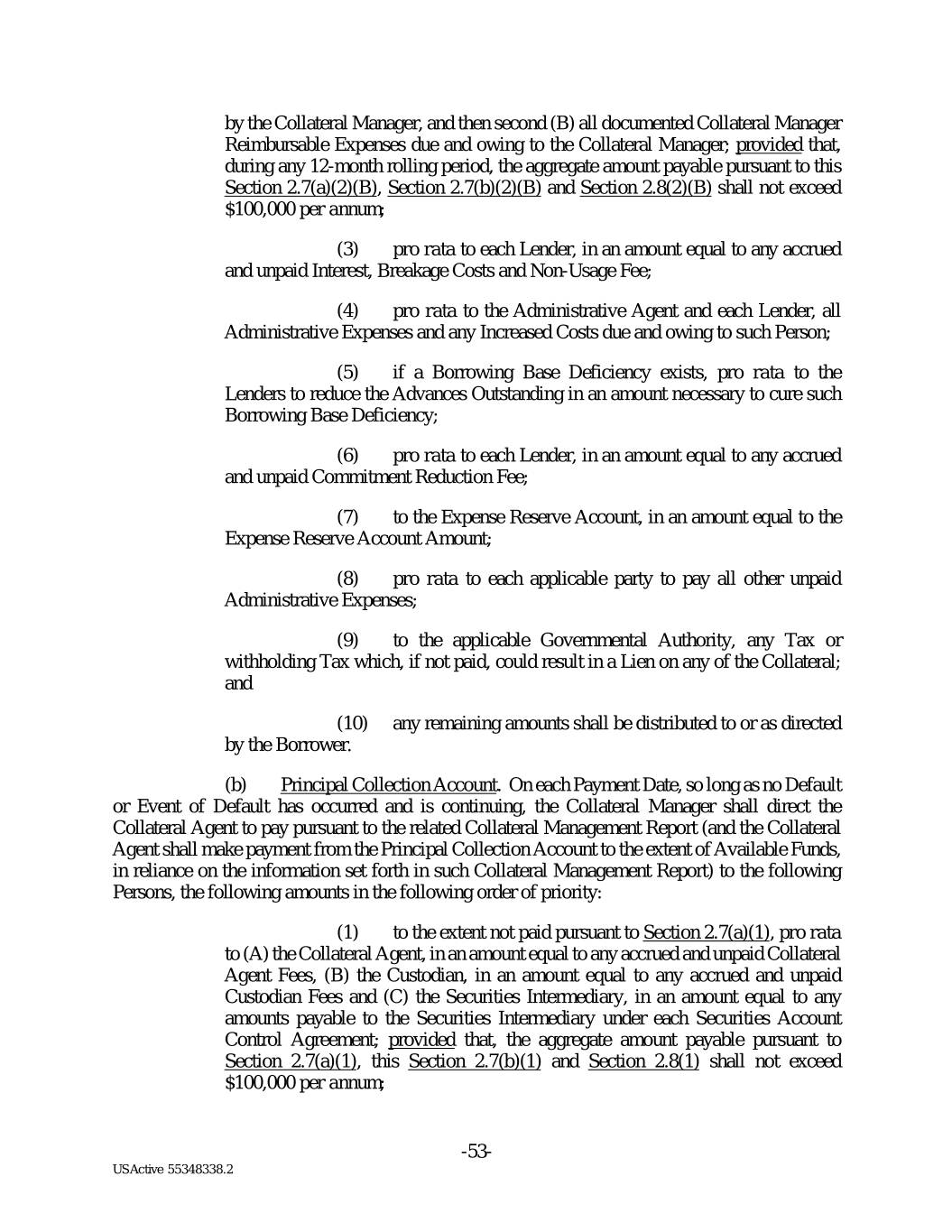 by the Collateral Manager, and then second (B) all documented Collateral Manager Reimbursable Expenses due and owing to the Collateral Manager; provided that, during any 12-month rolling period, the aggregate amount payable pursuant to this Section 2.7(a)(2)(B), Section 2.7(b)(2)(B) and Section 2.8(2)(B) shall not exceed $100,000 per annum; (3) pro rata to each Lender, in an amount equal to any accrued and unpaid Interest, Breakage Costs and Non-Usage Fee; (4) pro rata to the Administrative Agent and each Lender, all Administrative Expenses and any Increased Costs due and owing to such Person; (5) if a Borrowing Base Deficiency exists, pro rata to the Lenders to reduce the Advances Outstanding in an amount necessary to cure such Borrowing Base Deficiency; (6) pro rata to each Lender, in an amount equal to any accrued and unpaid Commitment Reduction Fee; (7) to the Expense Reserve Account, in an amount equal to the Expense Reserve Account Amount; (8) pro rata to each applicable party to pay all other unpaid Administrative Expenses; (9) to the applicable Governmental Authority, any Tax or withholding Tax which, if not paid, could result in a Lien on any of the Collateral; and (10) any remaining amounts shall be distributed to or as directed by the Borrower. (b) Principal Collection Account. On each Payment Date, so long as no Default or Event of Default has occurred and is continuing, the Collateral Manager shall direct the Collateral Agent to pay pursuant to the related Collateral Management Report (and the Collateral Agent shall make payment from the Principal Collection Account to the extent of Available Funds, in reliance on the information set forth in such Collateral Management Report) to the following Persons, the following amounts in the following order of priority: (1) to the extent not paid pursuant to Section 2.7(a)(1), pro rata to (A) the Collateral Agent, in an amount equal to any accrued and unpaid Collateral Agent Fees, (B) the Custodian, in an amount equal to any accrued and unpaid Custodian Fees and (C) the Securities Intermediary, in an amount equal to any amounts payable to the Securities Intermediary under each Securities Account Control Agreement; provided that, the aggregate amount payable pursuant to Section 2.7(a)(1), this Section 2.7(b)(1) and Section 2.8(1) shall not exceed $100,000 per annum; -53- USActive 55348338.2