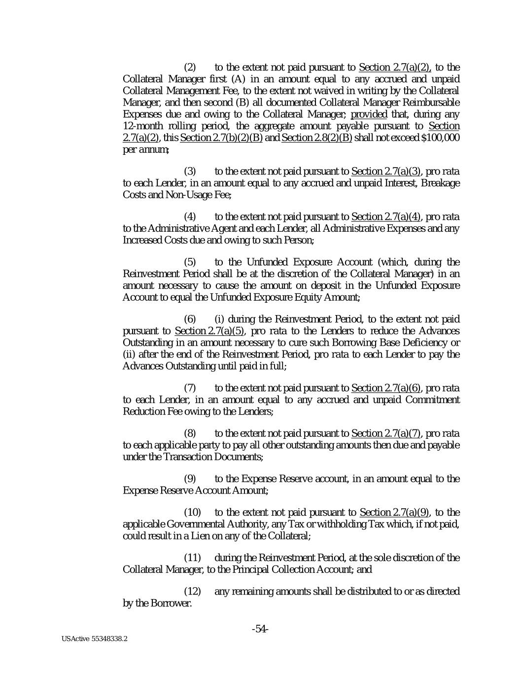 (2) to the extent not paid pursuant to Section 2.7(a)(2), to the Collateral Manager first (A) in an amount equal to any accrued and unpaid Collateral Management Fee, to the extent not waived in writing by the Collateral Manager, and then second (B) all documented Collateral Manager Reimbursable Expenses due and owing to the Collateral Manager; provided that, during any 12-month rolling period, the aggregate amount payable pursuant to Section 2.7(a)(2), this Section 2.7(b)(2)(B) and Section 2.8(2)(B) shall not exceed $100,000 per annum; (3) to the extent not paid pursuant to Section 2.7(a)(3), pro rata to each Lender, in an amount equal to any accrued and unpaid Interest, Breakage Costs and Non-Usage Fee; (4) to the extent not paid pursuant to Section 2.7(a)(4), pro rata to the Administrative Agent and each Lender, all Administrative Expenses and any Increased Costs due and owing to such Person; (5) to the Unfunded Exposure Account (which, during the Reinvestment Period shall be at the discretion of the Collateral Manager) in an amount necessary to cause the amount on deposit in the Unfunded Exposure Account to equal the Unfunded Exposure Equity Amount; (6) (i) during the Reinvestment Period, to the extent not paid pursuant to Section 2.7(a)(5), pro rata to the Lenders to reduce the Advances Outstanding in an amount necessary to cure such Borrowing Base Deficiency or (ii) after the end of the Reinvestment Period, pro rata to each Lender to pay the Advances Outstanding until paid in full; (7) to the extent not paid pursuant to Section 2.7(a)(6), pro rata to each Lender, in an amount equal to any accrued and unpaid Commitment Reduction Fee owing to the Lenders; (8) to the extent not paid pursuant to Section 2.7(a)(7), pro rata to each applicable party to pay all other outstanding amounts then due and payable under the Transaction Documents; (9) to the Expense Reserve account, in an amount equal to the Expense Reserve Account Amount; (10) to the extent not paid pursuant to Section 2.7(a)(9), to the applicable Governmental Authority, any Tax or withholding Tax which, if not paid, could result in a Lien on any of the Collateral; (11) during the Reinvestment Period, at the sole discretion of the Collateral Manager, to the Principal Collection Account; and (12) any remaining amounts shall be distributed to or as directed by the Borrower. -54- USActive 55348338.2