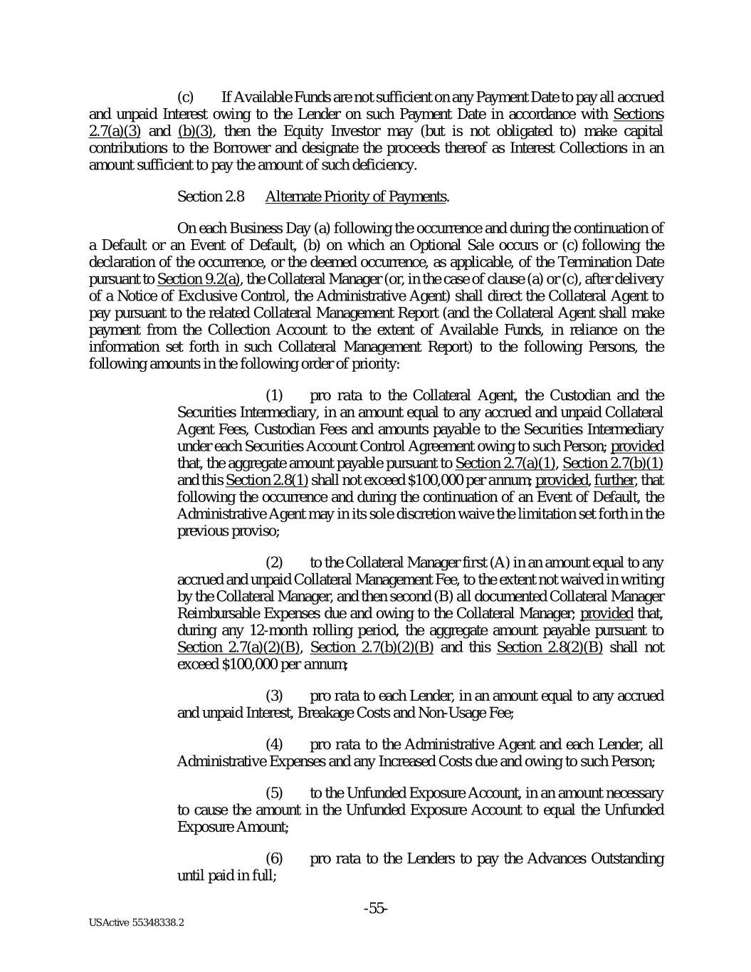 (c) If Available Funds are not sufficient on any Payment Date to pay all accrued and unpaid Interest owing to the Lender on such Payment Date in accordance with Sections 2.7(a)(3) and (b)(3), then the Equity Investor may (but is not obligated to) make capital contributions to the Borrower and designate the proceeds thereof as Interest Collections in an amount sufficient to pay the amount of such deficiency. Section 2.8 Alternate Priority of Payments. On each Business Day (a) following the occurrence and during the continuation of a Default or an Event of Default, (b) on which an Optional Sale occurs or (c) following the declaration of the occurrence, or the deemed occurrence, as applicable, of the Termination Date pursuant to Section 9.2(a), the Collateral Manager (or, in the case of clause (a) or (c), after delivery of a Notice of Exclusive Control, the Administrative Agent) shall direct the Collateral Agent to pay pursuant to the related Collateral Management Report (and the Collateral Agent shall make payment from the Collection Account to the extent of Available Funds, in reliance on the information set forth in such Collateral Management Report) to the following Persons, the following amounts in the following order of priority: (1) pro rata to the Collateral Agent, the Custodian and the Securities Intermediary, in an amount equal to any accrued and unpaid Collateral Agent Fees, Custodian Fees and amounts payable to the Securities Intermediary under each Securities Account Control Agreement owing to such Person; provided that, the aggregate amount payable pursuant to Section 2.7(a)(1), Section 2.7(b)(1) and this Section 2.8(1) shall not exceed $100,000 per annum; provided, further, that following the occurrence and during the continuation of an Event of Default, the Administrative Agent may in its sole discretion waive the limitation set forth in the previous proviso; (2) to the Collateral Manager first (A) in an amount equal to any accrued and unpaid Collateral Management Fee, to the extent not waived in writing by the Collateral Manager, and then second (B) all documented Collateral Manager Reimbursable Expenses due and owing to the Collateral Manager; provided that, during any 12-month rolling period, the aggregate amount payable pursuant to Section 2.7(a)(2)(B), Section 2.7(b)(2)(B) and this Section 2.8(2)(B) shall not exceed $100,000 per annum; (3) pro rata to each Lender, in an amount equal to any accrued and unpaid Interest, Breakage Costs and Non-Usage Fee; (4) pro rata to the Administrative Agent and each Lender, all Administrative Expenses and any Increased Costs due and owing to such Person; (5) to the Unfunded Exposure Account, in an amount necessary to cause the amount in the Unfunded Exposure Account to equal the Unfunded Exposure Amount; (6) pro rata to the Lenders to pay the Advances Outstanding until paid in full; -55- USActive 55348338.2