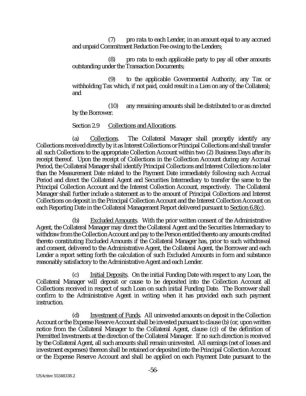 (7) pro rata to each Lender, in an amount equal to any accrued and unpaid Commitment Reduction Fee owing to the Lenders; (8) pro rata to each applicable party to pay all other amounts outstanding under the Transaction Documents; (9) to the applicable Governmental Authority, any Tax or withholding Tax which, if not paid, could result in a Lien on any of the Collateral; and (10) any remaining amounts shall be distributed to or as directed by the Borrower. Section 2.9 Collections and Allocations. (a) Collections. The Collateral Manager shall promptly identify any Collections received directly by it as Interest Collections or Principal Collections and shall transfer all such Collections to the appropriate Collection Account within two (2) Business Days after its receipt thereof. Upon the receipt of Collections in the Collection Account during any Accrual Period, the Collateral Manager shall identify Principal Collections and Interest Collections no later than the Measurement Date related to the Payment Date immediately following such Accrual Period and direct the Collateral Agent and Securities Intermediary to transfer the same to the Principal Collection Account and the Interest Collection Account, respectively. The Collateral Manager shall further include a statement as to the amount of Principal Collections and Interest Collections on deposit in the Principal Collection Account and the Interest Collection Account on each Reporting Date in the Collateral Management Report delivered pursuant to Section 6.8(c). (b) Excluded Amounts. With the prior written consent of the Administrative Agent, the Collateral Manager may direct the Collateral Agent and the Securities Intermediary to withdraw from the Collection Account and pay to the Person entitled thereto any amounts credited thereto constituting Excluded Amounts if the Collateral Manager has, prior to such withdrawal and consent, delivered to the Administrative Agent, the Collateral Agent, the Borrower and each Lender a report setting forth the calculation of such Excluded Amounts in form and substance reasonably satisfactory to the Administrative Agent and each Lender. (c) Initial Deposits. On the initial Funding Date with respect to any Loan, the Collateral Manager will deposit or cause to be deposited into the Collection Account all Collections received in respect of such Loan on such initial Funding Date. The Borrower shall confirm to the Administrative Agent in writing when it has provided each such payment instruction. (d) Investment of Funds. All uninvested amounts on deposit in the Collection Account or the Expense Reserve Account shall be invested pursuant to clause (b) (or, upon written notice from the Collateral Manager to the Collateral Agent, clause (c)) of the definition of Permitted Investments at the direction of the Collateral Manager. If no such direction is received by the Collateral Agent, all such amounts shall remain uninvested. All earnings (net of losses and investment expenses) thereon shall be retained or deposited into the Principal Collection Account or the Expense Reserve Account and shall be applied on each Payment Date pursuant to the -56- USActive 55348338.2