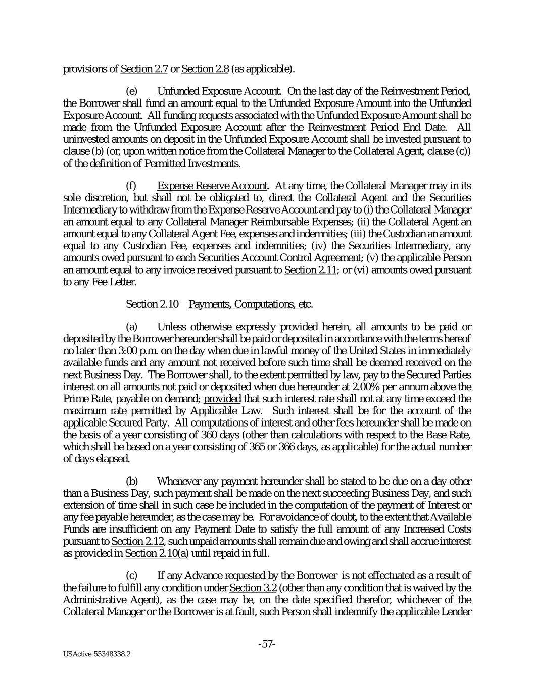 provisions of Section 2.7 or Section 2.8 (as applicable). (e) Unfunded Exposure Account. On the last day of the Reinvestment Period, the Borrower shall fund an amount equal to the Unfunded Exposure Amount into the Unfunded Exposure Account. All funding requests associated with the Unfunded Exposure Amount shall be made from the Unfunded Exposure Account after the Reinvestment Period End Date. All uninvested amounts on deposit in the Unfunded Exposure Account shall be invested pursuant to clause (b) (or, upon written notice from the Collateral Manager to the Collateral Agent, clause (c)) of the definition of Permitted Investments. (f) Expense Reserve Account. At any time, the Collateral Manager may in its sole discretion, but shall not be obligated to, direct the Collateral Agent and the Securities Intermediary to withdraw from the Expense Reserve Account and pay to (i) the Collateral Manager an amount equal to any Collateral Manager Reimbursable Expenses; (ii) the Collateral Agent an amount equal to any Collateral Agent Fee, expenses and indemnities; (iii) the Custodian an amount equal to any Custodian Fee, expenses and indemnities; (iv) the Securities Intermediary, any amounts owed pursuant to each Securities Account Control Agreement; (v) the applicable Person an amount equal to any invoice received pursuant to Section 2.11; or (vi) amounts owed pursuant to any Fee Letter. Section 2.10 Payments, Computations, etc. (a) Unless otherwise expressly provided herein, all amounts to be paid or deposited by the Borrower hereunder shall be paid or deposited in accordance with the terms hereof no later than 3:00 p.m. on the day when due in lawful money of the United States in immediately available funds and any amount not received before such time shall be deemed received on the next Business Day. The Borrower shall, to the extent permitted by law, pay to the Secured Parties interest on all amounts not paid or deposited when due hereunder at 2.00% per annum above the Prime Rate, payable on demand; provided that such interest rate shall not at any time exceed the maximum rate permitted by Applicable Law. Such interest shall be for the account of the applicable Secured Party. All computations of interest and other fees hereunder shall be made on the basis of a year consisting of 360 days (other than calculations with respect to the Base Rate, which shall be based on a year consisting of 365 or 366 days, as applicable) for the actual number of days elapsed. (b) Whenever any payment hereunder shall be stated to be due on a day other than a Business Day, such payment shall be made on the next succeeding Business Day, and such extension of time shall in such case be included in the computation of the payment of Interest or any fee payable hereunder, as the case may be. For avoidance of doubt, to the extent that Available Funds are insufficient on any Payment Date to satisfy the full amount of any Increased Costs pursuant to Section 2.12, such unpaid amounts shall remain due and owing and shall accrue interest as provided in Section 2.10(a) until repaid in full. (c) If any Advance requested by the Borrower is not effectuated as a result of the failure to fulfill any condition under Section 3.2 (other than any condition that is waived by the Administrative Agent), as the case may be, on the date specified therefor, whichever of the Collateral Manager or the Borrower is at fault, such Person shall indemnify the applicable Lender -57- USActive 55348338.2