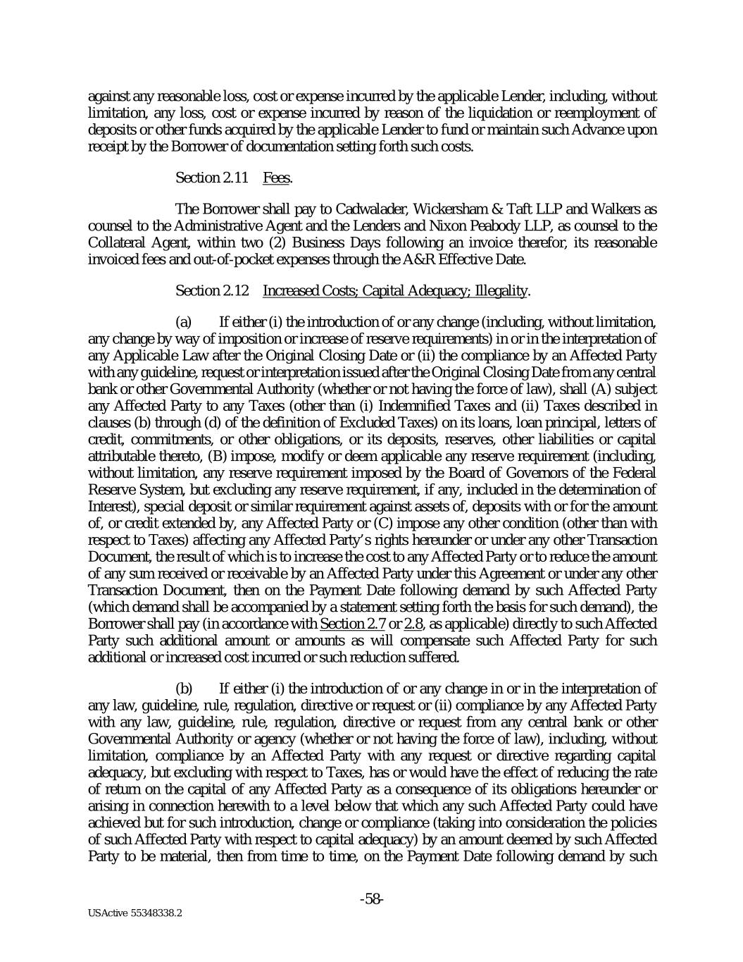 against any reasonable loss, cost or expense incurred by the applicable Lender, including, without limitation, any loss, cost or expense incurred by reason of the liquidation or reemployment of deposits or other funds acquired by the applicable Lender to fund or maintain such Advance upon receipt by the Borrower of documentation setting forth such costs. Section 2.11 Fees. The Borrower shall pay to Cadwalader, Wickersham & Taft LLP and Walkers as counsel to the Administrative Agent and the Lenders and Nixon Peabody LLP, as counsel to the Collateral Agent, within two (2) Business Days following an invoice therefor, its reasonable invoiced fees and out-of-pocket expenses through the A&R Effective Date. Section 2.12 Increased Costs; Capital Adequacy; Illegality. (a) If either (i) the introduction of or any change (including, without limitation, any change by way of imposition or increase of reserve requirements) in or in the interpretation of any Applicable Law after the Original Closing Date or (ii) the compliance by an Affected Party with any guideline, request or interpretation issued after the Original Closing Date from any central bank or other Governmental Authority (whether or not having the force of law), shall (A) subject any Affected Party to any Taxes (other than (i) Indemnified Taxes and (ii) Taxes described in clauses (b) through (d) of the definition of Excluded Taxes) on its loans, loan principal, letters of credit, commitments, or other obligations, or its deposits, reserves, other liabilities or capital attributable thereto, (B) impose, modify or deem applicable any reserve requirement (including, without limitation, any reserve requirement imposed by the Board of Governors of the Federal Reserve System, but excluding any reserve requirement, if any, included in the determination of Interest), special deposit or similar requirement against assets of, deposits with or for the amount of, or credit extended by, any Affected Party or (C) impose any other condition (other than with respect to Taxes) affecting any Affected Party’s rights hereunder or under any other Transaction Document, the result of which is to increase the cost to any Affected Party or to reduce the amount of any sum received or receivable by an Affected Party under this Agreement or under any other Transaction Document, then on the Payment Date following demand by such Affected Party (which demand shall be accompanied by a statement setting forth the basis for such demand), the Borrower shall pay (in accordance with Section 2.7 or 2.8, as applicable) directly to such Affected Party such additional amount or amounts as will compensate such Affected Party for such additional or increased cost incurred or such reduction suffered. (b) If either (i) the introduction of or any change in or in the interpretation of any law, guideline, rule, regulation, directive or request or (ii) compliance by any Affected Party with any law, guideline, rule, regulation, directive or request from any central bank or other Governmental Authority or agency (whether or not having the force of law), including, without limitation, compliance by an Affected Party with any request or directive regarding capital adequacy, but excluding with respect to Taxes, has or would have the effect of reducing the rate of return on the capital of any Affected Party as a consequence of its obligations hereunder or arising in connection herewith to a level below that which any such Affected Party could have achieved but for such introduction, change or compliance (taking into consideration the policies of such Affected Party with respect to capital adequacy) by an amount deemed by such Affected Party to be material, then from time to time, on the Payment Date following demand by such -58- USActive 55348338.2