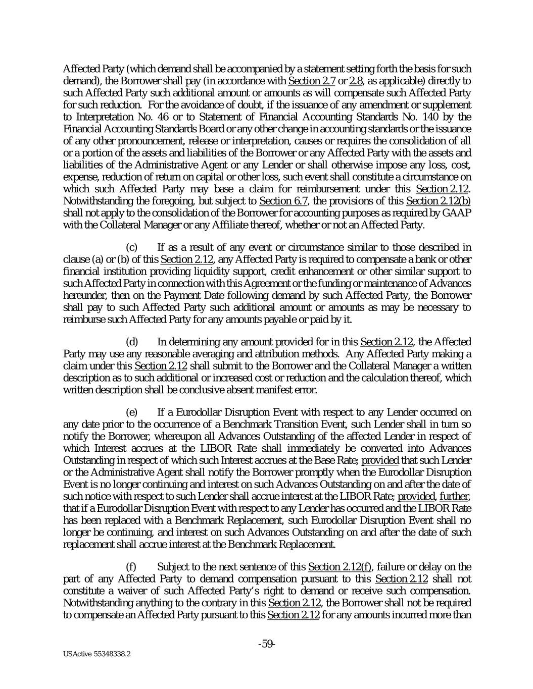 Affected Party (which demand shall be accompanied by a statement setting forth the basis for such demand), the Borrower shall pay (in accordance with Section 2.7 or 2.8, as applicable) directly to such Affected Party such additional amount or amounts as will compensate such Affected Party for such reduction. For the avoidance of doubt, if the issuance of any amendment or supplement to Interpretation No. 46 or to Statement of Financial Accounting Standards No. 140 by the Financial Accounting Standards Board or any other change in accounting standards or the issuance of any other pronouncement, release or interpretation, causes or requires the consolidation of all or a portion of the assets and liabilities of the Borrower or any Affected Party with the assets and liabilities of the Administrative Agent or any Lender or shall otherwise impose any loss, cost, expense, reduction of return on capital or other loss, such event shall constitute a circumstance on which such Affected Party may base a claim for reimbursement under this Section 2.12. Notwithstanding the foregoing, but subject to Section 6.7, the provisions of this Section 2.12(b) shall not apply to the consolidation of the Borrower for accounting purposes as required by GAAP with the Collateral Manager or any Affiliate thereof, whether or not an Affected Party. (c) If as a result of any event or circumstance similar to those described in clause (a) or (b) of this Section 2.12, any Affected Party is required to compensate a bank or other financial institution providing liquidity support, credit enhancement or other similar support to such Affected Party in connection with this Agreement or the funding or maintenance of Advances hereunder, then on the Payment Date following demand by such Affected Party, the Borrower shall pay to such Affected Party such additional amount or amounts as may be necessary to reimburse such Affected Party for any amounts payable or paid by it. (d) In determining any amount provided for in this Section 2.12, the Affected Party may use any reasonable averaging and attribution methods. Any Affected Party making a claim under this Section 2.12 shall submit to the Borrower and the Collateral Manager a written description as to such additional or increased cost or reduction and the calculation thereof, which written description shall be conclusive absent manifest error. (e) If a Eurodollar Disruption Event with respect to any Lender occurred on any date prior to the occurrence of a Benchmark Transition Event, such Lender shall in turn so notify the Borrower, whereupon all Advances Outstanding of the affected Lender in respect of which Interest accrues at the LIBOR Rate shall immediately be converted into Advances Outstanding in respect of which such Interest accrues at the Base Rate; provided that such Lender or the Administrative Agent shall notify the Borrower promptly when the Eurodollar Disruption Event is no longer continuing and interest on such Advances Outstanding on and after the date of such notice with respect to such Lender shall accrue interest at the LIBOR Rate; provided, further, that if a Eurodollar Disruption Event with respect to any Lender has occurred and the LIBOR Rate has been replaced with a Benchmark Replacement, such Eurodollar Disruption Event shall no longer be continuing, and interest on such Advances Outstanding on and after the date of such replacement shall accrue interest at the Benchmark Replacement. (f) Subject to the next sentence of this Section 2.12(f), failure or delay on the part of any Affected Party to demand compensation pursuant to this Section 2.12 shall not constitute a waiver of such Affected Party’s right to demand or receive such compensation. Notwithstanding anything to the contrary in this Section 2.12, the Borrower shall not be required to compensate an Affected Party pursuant to this Section 2.12 for any amounts incurred more than -59- USActive 55348338.2