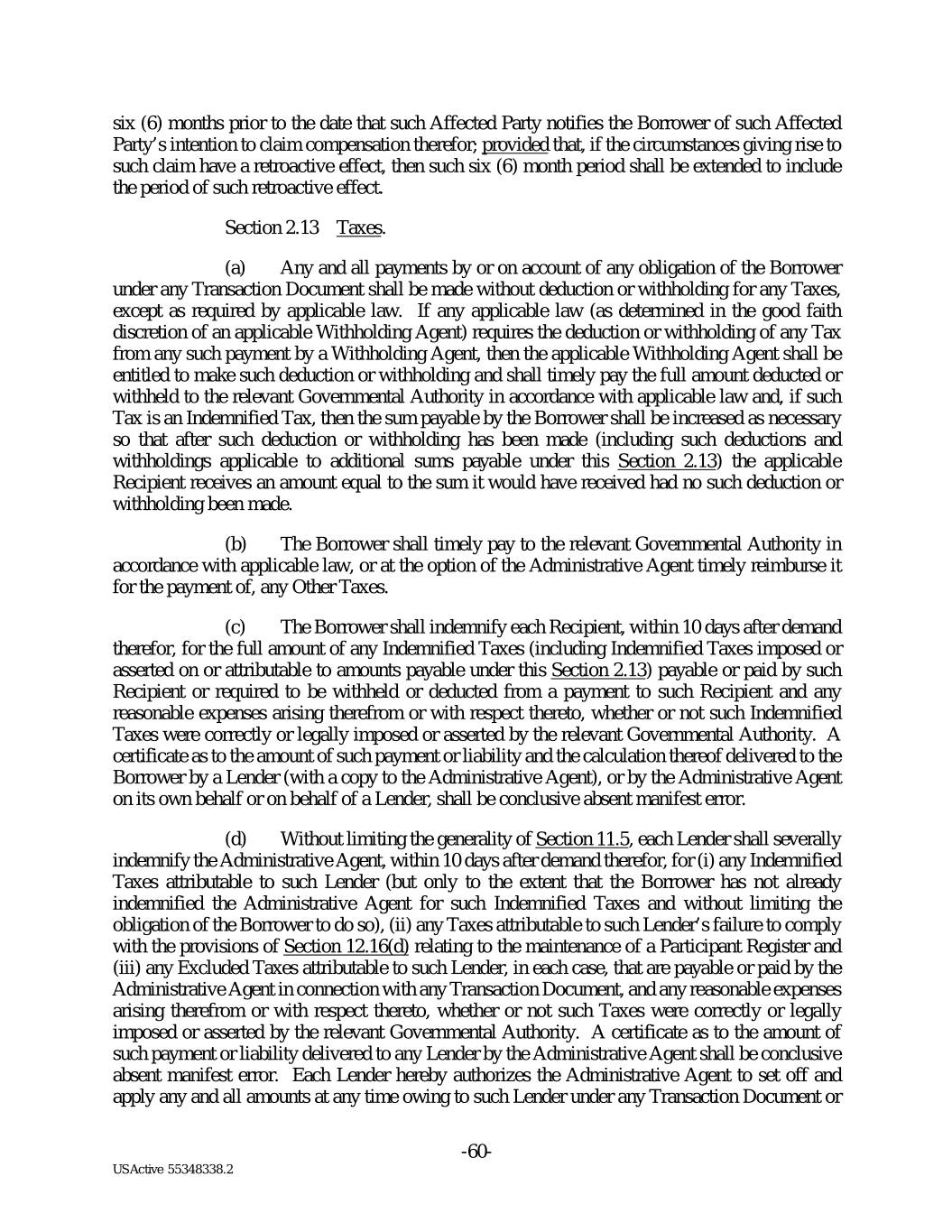 six (6) months prior to the date that such Affected Party notifies the Borrower of such Affected Party’s intention to claim compensation therefor; provided that, if the circumstances giving rise to such claim have a retroactive effect, then such six (6) month period shall be extended to include the period of such retroactive effect. Section 2.13 Taxes. (a) Any and all payments by or on account of any obligation of the Borrower under any Transaction Document shall be made without deduction or withholding for any Taxes, except as required by applicable law. If any applicable law (as determined in the good faith discretion of an applicable Withholding Agent) requires the deduction or withholding of any Tax from any such payment by a Withholding Agent, then the applicable Withholding Agent shall be entitled to make such deduction or withholding and shall timely pay the full amount deducted or withheld to the relevant Governmental Authority in accordance with applicable law and, if such Tax is an Indemnified Tax, then the sum payable by the Borrower shall be increased as necessary so that after such deduction or withholding has been made (including such deductions and withholdings applicable to additional sums payable under this Section 2.13) the applicable Recipient receives an amount equal to the sum it would have received had no such deduction or withholding been made. (b) The Borrower shall timely pay to the relevant Governmental Authority in accordance with applicable law, or at the option of the Administrative Agent timely reimburse it for the payment of, any Other Taxes. (c) The Borrower shall indemnify each Recipient, within 10 days after demand therefor, for the full amount of any Indemnified Taxes (including Indemnified Taxes imposed or asserted on or attributable to amounts payable under this Section 2.13) payable or paid by such Recipient or required to be withheld or deducted from a payment to such Recipient and any reasonable expenses arising therefrom or with respect thereto, whether or not such Indemnified Taxes were correctly or legally imposed or asserted by the relevant Governmental Authority. A certificate as to the amount of such payment or liability and the calculation thereof delivered to the Borrower by a Lender (with a copy to the Administrative Agent), or by the Administrative Agent on its own behalf or on behalf of a Lender, shall be conclusive absent manifest error. (d) Without limiting the generality of Section 11.5, each Lender shall severally indemnify the Administrative Agent, within 10 days after demand therefor, for (i) any Indemnified Taxes attributable to such Lender (but only to the extent that the Borrower has not already indemnified the Administrative Agent for such Indemnified Taxes and without limiting the obligation of the Borrower to do so), (ii) any Taxes attributable to such Lender’s failure to comply with the provisions of Section 12.16(d) relating to the maintenance of a Participant Register and (iii) any Excluded Taxes attributable to such Lender, in each case, that are payable or paid by the Administrative Agent in connection with any Transaction Document, and any reasonable expenses arising therefrom or with respect thereto, whether or not such Taxes were correctly or legally imposed or asserted by the relevant Governmental Authority. A certificate as to the amount of such payment or liability delivered to any Lender by the Administrative Agent shall be conclusive absent manifest error. Each Lender hereby authorizes the Administrative Agent to set off and apply any and all amounts at any time owing to such Lender under any Transaction Document or -60- USActive 55348338.2