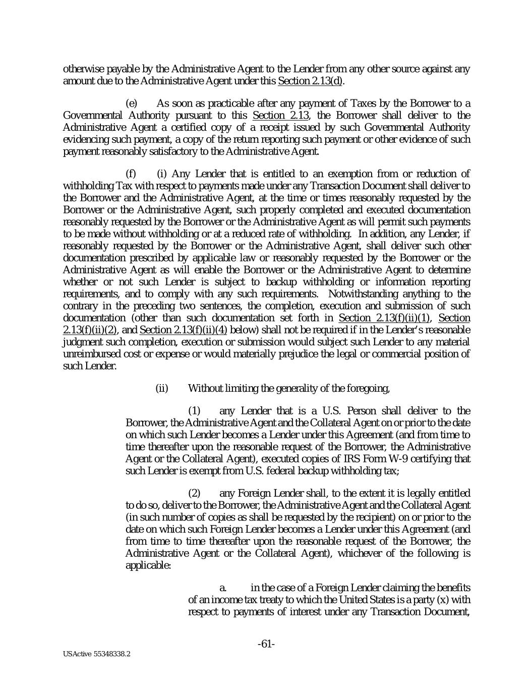 otherwise payable by the Administrative Agent to the Lender from any other source against any amount due to the Administrative Agent under this Section 2.13(d). (e) As soon as practicable after any payment of Taxes by the Borrower to a Governmental Authority pursuant to this Section 2.13, the Borrower shall deliver to the Administrative Agent a certified copy of a receipt issued by such Governmental Authority evidencing such payment, a copy of the return reporting such payment or other evidence of such payment reasonably satisfactory to the Administrative Agent. (f) (i) Any Lender that is entitled to an exemption from or reduction of withholding Tax with respect to payments made under any Transaction Document shall deliver to the Borrower and the Administrative Agent, at the time or times reasonably requested by the Borrower or the Administrative Agent, such properly completed and executed documentation reasonably requested by the Borrower or the Administrative Agent as will permit such payments to be made without withholding or at a reduced rate of withholding. In addition, any Lender, if reasonably requested by the Borrower or the Administrative Agent, shall deliver such other documentation prescribed by applicable law or reasonably requested by the Borrower or the Administrative Agent as will enable the Borrower or the Administrative Agent to determine whether or not such Lender is subject to backup withholding or information reporting requirements, and to comply with any such requirements. Notwithstanding anything to the contrary in the preceding two sentences, the completion, execution and submission of such documentation (other than such documentation set forth in Section 2.13(f)(ii)(1), Section 2.13(f)(ii)(2), and Section 2.13(f)(ii)(4) below) shall not be required if in the Lender’s reasonable judgment such completion, execution or submission would subject such Lender to any material unreimbursed cost or expense or would materially prejudice the legal or commercial position of such Lender. (ii) Without limiting the generality of the foregoing, (1) any Lender that is a U.S. Person shall deliver to the Borrower, the Administrative Agent and the Collateral Agent on or prior to the date on which such Lender becomes a Lender under this Agreement (and from time to time thereafter upon the reasonable request of the Borrower, the Administrative Agent or the Collateral Agent), executed copies of IRS Form W-9 certifying that such Lender is exempt from U.S. federal backup withholding tax; (2) any Foreign Lender shall, to the extent it is legally entitled to do so, deliver to the Borrower, the Administrative Agent and the Collateral Agent (in such number of copies as shall be requested by the recipient) on or prior to the date on which such Foreign Lender becomes a Lender under this Agreement (and from time to time thereafter upon the reasonable request of the Borrower, the Administrative Agent or the Collateral Agent), whichever of the following is applicable: a. in the case of a Foreign Lender claiming the benefits of an income tax treaty to which the United States is a party (x) with respect to payments of interest under any Transaction Document, -61- USActive 55348338.2