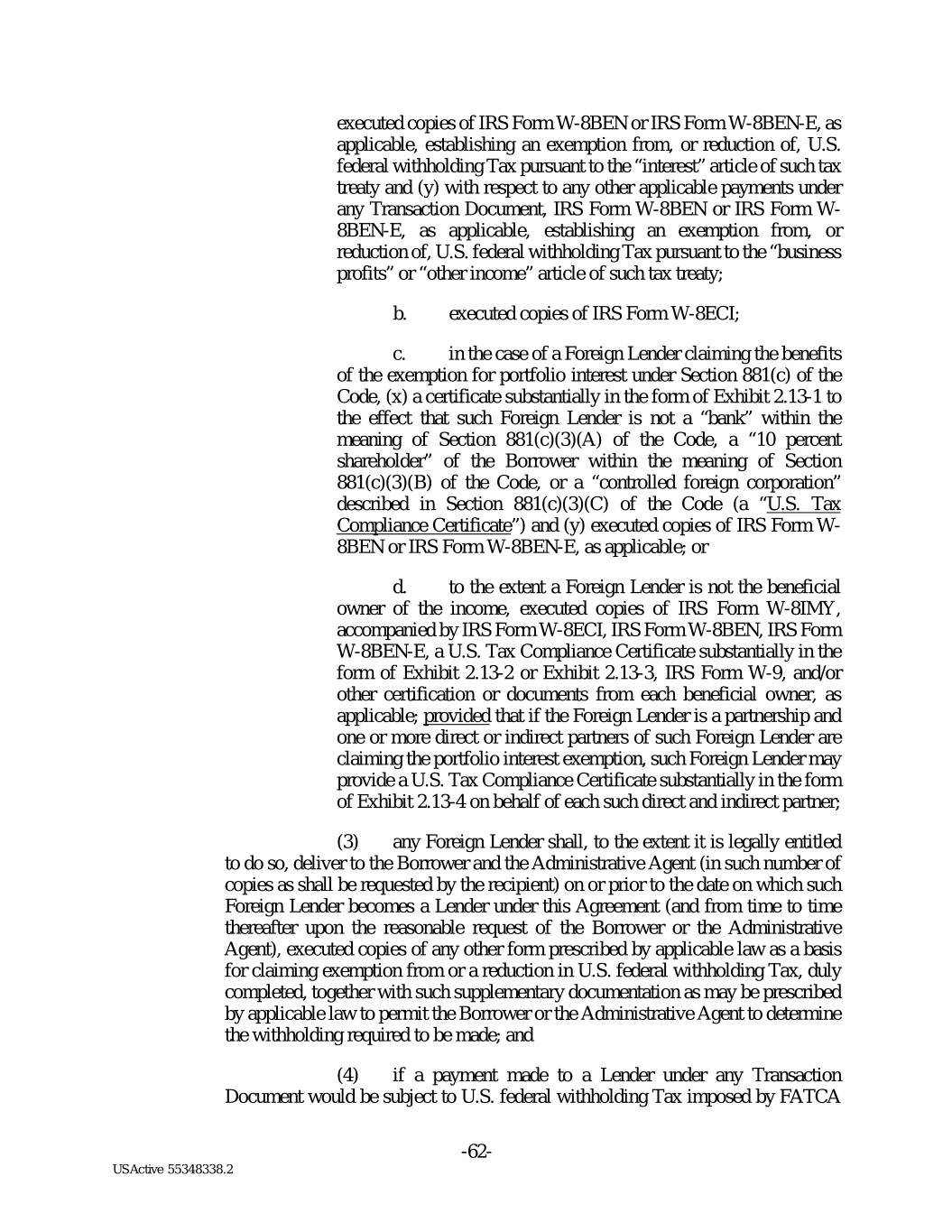 executed copies of IRS Form W-8BEN or IRS Form W-8BEN-E, as applicable, establishing an exemption from, or reduction of, U.S. federal withholding Tax pursuant to the “interest” article of such tax treaty and (y) with respect to any other applicable payments under any Transaction Document, IRS Form W-8BEN or IRS Form W- 8BEN-E, as applicable, establishing an exemption from, or reduction of, U.S. federal withholding Tax pursuant to the “business profits” or “other income” article of such tax treaty; b. executed copies of IRS Form W-8ECI; c. in the case of a Foreign Lender claiming the benefits of the exemption for portfolio interest under Section 881(c) of the Code, (x) a certificate substantially in the form of Exhibit 2.13-1 to the effect that such Foreign Lender is not a “bank” within the meaning of Section 881(c)(3)(A) of the Code, a “10 percent shareholder” of the Borrower within the meaning of Section 881(c)(3)(B) of the Code, or a “controlled foreign corporation” described in Section 881(c)(3)(C) of the Code (a “U.S. Tax Compliance Certificate”) and (y) executed copies of IRS Form W- 8BEN or IRS Form W-8BEN-E, as applicable; or d. to the extent a Foreign Lender is not the beneficial owner of the income, executed copies of IRS Form W-8IMY, accompanied by IRS Form W-8ECI, IRS Form W-8BEN, IRS Form W-8BEN-E, a U.S. Tax Compliance Certificate substantially in the form of Exhibit 2.13-2 or Exhibit 2.13-3, IRS Form W-9, and/or other certification or documents from each beneficial owner, as applicable; provided that if the Foreign Lender is a partnership and one or more direct or indirect partners of such Foreign Lender are claiming the portfolio interest exemption, such Foreign Lender may provide a U.S. Tax Compliance Certificate substantially in the form of Exhibit 2.13-4 on behalf of each such direct and indirect partner; (3) any Foreign Lender shall, to the extent it is legally entitled to do so, deliver to the Borrower and the Administrative Agent (in such number of copies as shall be requested by the recipient) on or prior to the date on which such Foreign Lender becomes a Lender under this Agreement (and from time to time thereafter upon the reasonable request of the Borrower or the Administrative Agent), executed copies of any other form prescribed by applicable law as a basis for claiming exemption from or a reduction in U.S. federal withholding Tax, duly completed, together with such supplementary documentation as may be prescribed by applicable law to permit the Borrower or the Administrative Agent to determine the withholding required to be made; and (4) if a payment made to a Lender under any Transaction Document would be subject to U.S. federal withholding Tax imposed by FATCA -62- USActive 55348338.2
