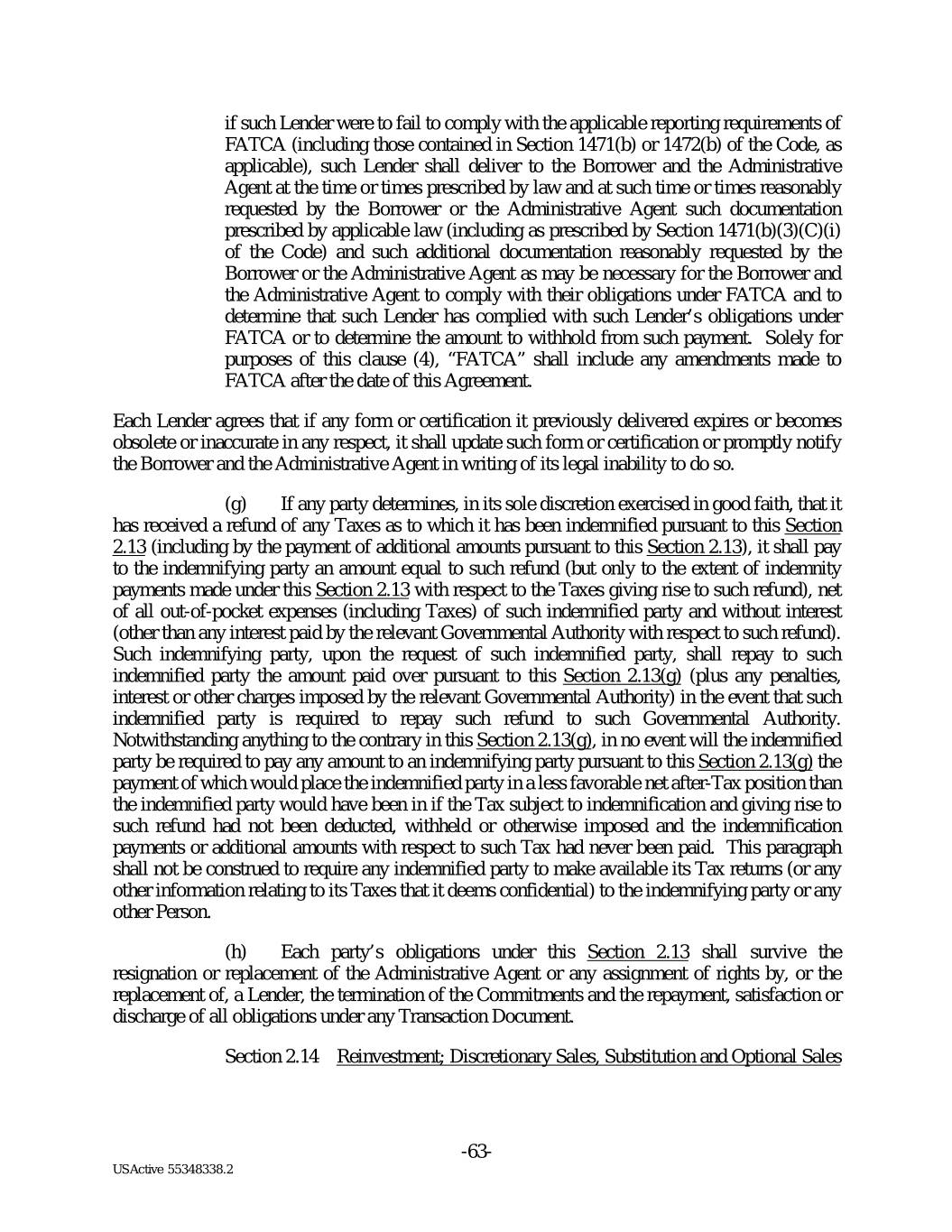 if such Lender were to fail to comply with the applicable reporting requirements of FATCA (including those contained in Section 1471(b) or 1472(b) of the Code, as applicable), such Lender shall deliver to the Borrower and the Administrative Agent at the time or times prescribed by law and at such time or times reasonably requested by the Borrower or the Administrative Agent such documentation prescribed by applicable law (including as prescribed by Section 1471(b)(3)(C)(i) of the Code) and such additional documentation reasonably requested by the Borrower or the Administrative Agent as may be necessary for the Borrower and the Administrative Agent to comply with their obligations under FATCA and to determine that such Lender has complied with such Lender’s obligations under FATCA or to determine the amount to withhold from such payment. Solely for purposes of this clause (4), “FATCA” shall include any amendments made to FATCA after the date of this Agreement. Each Lender agrees that if any form or certification it previously delivered expires or becomes obsolete or inaccurate in any respect, it shall update such form or certification or promptly notify the Borrower and the Administrative Agent in writing of its legal inability to do so. (g) If any party determines, in its sole discretion exercised in good faith, that it has received a refund of any Taxes as to which it has been indemnified pursuant to this Section 2.13 (including by the payment of additional amounts pursuant to this Section 2.13), it shall pay to the indemnifying party an amount equal to such refund (but only to the extent of indemnity payments made under this Section 2.13 with respect to the Taxes giving rise to such refund), net of all out-of-pocket expenses (including Taxes) of such indemnified party and without interest (other than any interest paid by the relevant Governmental Authority with respect to such refund). Such indemnifying party, upon the request of such indemnified party, shall repay to such indemnified party the amount paid over pursuant to this Section 2.13(g) (plus any penalties, interest or other charges imposed by the relevant Governmental Authority) in the event that such indemnified party is required to repay such refund to such Governmental Authority. Notwithstanding anything to the contrary in this Section 2.13(g), in no event will the indemnified party be required to pay any amount to an indemnifying party pursuant to this Section 2.13(g) the payment of which would place the indemnified party in a less favorable net after-Tax position than the indemnified party would have been in if the Tax subject to indemnification and giving rise to such refund had not been deducted, withheld or otherwise imposed and the indemnification payments or additional amounts with respect to such Tax had never been paid. This paragraph shall not be construed to require any indemnified party to make available its Tax returns (or any other information relating to its Taxes that it deems confidential) to the indemnifying party or any other Person. (h) Each party’s obligations under this Section 2.13 shall survive the resignation or replacement of the Administrative Agent or any assignment of rights by, or the replacement of, a Lender, the termination of the Commitments and the repayment, satisfaction or discharge of all obligations under any Transaction Document. Section 2.14 Reinvestment; Discretionary Sales, Substitution and Optional Sales -63- USActive 55348338.2