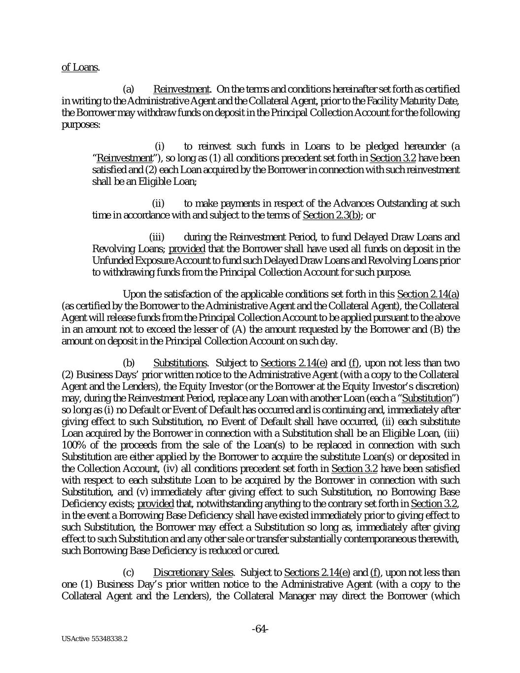 of Loans. (a) Reinvestment. On the terms and conditions hereinafter set forth as certified in writing to the Administrative Agent and the Collateral Agent, prior to the Facility Maturity Date, the Borrower may withdraw funds on deposit in the Principal Collection Account for the following purposes: (i) to reinvest such funds in Loans to be pledged hereunder (a “Reinvestment”), so long as (1) all conditions precedent set forth in Section 3.2 have been satisfied and (2) each Loan acquired by the Borrower in connection with such reinvestment shall be an Eligible Loan; (ii) to make payments in respect of the Advances Outstanding at such time in accordance with and subject to the terms of Section 2.3(b); or (iii) during the Reinvestment Period, to fund Delayed Draw Loans and Revolving Loans; provided that the Borrower shall have used all funds on deposit in the Unfunded Exposure Account to fund such Delayed Draw Loans and Revolving Loans prior to withdrawing funds from the Principal Collection Account for such purpose. Upon the satisfaction of the applicable conditions set forth in this Section 2.14(a) (as certified by the Borrower to the Administrative Agent and the Collateral Agent), the Collateral Agent will release funds from the Principal Collection Account to be applied pursuant to the above in an amount not to exceed the lesser of (A) the amount requested by the Borrower and (B) the amount on deposit in the Principal Collection Account on such day. (b) Substitutions. Subject to Sections 2.14(e) and (f), upon not less than two (2) Business Days’ prior written notice to the Administrative Agent (with a copy to the Collateral Agent and the Lenders), the Equity Investor (or the Borrower at the Equity Investor’s discretion) may, during the Reinvestment Period, replace any Loan with another Loan (each a “Substitution”) so long as (i) no Default or Event of Default has occurred and is continuing and, immediately after giving effect to such Substitution, no Event of Default shall have occurred, (ii) each substitute Loan acquired by the Borrower in connection with a Substitution shall be an Eligible Loan, (iii) 100% of the proceeds from the sale of the Loan(s) to be replaced in connection with such Substitution are either applied by the Borrower to acquire the substitute Loan(s) or deposited in the Collection Account, (iv) all conditions precedent set forth in Section 3.2 have been satisfied with respect to each substitute Loan to be acquired by the Borrower in connection with such Substitution, and (v) immediately after giving effect to such Substitution, no Borrowing Base Deficiency exists; provided that, notwithstanding anything to the contrary set forth in Section 3.2, in the event a Borrowing Base Deficiency shall have existed immediately prior to giving effect to such Substitution, the Borrower may effect a Substitution so long as, immediately after giving effect to such Substitution and any other sale or transfer substantially contemporaneous therewith, such Borrowing Base Deficiency is reduced or cured. (c) Discretionary Sales. Subject to Sections 2.14(e) and (f), upon not less than one (1) Business Day’s prior written notice to the Administrative Agent (with a copy to the Collateral Agent and the Lenders), the Collateral Manager may direct the Borrower (which -64- USActive 55348338.2