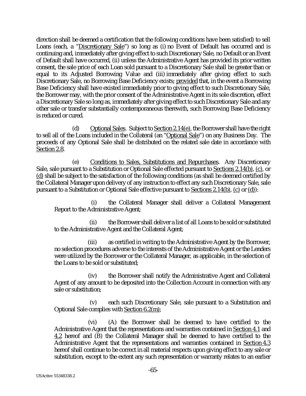 direction shall be deemed a certification that the following conditions have been satisfied) to sell Loans (each, a “Discretionary Sale”) so long as (i) no Event of Default has occurred and is continuing and, immediately after giving effect to such Discretionary Sale, no Default or an Event of Default shall have occurred, (ii) unless the Administrative Agent has provided its prior written consent, the sale price of each Loan sold pursuant to a Discretionary Sale shall be greater than or equal to its Adjusted Borrowing Value and (iii) immediately after giving effect to such Discretionary Sale, no Borrowing Base Deficiency exists; provided that, in the event a Borrowing Base Deficiency shall have existed immediately prior to giving effect to such Discretionary Sale, the Borrower may, with the prior consent of the Administrative Agent in its sole discretion, effect a Discretionary Sale so long as, immediately after giving effect to such Discretionary Sale and any other sale or transfer substantially contemporaneous therewith, such Borrowing Base Deficiency is reduced or cured. (d) Optional Sales. Subject to Section 2.14(e), the Borrower shall have the right to sell all of the Loans included in the Collateral (an “Optional Sale”) on any Business Day. The proceeds of any Optional Sale shall be distributed on the related sale date in accordance with Section 2.8. (e) Conditions to Sales, Substitutions and Repurchases. Any Discretionary Sale, sale pursuant to a Substitution or Optional Sale effected pursuant to Sections 2.14(b), (c), or (d) shall be subject to the satisfaction of the following conditions (as shall be deemed certified by the Collateral Manager upon delivery of any instruction to effect any such Discretionary Sale, sale pursuant to a Substitution or Optional Sale effective pursuant to Sections 2.14(b), (c) or (d)): (i) the Collateral Manager shall deliver a Collateral Management Report to the Administrative Agent; (ii) the Borrower shall deliver a list of all Loans to be sold or substituted to the Administrative Agent and the Collateral Agent; (iii) as certified in writing to the Administrative Agent by the Borrower, no selection procedures adverse to the interests of the Administrative Agent or the Lenders were utilized by the Borrower or the Collateral Manager, as applicable, in the selection of the Loans to be sold or substituted; (iv) the Borrower shall notify the Administrative Agent and Collateral Agent of any amount to be deposited into the Collection Account in connection with any sale or substitution; (v) each such Discretionary Sale, sale pursuant to a Substitution and Optional Sale complies with Section 6.2(m); (vi) (A) the Borrower shall be deemed to have certified to the Administrative Agent that the representations and warranties contained in Section 4.1 and 4.2 hereof and (B) the Collateral Manager shall be deemed to have certified to the Administrative Agent that the representations and warranties contained in Section 4.3 hereof shall continue to be correct in all material respects upon giving effect to any sale or substitution, except to the extent any such representation or warranty relates to an earlier -65- USActive 55348338.2