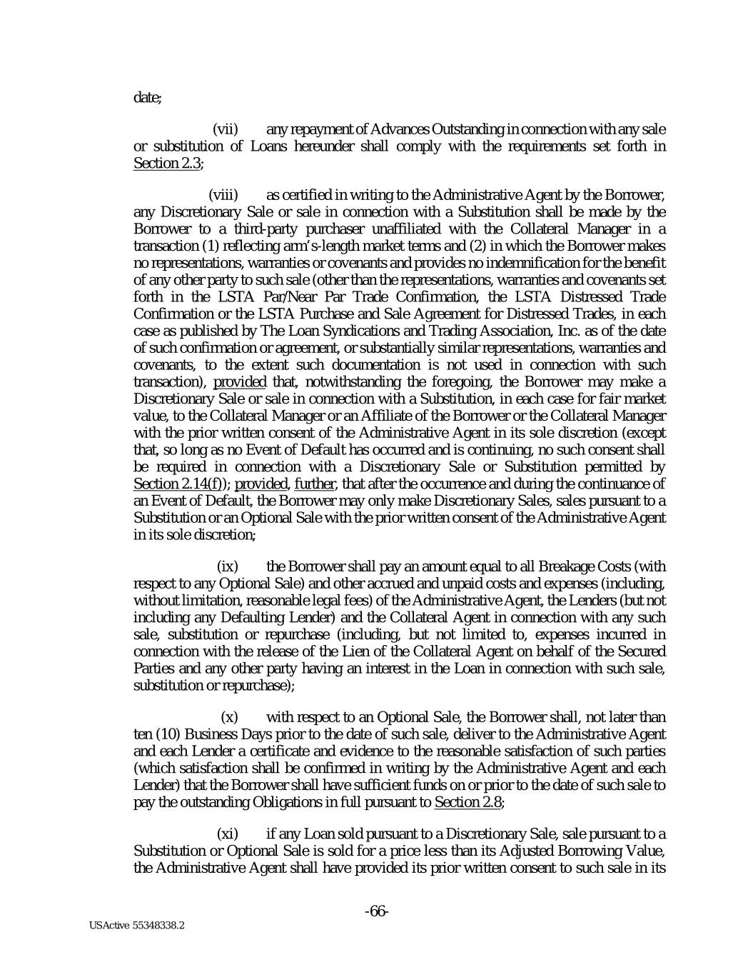 date; (vii) any repayment of Advances Outstanding in connection with any sale or substitution of Loans hereunder shall comply with the requirements set forth in Section 2.3; (viii) as certified in writing to the Administrative Agent by the Borrower, any Discretionary Sale or sale in connection with a Substitution shall be made by the Borrower to a third-party purchaser unaffiliated with the Collateral Manager in a transaction (1) reflecting arm’s-length market terms and (2) in which the Borrower makes no representations, warranties or covenants and provides no indemnification for the benefit of any other party to such sale (other than the representations, warranties and covenants set forth in the LSTA Par/Near Par Trade Confirmation, the LSTA Distressed Trade Confirmation or the LSTA Purchase and Sale Agreement for Distressed Trades, in each case as published by The Loan Syndications and Trading Association, Inc. as of the date of such confirmation or agreement, or substantially similar representations, warranties and covenants, to the extent such documentation is not used in connection with such transaction), provided that, notwithstanding the foregoing, the Borrower may make a Discretionary Sale or sale in connection with a Substitution, in each case for fair market value, to the Collateral Manager or an Affiliate of the Borrower or the Collateral Manager with the prior written consent of the Administrative Agent in its sole discretion (except that, so long as no Event of Default has occurred and is continuing, no such consent shall be required in connection with a Discretionary Sale or Substitution permitted by Section 2.14(f)); provided, further, that after the occurrence and during the continuance of an Event of Default, the Borrower may only make Discretionary Sales, sales pursuant to a Substitution or an Optional Sale with the prior written consent of the Administrative Agent in its sole discretion; (ix) the Borrower shall pay an amount equal to all Breakage Costs (with respect to any Optional Sale) and other accrued and unpaid costs and expenses (including, without limitation, reasonable legal fees) of the Administrative Agent, the Lenders (but not including any Defaulting Lender) and the Collateral Agent in connection with any such sale, substitution or repurchase (including, but not limited to, expenses incurred in connection with the release of the Lien of the Collateral Agent on behalf of the Secured Parties and any other party having an interest in the Loan in connection with such sale, substitution or repurchase); (x) with respect to an Optional Sale, the Borrower shall, not later than ten (10) Business Days prior to the date of such sale, deliver to the Administrative Agent and each Lender a certificate and evidence to the reasonable satisfaction of such parties (which satisfaction shall be confirmed in writing by the Administrative Agent and each Lender) that the Borrower shall have sufficient funds on or prior to the date of such sale to pay the outstanding Obligations in full pursuant to Section 2.8; (xi) if any Loan sold pursuant to a Discretionary Sale, sale pursuant to a Substitution or Optional Sale is sold for a price less than its Adjusted Borrowing Value, the Administrative Agent shall have provided its prior written consent to such sale in its -66- USActive 55348338.2