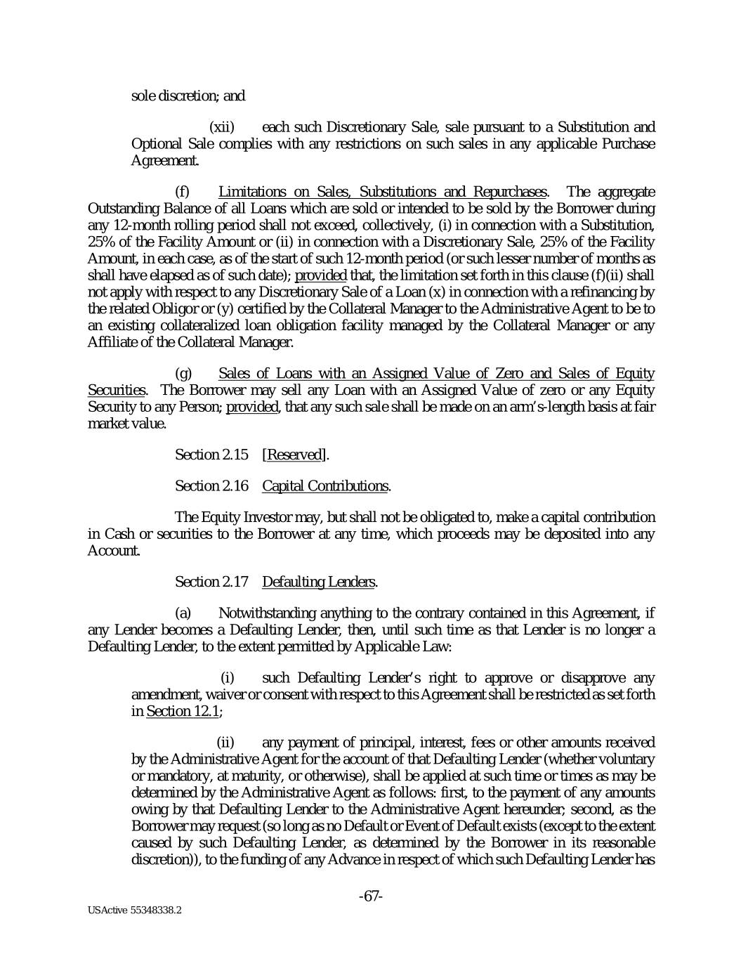sole discretion; and (xii) each such Discretionary Sale, sale pursuant to a Substitution and Optional Sale complies with any restrictions on such sales in any applicable Purchase Agreement. (f) Limitations on Sales, Substitutions and Repurchases. The aggregate Outstanding Balance of all Loans which are sold or intended to be sold by the Borrower during any 12-month rolling period shall not exceed, collectively, (i) in connection with a Substitution, 25% of the Facility Amount or (ii) in connection with a Discretionary Sale, 25% of the Facility Amount, in each case, as of the start of such 12-month period (or such lesser number of months as shall have elapsed as of such date); provided that, the limitation set forth in this clause (f)(ii) shall not apply with respect to any Discretionary Sale of a Loan (x) in connection with a refinancing by the related Obligor or (y) certified by the Collateral Manager to the Administrative Agent to be to an existing collateralized loan obligation facility managed by the Collateral Manager or any Affiliate of the Collateral Manager. (g) Sales of Loans with an Assigned Value of Zero and Sales of Equity Securities. The Borrower may sell any Loan with an Assigned Value of zero or any Equity Security to any Person; provided, that any such sale shall be made on an arm’s-length basis at fair market value. Section 2.15 [Reserved]. Section 2.16 Capital Contributions. The Equity Investor may, but shall not be obligated to, make a capital contribution in Cash or securities to the Borrower at any time, which proceeds may be deposited into any Account. Section 2.17 Defaulting Lenders. (a) Notwithstanding anything to the contrary contained in this Agreement, if any Lender becomes a Defaulting Lender, then, until such time as that Lender is no longer a Defaulting Lender, to the extent permitted by Applicable Law: (i) such Defaulting Lender’s right to approve or disapprove any amendment, waiver or consent with respect to this Agreement shall be restricted as set forth in Section 12.1; (ii) any payment of principal, interest, fees or other amounts received by the Administrative Agent for the account of that Defaulting Lender (whether voluntary or mandatory, at maturity, or otherwise), shall be applied at such time or times as may be determined by the Administrative Agent as follows: first, to the payment of any amounts owing by that Defaulting Lender to the Administrative Agent hereunder; second, as the Borrower may request (so long as no Default or Event of Default exists (except to the extent caused by such Defaulting Lender, as determined by the Borrower in its reasonable discretion)), to the funding of any Advance in respect of which such Defaulting Lender has -67- USActive 55348338.2