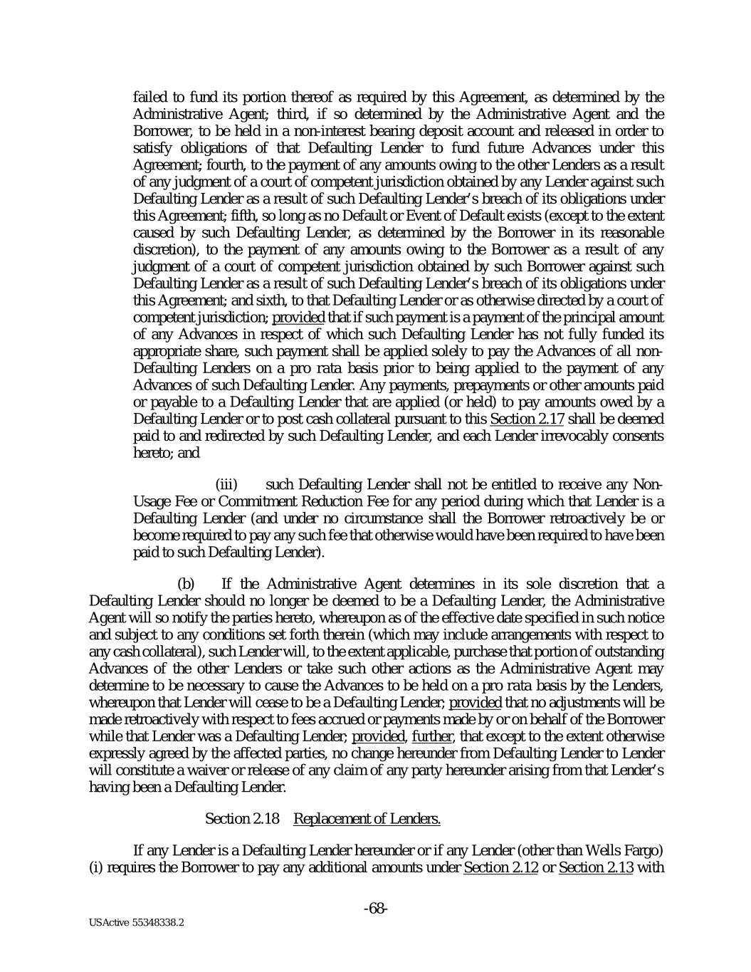 failed to fund its portion thereof as required by this Agreement, as determined by the Administrative Agent; third, if so determined by the Administrative Agent and the Borrower, to be held in a non-interest bearing deposit account and released in order to satisfy obligations of that Defaulting Lender to fund future Advances under this Agreement; fourth, to the payment of any amounts owing to the other Lenders as a result of any judgment of a court of competent jurisdiction obtained by any Lender against such Defaulting Lender as a result of such Defaulting Lender’s breach of its obligations under this Agreement; fifth, so long as no Default or Event of Default exists (except to the extent caused by such Defaulting Lender, as determined by the Borrower in its reasonable discretion), to the payment of any amounts owing to the Borrower as a result of any judgment of a court of competent jurisdiction obtained by such Borrower against such Defaulting Lender as a result of such Defaulting Lender’s breach of its obligations under this Agreement; and sixth, to that Defaulting Lender or as otherwise directed by a court of competent jurisdiction; provided that if such payment is a payment of the principal amount of any Advances in respect of which such Defaulting Lender has not fully funded its appropriate share, such payment shall be applied solely to pay the Advances of all non- Defaulting Lenders on a pro rata basis prior to being applied to the payment of any Advances of such Defaulting Lender. Any payments, prepayments or other amounts paid or payable to a Defaulting Lender that are applied (or held) to pay amounts owed by a Defaulting Lender or to post cash collateral pursuant to this Section 2.17 shall be deemed paid to and redirected by such Defaulting Lender, and each Lender irrevocably consents hereto; and (iii) such Defaulting Lender shall not be entitled to receive any Non- Usage Fee or Commitment Reduction Fee for any period during which that Lender is a Defaulting Lender (and under no circumstance shall the Borrower retroactively be or become required to pay any such fee that otherwise would have been required to have been paid to such Defaulting Lender). (b) If the Administrative Agent determines in its sole discretion that a Defaulting Lender should no longer be deemed to be a Defaulting Lender, the Administrative Agent will so notify the parties hereto, whereupon as of the effective date specified in such notice and subject to any conditions set forth therein (which may include arrangements with respect to any cash collateral), such Lender will, to the extent applicable, purchase that portion of outstanding Advances of the other Lenders or take such other actions as the Administrative Agent may determine to be necessary to cause the Advances to be held on a pro rata basis by the Lenders, whereupon that Lender will cease to be a Defaulting Lender; provided that no adjustments will be made retroactively with respect to fees accrued or payments made by or on behalf of the Borrower while that Lender was a Defaulting Lender; provided, further, that except to the extent otherwise expressly agreed by the affected parties, no change hereunder from Defaulting Lender to Lender will constitute a waiver or release of any claim of any party hereunder arising from that Lender’s having been a Defaulting Lender. Section 2.18 Replacement of Lenders. If any Lender is a Defaulting Lender hereunder or if any Lender (other than Wells Fargo) (i) requires the Borrower to pay any additional amounts under Section 2.12 or Section 2.13 with -68- USActive 55348338.2