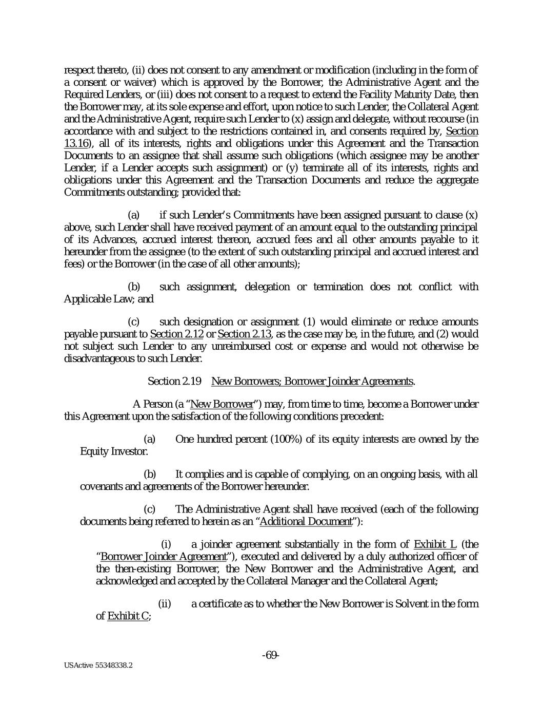 respect thereto, (ii) does not consent to any amendment or modification (including in the form of a consent or waiver) which is approved by the Borrower, the Administrative Agent and the Required Lenders, or (iii) does not consent to a request to extend the Facility Maturity Date, then the Borrower may, at its sole expense and effort, upon notice to such Lender, the Collateral Agent and the Administrative Agent, require such Lender to (x) assign and delegate, without recourse (in accordance with and subject to the restrictions contained in, and consents required by, Section 13.16), all of its interests, rights and obligations under this Agreement and the Transaction Documents to an assignee that shall assume such obligations (which assignee may be another Lender, if a Lender accepts such assignment) or (y) terminate all of its interests, rights and obligations under this Agreement and the Transaction Documents and reduce the aggregate Commitments outstanding; provided that: (a) if such Lender’s Commitments have been assigned pursuant to clause (x) above, such Lender shall have received payment of an amount equal to the outstanding principal of its Advances, accrued interest thereon, accrued fees and all other amounts payable to it hereunder from the assignee (to the extent of such outstanding principal and accrued interest and fees) or the Borrower (in the case of all other amounts); (b) such assignment, delegation or termination does not conflict with Applicable Law; and (c) such designation or assignment (1) would eliminate or reduce amounts payable pursuant to Section 2.12 or Section 2.13, as the case may be, in the future, and (2) would not subject such Lender to any unreimbursed cost or expense and would not otherwise be disadvantageous to such Lender. Section 2.19 New Borrowers; Borrower Joinder Agreements. A Person (a “New Borrower”) may, from time to time, become a Borrower under this Agreement upon the satisfaction of the following conditions precedent: (a) One hundred percent (100%) of its equity interests are owned by the Equity Investor. (b) It complies and is capable of complying, on an ongoing basis, with all covenants and agreements of the Borrower hereunder. (c) The Administrative Agent shall have received (each of the following documents being referred to herein as an “Additional Document”): (i) a joinder agreement substantially in the form of Exhibit L (the “Borrower Joinder Agreement”), executed and delivered by a duly authorized officer of the then-existing Borrower, the New Borrower and the Administrative Agent, and acknowledged and accepted by the Collateral Manager and the Collateral Agent; (ii) a certificate as to whether the New Borrower is Solvent in the form of Exhibit C; -69- USActive 55348338.2