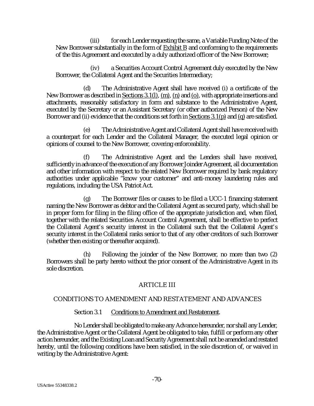 (iii) for each Lender requesting the same, a Variable Funding Note of the New Borrower substantially in the form of Exhibit B and conforming to the requirements of the this Agreement and executed by a duly authorized officer of the New Borrower; (iv) a Securities Account Control Agreement duly executed by the New Borrower, the Collateral Agent and the Securities Intermediary; (d) The Administrative Agent shall have received (i) a certificate of the New Borrower as described in Sections 3.1(l), (m), (n) and (o), with appropriate insertions and attachments, reasonably satisfactory in form and substance to the Administrative Agent, executed by the Secretary or an Assistant Secretary (or other authorized Person) of the New Borrower and (ii) evidence that the conditions set forth in Sections 3.1(p) and (q) are satisfied. (e) The Administrative Agent and Collateral Agent shall have received with a counterpart for each Lender and the Collateral Manager, the executed legal opinion or opinions of counsel to the New Borrower, covering enforceability. (f) The Administrative Agent and the Lenders shall have received, sufficiently in advance of the execution of any Borrower Joinder Agreement, all documentation and other information with respect to the related New Borrower required by bank regulatory authorities under applicable “know your customer” and anti-money laundering rules and regulations, including the USA Patriot Act. (g) The Borrower files or causes to be filed a UCC-1 financing statement naming the New Borrower as debtor and the Collateral Agent as secured party, which shall be in proper form for filing in the filing office of the appropriate jurisdiction and, when filed, together with the related Securities Account Control Agreement, shall be effective to perfect the Collateral Agent’s security interest in the Collateral such that the Collateral Agent’s security interest in the Collateral ranks senior to that of any other creditors of such Borrower (whether then existing or thereafter acquired). (h) Following the joinder of the New Borrower, no more than two (2) Borrowers shall be party hereto without the prior consent of the Administrative Agent in its sole discretion. ARTICLE III CONDITIONS TO AMENDMENT AND RESTATEMENT AND ADVANCES Section 3.1 Conditions to Amendment and Restatement. No Lender shall be obligated to make any Advance hereunder, nor shall any Lender, the Administrative Agent or the Collateral Agent be obligated to take, fulfill or perform any other action hereunder, and the Existing Loan and Security Agreement shall not be amended and restated hereby, until the following conditions have been satisfied, in the sole discretion of, or waived in writing by the Administrative Agent: -70- USActive 55348338.2