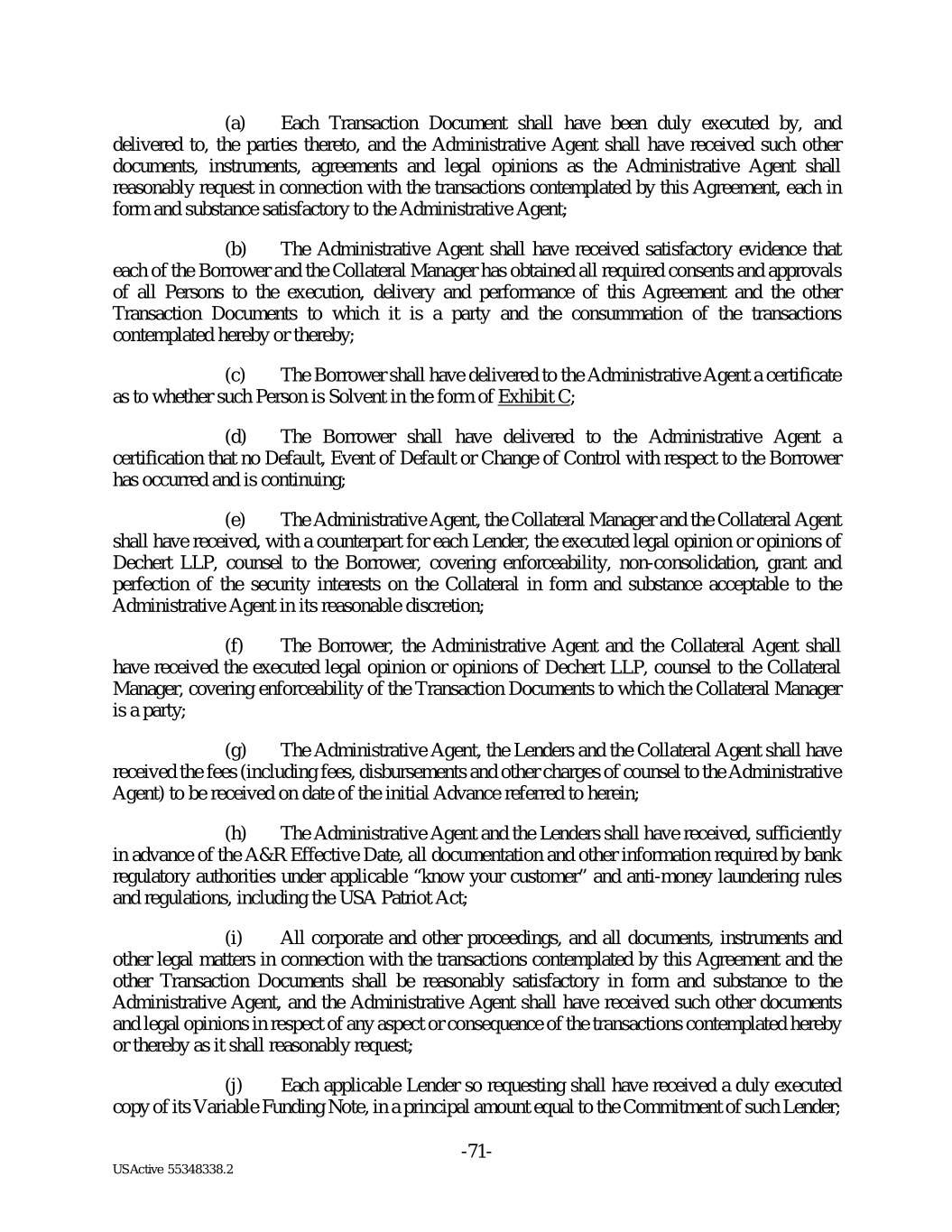 (a) Each Transaction Document shall have been duly executed by, and delivered to, the parties thereto, and the Administrative Agent shall have received such other documents, instruments, agreements and legal opinions as the Administrative Agent shall reasonably request in connection with the transactions contemplated by this Agreement, each in form and substance satisfactory to the Administrative Agent; (b) The Administrative Agent shall have received satisfactory evidence that each of the Borrower and the Collateral Manager has obtained all required consents and approvals of all Persons to the execution, delivery and performance of this Agreement and the other Transaction Documents to which it is a party and the consummation of the transactions contemplated hereby or thereby; (c) The Borrower shall have delivered to the Administrative Agent a certificate as to whether such Person is Solvent in the form of Exhibit C; (d) The Borrower shall have delivered to the Administrative Agent a certification that no Default, Event of Default or Change of Control with respect to the Borrower has occurred and is continuing; (e) The Administrative Agent, the Collateral Manager and the Collateral Agent shall have received, with a counterpart for each Lender, the executed legal opinion or opinions of Dechert LLP, counsel to the Borrower, covering enforceability, non-consolidation, grant and perfection of the security interests on the Collateral in form and substance acceptable to the Administrative Agent in its reasonable discretion; (f) The Borrower, the Administrative Agent and the Collateral Agent shall have received the executed legal opinion or opinions of Dechert LLP, counsel to the Collateral Manager, covering enforceability of the Transaction Documents to which the Collateral Manager is a party; (g) The Administrative Agent, the Lenders and the Collateral Agent shall have received the fees (including fees, disbursements and other charges of counsel to the Administrative Agent) to be received on date of the initial Advance referred to herein; (h) The Administrative Agent and the Lenders shall have received, sufficiently in advance of the A&R Effective Date, all documentation and other information required by bank regulatory authorities under applicable “know your customer” and anti-money laundering rules and regulations, including the USA Patriot Act; (i) All corporate and other proceedings, and all documents, instruments and other legal matters in connection with the transactions contemplated by this Agreement and the other Transaction Documents shall be reasonably satisfactory in form and substance to the Administrative Agent, and the Administrative Agent shall have received such other documents and legal opinions in respect of any aspect or consequence of the transactions contemplated hereby or thereby as it shall reasonably request; (j) Each applicable Lender so requesting shall have received a duly executed copy of its Variable Funding Note, in a principal amount equal to the Commitment of such Lender; -71- USActive 55348338.2