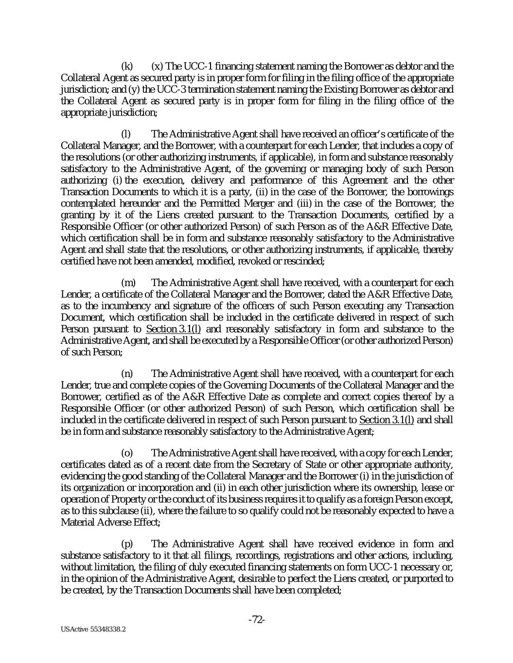(k) (x) The UCC-1 financing statement naming the Borrower as debtor and the Collateral Agent as secured party is in proper form for filing in the filing office of the appropriate jurisdiction; and (y) the UCC-3 termination statement naming the Existing Borrower as debtor and the Collateral Agent as secured party is in proper form for filing in the filing office of the appropriate jurisdiction; (l) The Administrative Agent shall have received an officer’s certificate of the Collateral Manager, and the Borrower, with a counterpart for each Lender, that includes a copy of the resolutions (or other authorizing instruments, if applicable), in form and substance reasonably satisfactory to the Administrative Agent, of the governing or managing body of such Person authorizing (i) the execution, delivery and performance of this Agreement and the other Transaction Documents to which it is a party, (ii) in the case of the Borrower, the borrowings contemplated hereunder and the Permitted Merger and (iii) in the case of the Borrower, the granting by it of the Liens created pursuant to the Transaction Documents, certified by a Responsible Officer (or other authorized Person) of such Person as of the A&R Effective Date, which certification shall be in form and substance reasonably satisfactory to the Administrative Agent and shall state that the resolutions, or other authorizing instruments, if applicable, thereby certified have not been amended, modified, revoked or rescinded; (m) The Administrative Agent shall have received, with a counterpart for each Lender, a certificate of the Collateral Manager and the Borrower, dated the A&R Effective Date, as to the incumbency and signature of the officers of such Person executing any Transaction Document, which certification shall be included in the certificate delivered in respect of such Person pursuant to Section 3.1(l) and reasonably satisfactory in form and substance to the Administrative Agent, and shall be executed by a Responsible Officer (or other authorized Person) of such Person; (n) The Administrative Agent shall have received, with a counterpart for each Lender, true and complete copies of the Governing Documents of the Collateral Manager and the Borrower, certified as of the A&R Effective Date as complete and correct copies thereof by a Responsible Officer (or other authorized Person) of such Person, which certification shall be included in the certificate delivered in respect of such Person pursuant to Section 3.1(l) and shall be in form and substance reasonably satisfactory to the Administrative Agent; (o) The Administrative Agent shall have received, with a copy for each Lender, certificates dated as of a recent date from the Secretary of State or other appropriate authority, evidencing the good standing of the Collateral Manager and the Borrower (i) in the jurisdiction of its organization or incorporation and (ii) in each other jurisdiction where its ownership, lease or operation of Property or the conduct of its business requires it to qualify as a foreign Person except, as to this subclause (ii), where the failure to so qualify could not be reasonably expected to have a Material Adverse Effect; (p) The Administrative Agent shall have received evidence in form and substance satisfactory to it that all filings, recordings, registrations and other actions, including, without limitation, the filing of duly executed financing statements on form UCC-1 necessary or, in the opinion of the Administrative Agent, desirable to perfect the Liens created, or purported to be created, by the Transaction Documents shall have been completed; -72- USActive 55348338.2