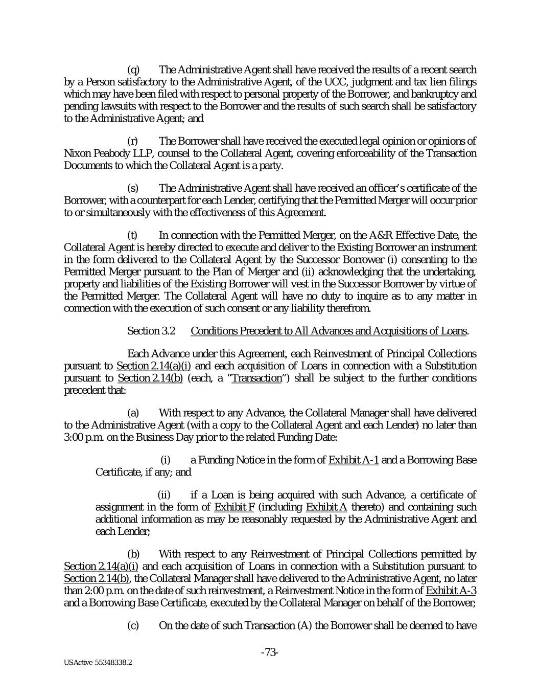 (q) The Administrative Agent shall have received the results of a recent search by a Person satisfactory to the Administrative Agent, of the UCC, judgment and tax lien filings which may have been filed with respect to personal property of the Borrower, and bankruptcy and pending lawsuits with respect to the Borrower and the results of such search shall be satisfactory to the Administrative Agent; and (r) The Borrower shall have received the executed legal opinion or opinions of Nixon Peabody LLP, counsel to the Collateral Agent, covering enforceability of the Transaction Documents to which the Collateral Agent is a party. (s) The Administrative Agent shall have received an officer’s certificate of the Borrower, with a counterpart for each Lender, certifying that the Permitted Merger will occur prior to or simultaneously with the effectiveness of this Agreement. (t) In connection with the Permitted Merger, on the A&R Effective Date, the Collateral Agent is hereby directed to execute and deliver to the Existing Borrower an instrument in the form delivered to the Collateral Agent by the Successor Borrower (i) consenting to the Permitted Merger pursuant to the Plan of Merger and (ii) acknowledging that the undertaking, property and liabilities of the Existing Borrower will vest in the Successor Borrower by virtue of the Permitted Merger. The Collateral Agent will have no duty to inquire as to any matter in connection with the execution of such consent or any liability therefrom. Section 3.2 Conditions Precedent to All Advances and Acquisitions of Loans. Each Advance under this Agreement, each Reinvestment of Principal Collections pursuant to Section 2.14(a)(i) and each acquisition of Loans in connection with a Substitution pursuant to Section 2.14(b) (each, a “Transaction”) shall be subject to the further conditions precedent that: (a) With respect to any Advance, the Collateral Manager shall have delivered to the Administrative Agent (with a copy to the Collateral Agent and each Lender) no later than 3:00 p.m. on the Business Day prior to the related Funding Date: (i) a Funding Notice in the form of Exhibit A-1 and a Borrowing Base Certificate, if any; and (ii) if a Loan is being acquired with such Advance, a certificate of assignment in the form of Exhibit F (including Exhibit A thereto) and containing such additional information as may be reasonably requested by the Administrative Agent and each Lender; (b) With respect to any Reinvestment of Principal Collections permitted by Section 2.14(a)(i) and each acquisition of Loans in connection with a Substitution pursuant to Section 2.14(b), the Collateral Manager shall have delivered to the Administrative Agent, no later than 2:00 p.m. on the date of such reinvestment, a Reinvestment Notice in the form of Exhibit A-3 and a Borrowing Base Certificate, executed by the Collateral Manager on behalf of the Borrower; (c) On the date of such Transaction (A) the Borrower shall be deemed to have -73- USActive 55348338.2