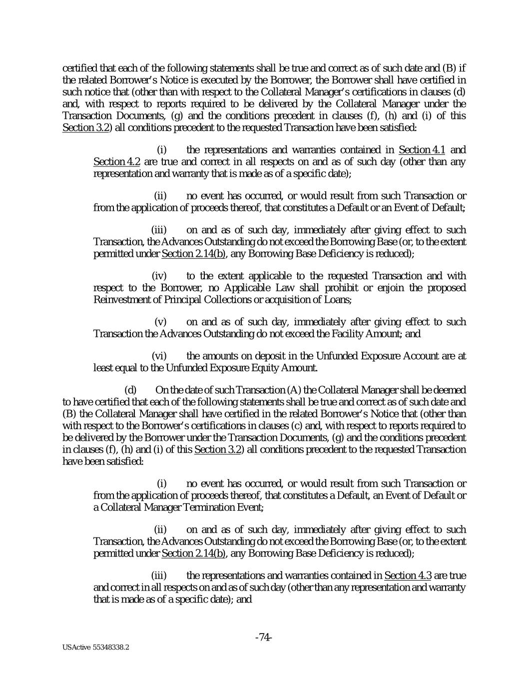 certified that each of the following statements shall be true and correct as of such date and (B) if the related Borrower’s Notice is executed by the Borrower, the Borrower shall have certified in such notice that (other than with respect to the Collateral Manager’s certifications in clauses (d) and, with respect to reports required to be delivered by the Collateral Manager under the Transaction Documents, (g) and the conditions precedent in clauses (f), (h) and (i) of this Section 3.2) all conditions precedent to the requested Transaction have been satisfied: (i) the representations and warranties contained in Section 4.1 and Section 4.2 are true and correct in all respects on and as of such day (other than any representation and warranty that is made as of a specific date); (ii) no event has occurred, or would result from such Transaction or from the application of proceeds thereof, that constitutes a Default or an Event of Default; (iii) on and as of such day, immediately after giving effect to such Transaction, the Advances Outstanding do not exceed the Borrowing Base (or, to the extent permitted under Section 2.14(b), any Borrowing Base Deficiency is reduced); (iv) to the extent applicable to the requested Transaction and with respect to the Borrower, no Applicable Law shall prohibit or enjoin the proposed Reinvestment of Principal Collections or acquisition of Loans; (v) on and as of such day, immediately after giving effect to such Transaction the Advances Outstanding do not exceed the Facility Amount; and (vi) the amounts on deposit in the Unfunded Exposure Account are at least equal to the Unfunded Exposure Equity Amount. (d) On the date of such Transaction (A) the Collateral Manager shall be deemed to have certified that each of the following statements shall be true and correct as of such date and (B) the Collateral Manager shall have certified in the related Borrower’s Notice that (other than with respect to the Borrower’s certifications in clauses (c) and, with respect to reports required to be delivered by the Borrower under the Transaction Documents, (g) and the conditions precedent in clauses (f), (h) and (i) of this Section 3.2) all conditions precedent to the requested Transaction have been satisfied: (i) no event has occurred, or would result from such Transaction or from the application of proceeds thereof, that constitutes a Default, an Event of Default or a Collateral Manager Termination Event; (ii) on and as of such day, immediately after giving effect to such Transaction, the Advances Outstanding do not exceed the Borrowing Base (or, to the extent permitted under Section 2.14(b), any Borrowing Base Deficiency is reduced); (iii) the representations and warranties contained in Section 4.3 are true and correct in all respects on and as of such day (other than any representation and warranty that is made as of a specific date); and -74- USActive 55348338.2