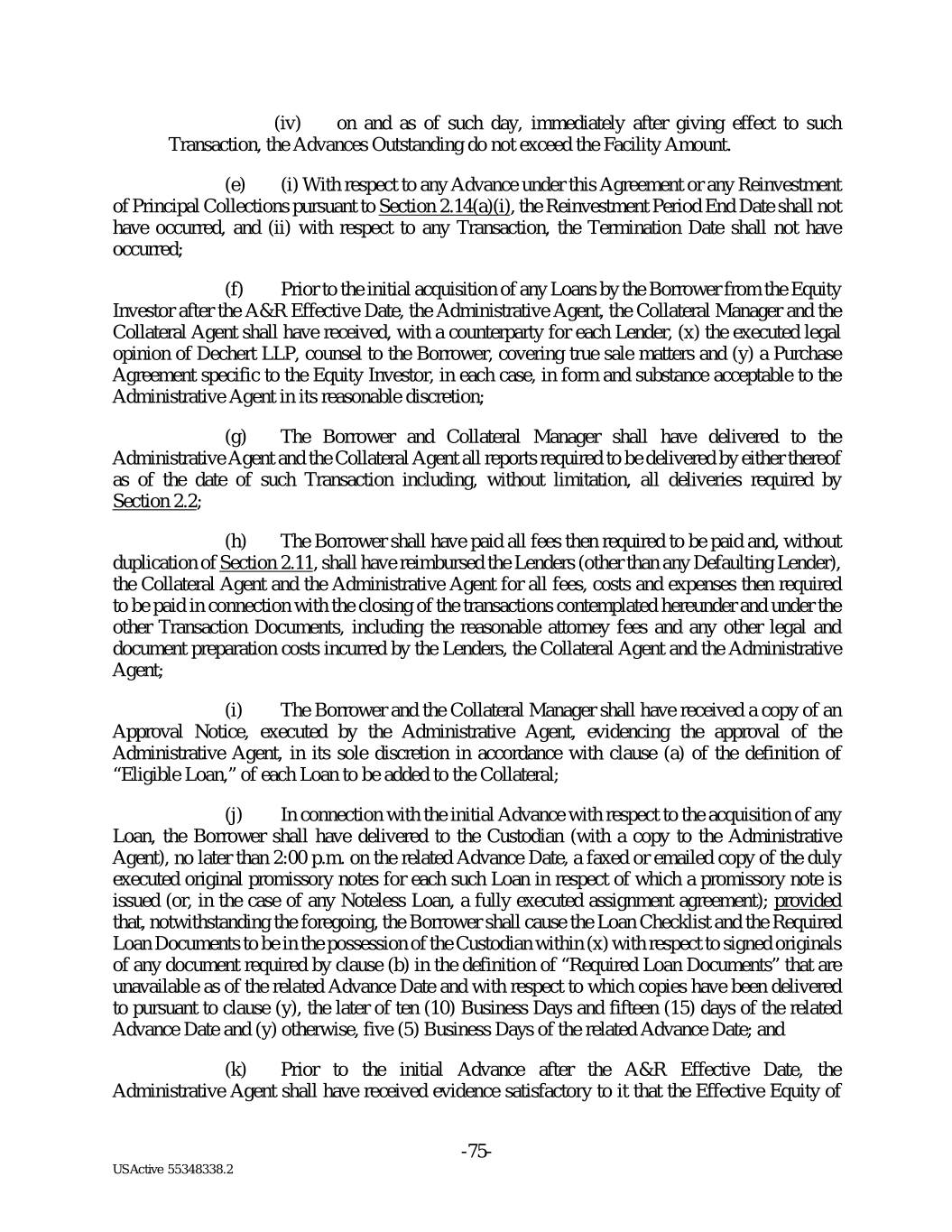 (iv) on and as of such day, immediately after giving effect to such Transaction, the Advances Outstanding do not exceed the Facility Amount. (e) (i) With respect to any Advance under this Agreement or any Reinvestment of Principal Collections pursuant to Section 2.14(a)(i), the Reinvestment Period End Date shall not have occurred, and (ii) with respect to any Transaction, the Termination Date shall not have occurred; (f) Prior to the initial acquisition of any Loans by the Borrower from the Equity Investor after the A&R Effective Date, the Administrative Agent, the Collateral Manager and the Collateral Agent shall have received, with a counterparty for each Lender, (x) the executed legal opinion of Dechert LLP, counsel to the Borrower, covering true sale matters and (y) a Purchase Agreement specific to the Equity Investor, in each case, in form and substance acceptable to the Administrative Agent in its reasonable discretion; (g) The Borrower and Collateral Manager shall have delivered to the Administrative Agent and the Collateral Agent all reports required to be delivered by either thereof as of the date of such Transaction including, without limitation, all deliveries required by Section 2.2; (h) The Borrower shall have paid all fees then required to be paid and, without duplication of Section 2.11, shall have reimbursed the Lenders (other than any Defaulting Lender), the Collateral Agent and the Administrative Agent for all fees, costs and expenses then required to be paid in connection with the closing of the transactions contemplated hereunder and under the other Transaction Documents, including the reasonable attorney fees and any other legal and document preparation costs incurred by the Lenders, the Collateral Agent and the Administrative Agent; (i) The Borrower and the Collateral Manager shall have received a copy of an Approval Notice, executed by the Administrative Agent, evidencing the approval of the Administrative Agent, in its sole discretion in accordance with clause (a) of the definition of “Eligible Loan,” of each Loan to be added to the Collateral; (j) In connection with the initial Advance with respect to the acquisition of any Loan, the Borrower shall have delivered to the Custodian (with a copy to the Administrative Agent), no later than 2:00 p.m. on the related Advance Date, a faxed or emailed copy of the duly executed original promissory notes for each such Loan in respect of which a promissory note is issued (or, in the case of any Noteless Loan, a fully executed assignment agreement); provided that, notwithstanding the foregoing, the Borrower shall cause the Loan Checklist and the Required Loan Documents to be in the possession of the Custodian within (x) with respect to signed originals of any document required by clause (b) in the definition of “Required Loan Documents” that are unavailable as of the related Advance Date and with respect to which copies have been delivered to pursuant to clause (y), the later of ten (10) Business Days and fifteen (15) days of the related Advance Date and (y) otherwise, five (5) Business Days of the related Advance Date; and (k) Prior to the initial Advance after the A&R Effective Date, the Administrative Agent shall have received evidence satisfactory to it that the Effective Equity of -75- USActive 55348338.2