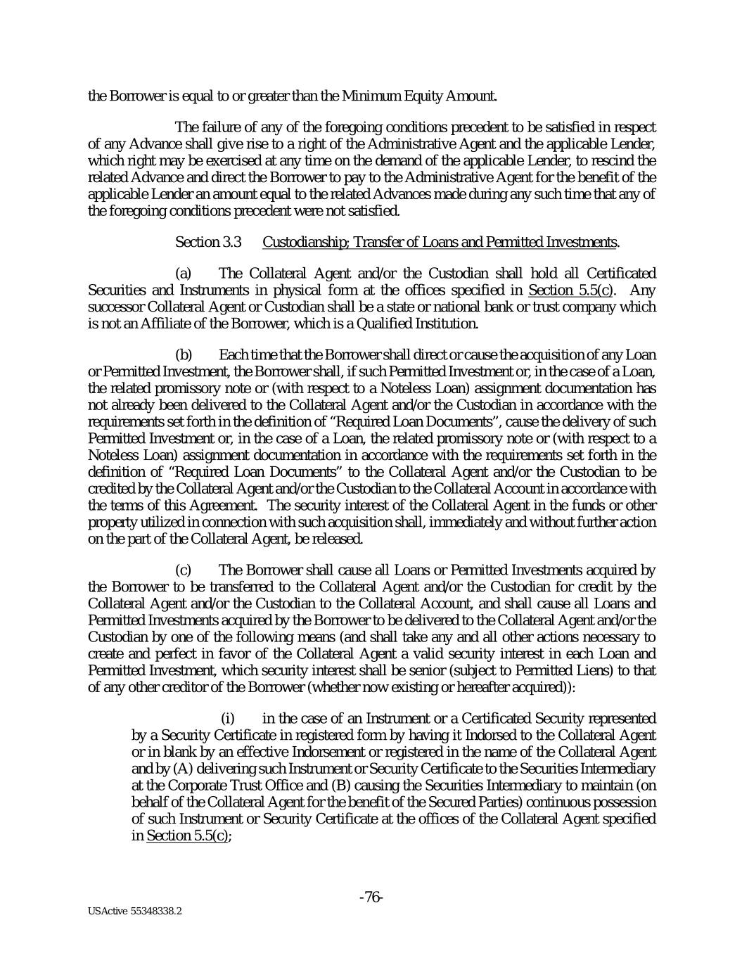 the Borrower is equal to or greater than the Minimum Equity Amount. The failure of any of the foregoing conditions precedent to be satisfied in respect of any Advance shall give rise to a right of the Administrative Agent and the applicable Lender, which right may be exercised at any time on the demand of the applicable Lender, to rescind the related Advance and direct the Borrower to pay to the Administrative Agent for the benefit of the applicable Lender an amount equal to the related Advances made during any such time that any of the foregoing conditions precedent were not satisfied. Section 3.3 Custodianship; Transfer of Loans and Permitted Investments. (a) The Collateral Agent and/or the Custodian shall hold all Certificated Securities and Instruments in physical form at the offices specified in Section 5.5(c). Any successor Collateral Agent or Custodian shall be a state or national bank or trust company which is not an Affiliate of the Borrower, which is a Qualified Institution. (b) Each time that the Borrower shall direct or cause the acquisition of any Loan or Permitted Investment, the Borrower shall, if such Permitted Investment or, in the case of a Loan, the related promissory note or (with respect to a Noteless Loan) assignment documentation has not already been delivered to the Collateral Agent and/or the Custodian in accordance with the requirements set forth in the definition of “Required Loan Documents”, cause the delivery of such Permitted Investment or, in the case of a Loan, the related promissory note or (with respect to a Noteless Loan) assignment documentation in accordance with the requirements set forth in the definition of “Required Loan Documents” to the Collateral Agent and/or the Custodian to be credited by the Collateral Agent and/or the Custodian to the Collateral Account in accordance with the terms of this Agreement. The security interest of the Collateral Agent in the funds or other property utilized in connection with such acquisition shall, immediately and without further action on the part of the Collateral Agent, be released. (c) The Borrower shall cause all Loans or Permitted Investments acquired by the Borrower to be transferred to the Collateral Agent and/or the Custodian for credit by the Collateral Agent and/or the Custodian to the Collateral Account, and shall cause all Loans and Permitted Investments acquired by the Borrower to be delivered to the Collateral Agent and/or the Custodian by one of the following means (and shall take any and all other actions necessary to create and perfect in favor of the Collateral Agent a valid security interest in each Loan and Permitted Investment, which security interest shall be senior (subject to Permitted Liens) to that of any other creditor of the Borrower (whether now existing or hereafter acquired)): (i) in the case of an Instrument or a Certificated Security represented by a Security Certificate in registered form by having it Indorsed to the Collateral Agent or in blank by an effective Indorsement or registered in the name of the Collateral Agent and by (A) delivering such Instrument or Security Certificate to the Securities Intermediary at the Corporate Trust Office and (B) causing the Securities Intermediary to maintain (on behalf of the Collateral Agent for the benefit of the Secured Parties) continuous possession of such Instrument or Security Certificate at the offices of the Collateral Agent specified in Section 5.5(c); -76- USActive 55348338.2