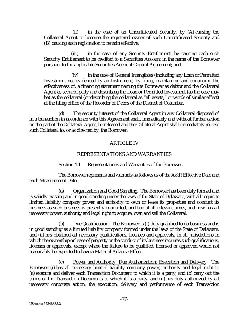 (ii) in the case of an Uncertificated Security, by (A) causing the Collateral Agent to become the registered owner of such Uncertificated Security and (B) causing such registration to remain effective; (iii) in the case of any Security Entitlement, by causing each such Security Entitlement to be credited to a Securities Account in the name of the Borrower pursuant to the applicable Securities Account Control Agreement; and (iv) in the case of General Intangibles (including any Loan or Permitted Investment not evidenced by an Instrument) by filing, maintaining and continuing the effectiveness of, a financing statement naming the Borrower as debtor and the Collateral Agent as secured party and describing the Loan or Permitted Investment (as the case may be) as the collateral (or describing the collateral as “all assets,” or words of similar effect) at the filing office of the Recorder of Deeds of the District of Columbia. (d) The security interest of the Collateral Agent in any Collateral disposed of in a transaction in accordance with this Agreement shall, immediately and without further action on the part of the Collateral Agent, be released and the Collateral Agent shall immediately release such Collateral to, or as directed by, the Borrower. ARTICLE IV REPRESENTATIONS AND WARRANTIES Section 4.1 Representations and Warranties of the Borrower. The Borrower represents and warrants as follows as of the A&R Effective Date and each Measurement Date: (a) Organization and Good Standing. The Borrower has been duly formed and is validly existing and in good standing under the laws of the State of Delaware, with all requisite limited liability company power and authority to own or lease its properties and conduct its business as such business is presently conducted, and had at all relevant times, and now has all necessary power, authority and legal right to acquire, own and sell the Collateral. (b) Due Qualification. The Borrower is (i) duly qualified to do business and is in good standing as a limited liability company formed under the laws of the State of Delaware, and (ii) has obtained all necessary qualifications, licenses and approvals, in all jurisdictions in which the ownership or lease of property or the conduct of its business requires such qualifications, licenses or approvals, except where the failure to be qualified, licensed or approved would not reasonably be expected to have a Material Adverse Effect. (c) Power and Authority; Due Authorization; Execution and Delivery. The Borrower (i) has all necessary limited liability company power, authority and legal right to (a) execute and deliver each Transaction Document to which it is a party, and (b) carry out the terms of the Transaction Documents to which it is a party, and (ii) has duly authorized by all necessary corporate action, the execution, delivery and performance of each Transaction -77- USActive 55348338.2