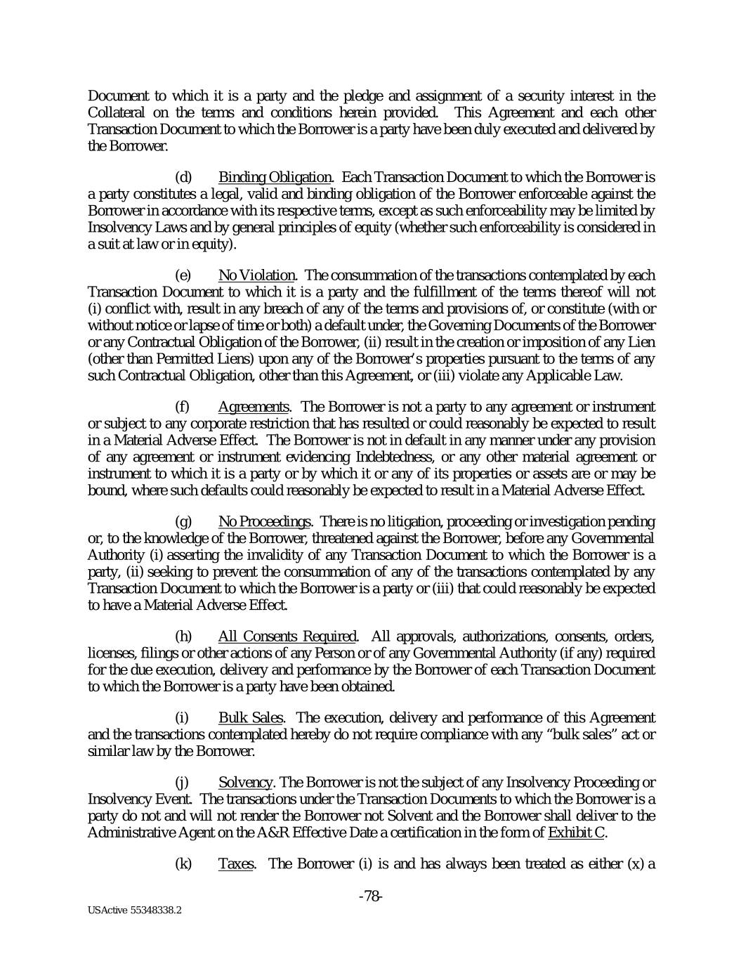 Document to which it is a party and the pledge and assignment of a security interest in the Collateral on the terms and conditions herein provided. This Agreement and each other Transaction Document to which the Borrower is a party have been duly executed and delivered by the Borrower. (d) Binding Obligation. Each Transaction Document to which the Borrower is a party constitutes a legal, valid and binding obligation of the Borrower enforceable against the Borrower in accordance with its respective terms, except as such enforceability may be limited by Insolvency Laws and by general principles of equity (whether such enforceability is considered in a suit at law or in equity). (e) No Violation. The consummation of the transactions contemplated by each Transaction Document to which it is a party and the fulfillment of the terms thereof will not (i) conflict with, result in any breach of any of the terms and provisions of, or constitute (with or without notice or lapse of time or both) a default under, the Governing Documents of the Borrower or any Contractual Obligation of the Borrower, (ii) result in the creation or imposition of any Lien (other than Permitted Liens) upon any of the Borrower’s properties pursuant to the terms of any such Contractual Obligation, other than this Agreement, or (iii) violate any Applicable Law. (f) Agreements. The Borrower is not a party to any agreement or instrument or subject to any corporate restriction that has resulted or could reasonably be expected to result in a Material Adverse Effect. The Borrower is not in default in any manner under any provision of any agreement or instrument evidencing Indebtedness, or any other material agreement or instrument to which it is a party or by which it or any of its properties or assets are or may be bound, where such defaults could reasonably be expected to result in a Material Adverse Effect. (g) No Proceedings. There is no litigation, proceeding or investigation pending or, to the knowledge of the Borrower, threatened against the Borrower, before any Governmental Authority (i) asserting the invalidity of any Transaction Document to which the Borrower is a party, (ii) seeking to prevent the consummation of any of the transactions contemplated by any Transaction Document to which the Borrower is a party or (iii) that could reasonably be expected to have a Material Adverse Effect. (h) All Consents Required. All approvals, authorizations, consents, orders, licenses, filings or other actions of any Person or of any Governmental Authority (if any) required for the due execution, delivery and performance by the Borrower of each Transaction Document to which the Borrower is a party have been obtained. (i) Bulk Sales. The execution, delivery and performance of this Agreement and the transactions contemplated hereby do not require compliance with any “bulk sales” act or similar law by the Borrower. (j) Solvency. The Borrower is not the subject of any Insolvency Proceeding or Insolvency Event. The transactions under the Transaction Documents to which the Borrower is a party do not and will not render the Borrower not Solvent and the Borrower shall deliver to the Administrative Agent on the A&R Effective Date a certification in the form of Exhibit C. (k) Taxes. The Borrower (i) is and has always been treated as either (x) a -78- USActive 55348338.2
