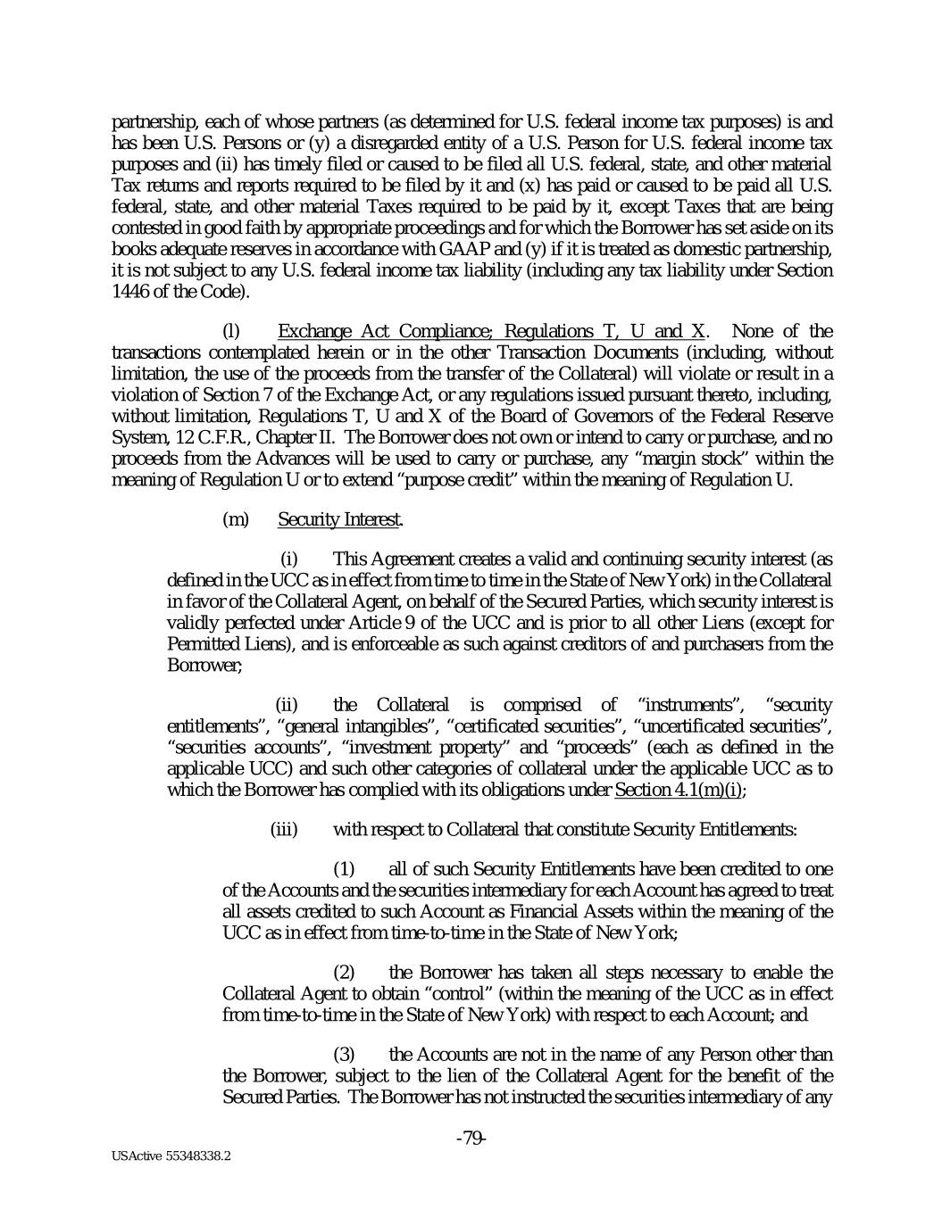 partnership, each of whose partners (as determined for U.S. federal income tax purposes) is and has been U.S. Persons or (y) a disregarded entity of a U.S. Person for U.S. federal income tax purposes and (ii) has timely filed or caused to be filed all U.S. federal, state, and other material Tax returns and reports required to be filed by it and (x) has paid or caused to be paid all U.S. federal, state, and other material Taxes required to be paid by it, except Taxes that are being contested in good faith by appropriate proceedings and for which the Borrower has set aside on its books adequate reserves in accordance with GAAP and (y) if it is treated as domestic partnership, it is not subject to any U.S. federal income tax liability (including any tax liability under Section 1446 of the Code). (l) Exchange Act Compliance; Regulations T, U and X. None of the transactions contemplated herein or in the other Transaction Documents (including, without limitation, the use of the proceeds from the transfer of the Collateral) will violate or result in a violation of Section 7 of the Exchange Act, or any regulations issued pursuant thereto, including, without limitation, Regulations T, U and X of the Board of Governors of the Federal Reserve System, 12 C.F.R., Chapter II. The Borrower does not own or intend to carry or purchase, and no proceeds from the Advances will be used to carry or purchase, any “margin stock” within the meaning of Regulation U or to extend “purpose credit” within the meaning of Regulation U. (m) Security Interest. (i) This Agreement creates a valid and continuing security interest (as defined in the UCC as in effect from time to time in the State of New York) in the Collateral in favor of the Collateral Agent, on behalf of the Secured Parties, which security interest is validly perfected under Article 9 of the UCC and is prior to all other Liens (except for Permitted Liens), and is enforceable as such against creditors of and purchasers from the Borrower; (ii) the Collateral is comprised of “instruments”, “security entitlements”, “general intangibles”, “certificated securities”, “uncertificated securities”, “securities accounts”, “investment property” and “proceeds” (each as defined in the applicable UCC) and such other categories of collateral under the applicable UCC as to which the Borrower has complied with its obligations under Section 4.1(m)(i); (iii) with respect to Collateral that constitute Security Entitlements: (1) all of such Security Entitlements have been credited to one of the Accounts and the securities intermediary for each Account has agreed to treat all assets credited to such Account as Financial Assets within the meaning of the UCC as in effect from time-to-time in the State of New York; (2) the Borrower has taken all steps necessary to enable the Collateral Agent to obtain “control” (within the meaning of the UCC as in effect from time-to-time in the State of New York) with respect to each Account; and (3) the Accounts are not in the name of any Person other than the Borrower, subject to the lien of the Collateral Agent for the benefit of the Secured Parties. The Borrower has not instructed the securities intermediary of any -79- USActive 55348338.2