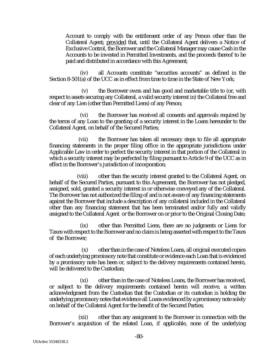 Account to comply with the entitlement order of any Person other than the Collateral Agent; provided that, until the Collateral Agent delivers a Notice of Exclusive Control, the Borrower and the Collateral Manager may cause Cash in the Accounts to be invested in Permitted Investments, and the proceeds thereof to be paid and distributed in accordance with this Agreement; (iv) all Accounts constitute “securities accounts” as defined in the Section 8-501(a) of the UCC as in effect from time to time in the State of New York; (v) the Borrower owns and has good and marketable title to (or, with respect to assets securing any Collateral, a valid security interest in) the Collateral free and clear of any Lien (other than Permitted Liens) of any Person; (vi) the Borrower has received all consents and approvals required by the terms of any Loan to the granting of a security interest in the Loans hereunder to the Collateral Agent, on behalf of the Secured Parties; (vii) the Borrower has taken all necessary steps to file all appropriate financing statements in the proper filing office in the appropriate jurisdictions under Applicable Law in order to perfect the security interest in that portion of the Collateral in which a security interest may be perfected by filing pursuant to Article 9 of the UCC as in effect in the Borrower’s jurisdiction of incorporation; (viii) other than the security interest granted to the Collateral Agent, on behalf of the Secured Parties, pursuant to this Agreement, the Borrower has not pledged, assigned, sold, granted a security interest in or otherwise conveyed any of the Collateral. The Borrower has not authorized the filing of and is not aware of any financing statements against the Borrower that include a description of any collateral included in the Collateral other than any financing statement that has been terminated and/or fully and validly assigned to the Collateral Agent or the Borrower on or prior to the Original Closing Date; (ix) other than Permitted Liens, there are no judgments or Liens for Taxes with respect to the Borrower and no claim is being asserted with respect to the Taxes of the Borrower; (x) other than in the case of Noteless Loans, all original executed copies of each underlying promissory note that constitute or evidence each Loan that is evidenced by a promissory note has been or, subject to the delivery requirements contained herein, will be delivered to the Custodian; (xi) other than in the case of Noteless Loans, the Borrower has received, or subject to the delivery requirements contained herein will receive, a written acknowledgment from the Custodian that the Custodian or its custodian is holding the underlying promissory notes that evidence all Loans evidenced by a promissory note solely on behalf of the Collateral Agent for the benefit of the Secured Parties; (xii) other than any assignment to the Borrower in connection with the Borrower’s acquisition of the related Loan, if applicable, none of the underlying -80- USActive 55348338.2