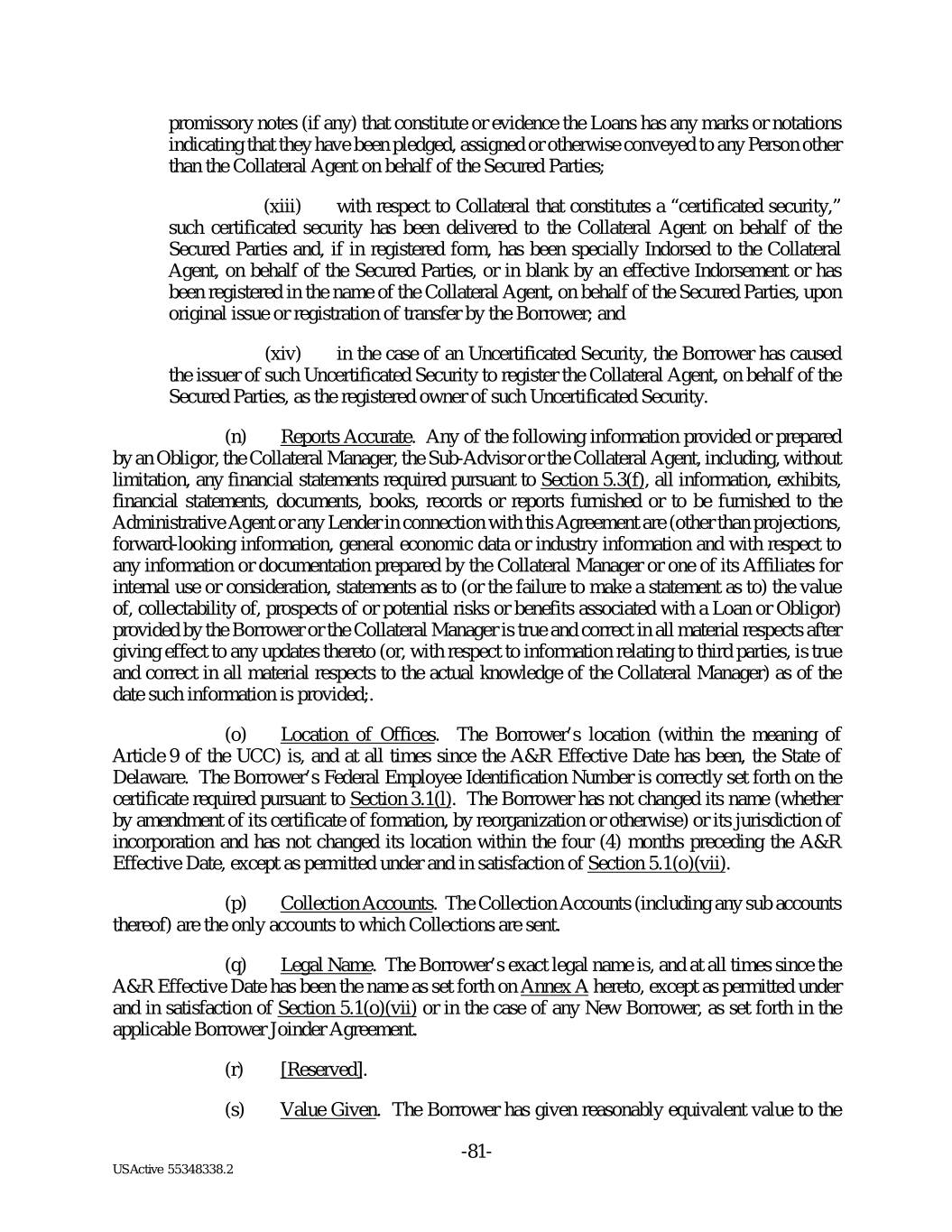 promissory notes (if any) that constitute or evidence the Loans has any marks or notations indicating that they have been pledged, assigned or otherwise conveyed to any Person other than the Collateral Agent on behalf of the Secured Parties; (xiii) with respect to Collateral that constitutes a “certificated security,” such certificated security has been delivered to the Collateral Agent on behalf of the Secured Parties and, if in registered form, has been specially Indorsed to the Collateral Agent, on behalf of the Secured Parties, or in blank by an effective Indorsement or has been registered in the name of the Collateral Agent, on behalf of the Secured Parties, upon original issue or registration of transfer by the Borrower; and (xiv) in the case of an Uncertificated Security, the Borrower has caused the issuer of such Uncertificated Security to register the Collateral Agent, on behalf of the Secured Parties, as the registered owner of such Uncertificated Security. (n) Reports Accurate. Any of the following information provided or prepared by an Obligor, the Collateral Manager, the Sub-Advisor or the Collateral Agent, including, without limitation, any financial statements required pursuant to Section 5.3(f), all information, exhibits, financial statements, documents, books, records or reports furnished or to be furnished to the Administrative Agent or any Lender in connection with this Agreement are (other than projections, forward-looking information, general economic data or industry information and with respect to any information or documentation prepared by the Collateral Manager or one of its Affiliates for internal use or consideration, statements as to (or the failure to make a statement as to) the value of, collectability of, prospects of or potential risks or benefits associated with a Loan or Obligor) provided by the Borrower or the Collateral Manager is true and correct in all material respects after giving effect to any updates thereto (or, with respect to information relating to third parties, is true and correct in all material respects to the actual knowledge of the Collateral Manager) as of the date such information is provided;. (o) Location of Offices. The Borrower’s location (within the meaning of Article 9 of the UCC) is, and at all times since the A&R Effective Date has been, the State of Delaware. The Borrower’s Federal Employee Identification Number is correctly set forth on the certificate required pursuant to Section 3.1(l). The Borrower has not changed its name (whether by amendment of its certificate of formation, by reorganization or otherwise) or its jurisdiction of incorporation and has not changed its location within the four (4) months preceding the A&R Effective Date, except as permitted under and in satisfaction of Section 5.1(o)(vii). (p) Collection Accounts. The Collection Accounts (including any sub accounts thereof) are the only accounts to which Collections are sent. (q) Legal Name. The Borrower’s exact legal name is, and at all times since the A&R Effective Date has been the name as set forth on Annex A hereto, except as permitted under and in satisfaction of Section 5.1(o)(vii) or in the case of any New Borrower, as set forth in the applicable Borrower Joinder Agreement. (r) [Reserved]. (s) Value Given. The Borrower has given reasonably equivalent value to the -81- USActive 55348338.2
