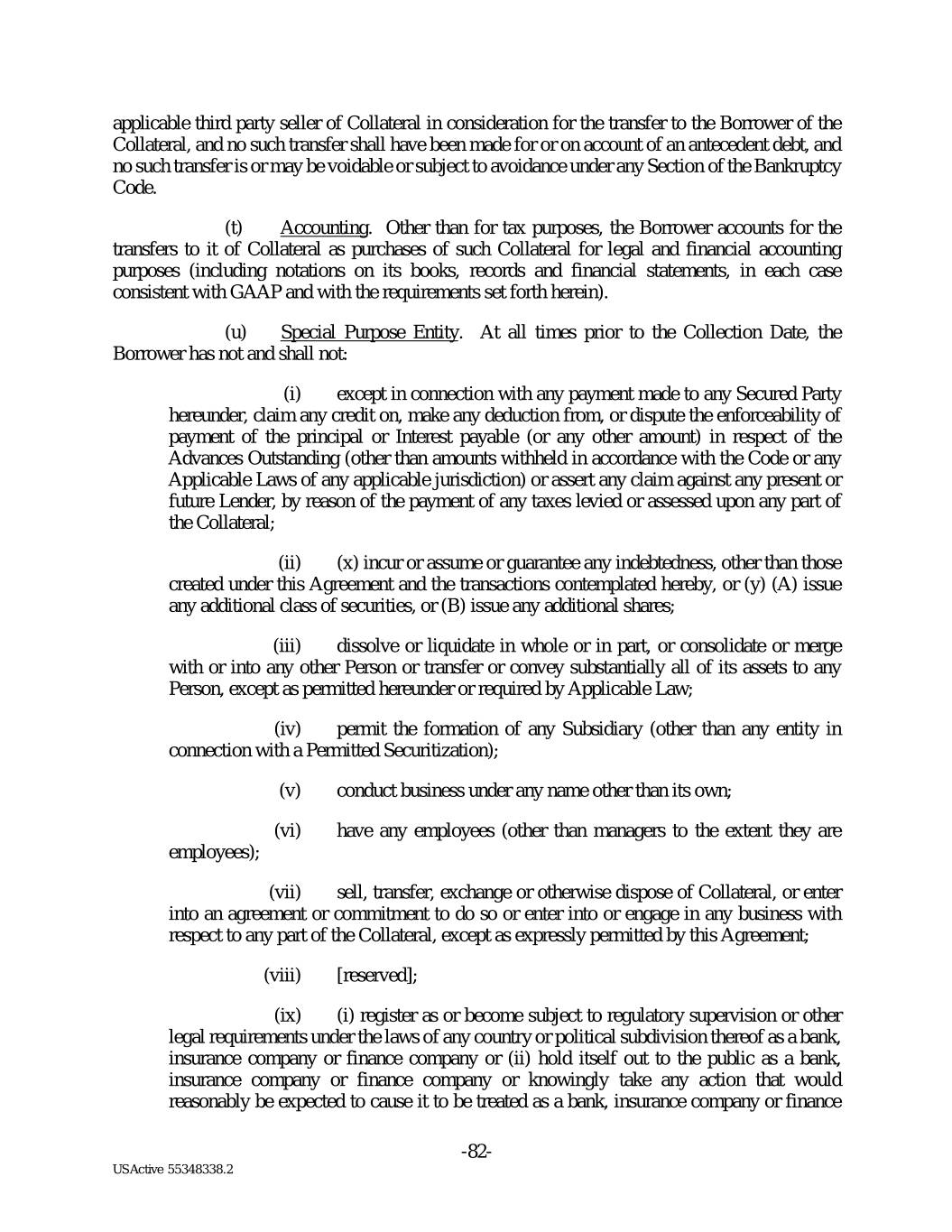 applicable third party seller of Collateral in consideration for the transfer to the Borrower of the Collateral, and no such transfer shall have been made for or on account of an antecedent debt, and no such transfer is or may be voidable or subject to avoidance under any Section of the Bankruptcy Code. (t) Accounting. Other than for tax purposes, the Borrower accounts for the transfers to it of Collateral as purchases of such Collateral for legal and financial accounting purposes (including notations on its books, records and financial statements, in each case consistent with GAAP and with the requirements set forth herein). (u) Special Purpose Entity. At all times prior to the Collection Date, the Borrower has not and shall not: (i) except in connection with any payment made to any Secured Party hereunder, claim any credit on, make any deduction from, or dispute the enforceability of payment of the principal or Interest payable (or any other amount) in respect of the Advances Outstanding (other than amounts withheld in accordance with the Code or any Applicable Laws of any applicable jurisdiction) or assert any claim against any present or future Lender, by reason of the payment of any taxes levied or assessed upon any part of the Collateral; (ii) (x) incur or assume or guarantee any indebtedness, other than those created under this Agreement and the transactions contemplated hereby, or (y) (A) issue any additional class of securities, or (B) issue any additional shares; (iii) dissolve or liquidate in whole or in part, or consolidate or merge with or into any other Person or transfer or convey substantially all of its assets to any Person, except as permitted hereunder or required by Applicable Law; (iv) permit the formation of any Subsidiary (other than any entity in connection with a Permitted Securitization); (v) conduct business under any name other than its own; (vi) have any employees (other than managers to the extent they are employees); (vii) sell, transfer, exchange or otherwise dispose of Collateral, or enter into an agreement or commitment to do so or enter into or engage in any business with respect to any part of the Collateral, except as expressly permitted by this Agreement; (viii) [reserved]; (ix) (i) register as or become subject to regulatory supervision or other legal requirements under the laws of any country or political subdivision thereof as a bank, insurance company or finance company or (ii) hold itself out to the public as a bank, insurance company or finance company or knowingly take any action that would reasonably be expected to cause it to be treated as a bank, insurance company or finance -82- USActive 55348338.2