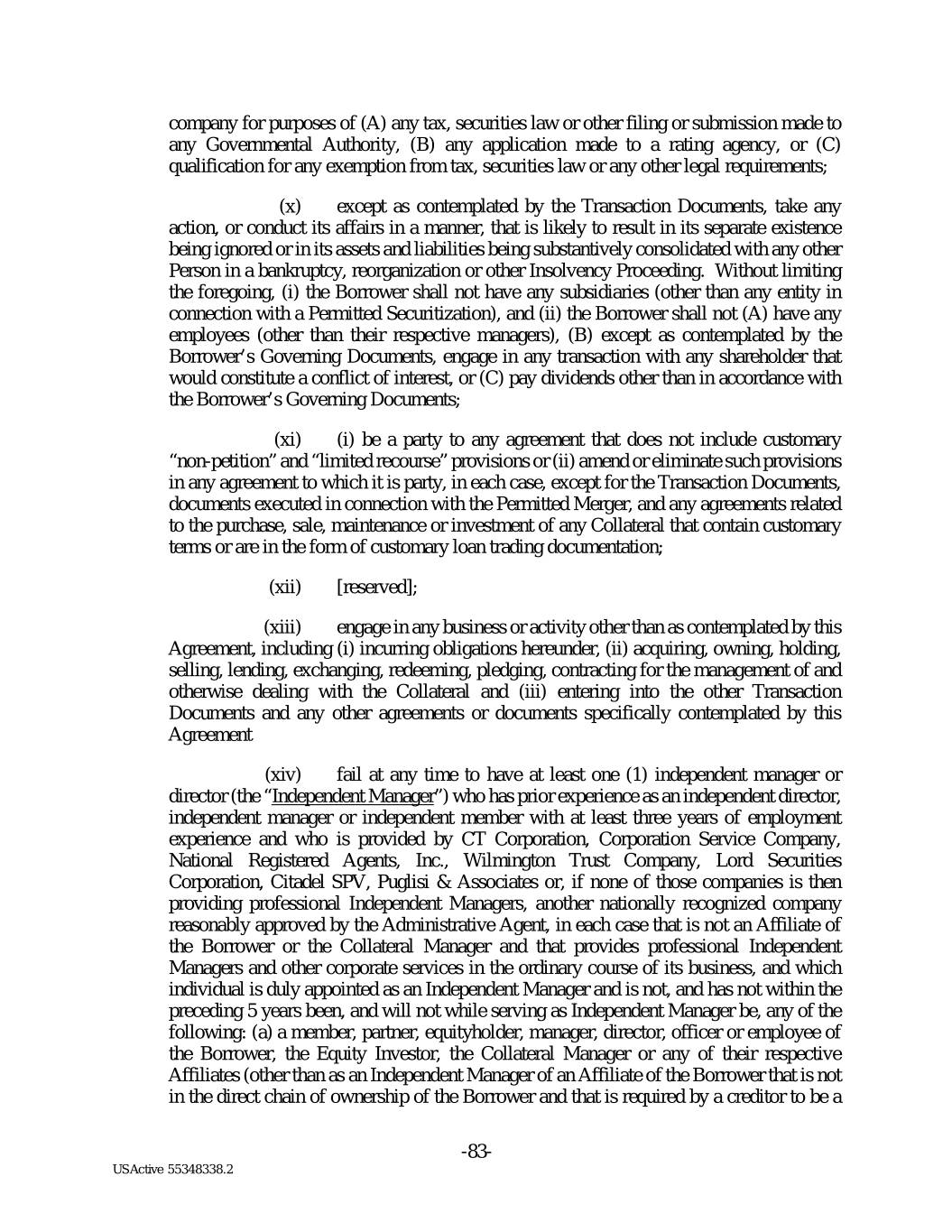 company for purposes of (A) any tax, securities law or other filing or submission made to any Governmental Authority, (B) any application made to a rating agency, or (C) qualification for any exemption from tax, securities law or any other legal requirements; (x) except as contemplated by the Transaction Documents, take any action, or conduct its affairs in a manner, that is likely to result in its separate existence being ignored or in its assets and liabilities being substantively consolidated with any other Person in a bankruptcy, reorganization or other Insolvency Proceeding. Without limiting the foregoing, (i) the Borrower shall not have any subsidiaries (other than any entity in connection with a Permitted Securitization), and (ii) the Borrower shall not (A) have any employees (other than their respective managers), (B) except as contemplated by the Borrower’s Governing Documents, engage in any transaction with any shareholder that would constitute a conflict of interest, or (C) pay dividends other than in accordance with the Borrower’s Governing Documents; (xi) (i) be a party to any agreement that does not include customary “non-petition” and “limited recourse” provisions or (ii) amend or eliminate such provisions in any agreement to which it is party, in each case, except for the Transaction Documents, documents executed in connection with the Permitted Merger, and any agreements related to the purchase, sale, maintenance or investment of any Collateral that contain customary terms or are in the form of customary loan trading documentation; (xii) [reserved]; (xiii) engage in any business or activity other than as contemplated by this Agreement, including (i) incurring obligations hereunder, (ii) acquiring, owning, holding, selling, lending, exchanging, redeeming, pledging, contracting for the management of and otherwise dealing with the Collateral and (iii) entering into the other Transaction Documents and any other agreements or documents specifically contemplated by this Agreement (xiv) fail at any time to have at least one (1) independent manager or director (the “Independent Manager”) who has prior experience as an independent director, independent manager or independent member with at least three years of employment experience and who is provided by CT Corporation, Corporation Service Company, National Registered Agents, Inc., Wilmington Trust Company, Lord Securities Corporation, Citadel SPV, Puglisi & Associates or, if none of those companies is then providing professional Independent Managers, another nationally recognized company reasonably approved by the Administrative Agent, in each case that is not an Affiliate of the Borrower or the Collateral Manager and that provides professional Independent Managers and other corporate services in the ordinary course of its business, and which individual is duly appointed as an Independent Manager and is not, and has not within the preceding 5 years been, and will not while serving as Independent Manager be, any of the following: (a) a member, partner, equityholder, manager, director, officer or employee of the Borrower, the Equity Investor, the Collateral Manager or any of their respective Affiliates (other than as an Independent Manager of an Affiliate of the Borrower that is not in the direct chain of ownership of the Borrower and that is required by a creditor to be a -83- USActive 55348338.2