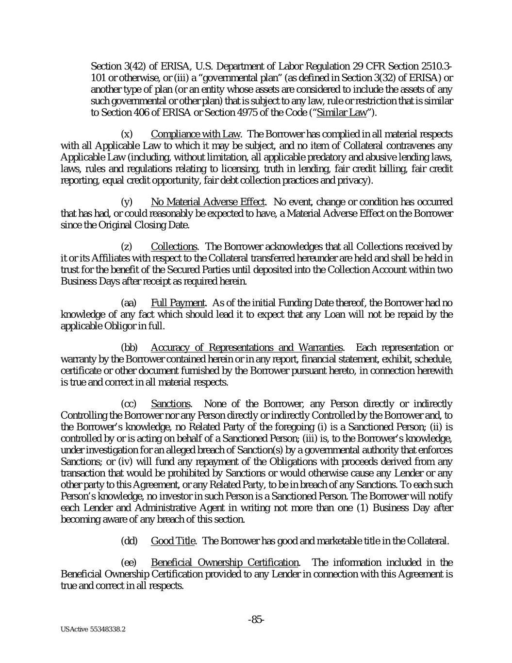 Section 3(42) of ERISA, U.S. Department of Labor Regulation 29 CFR Section 2510.3- 101 or otherwise, or (iii) a “governmental plan” (as defined in Section 3(32) of ERISA) or another type of plan (or an entity whose assets are considered to include the assets of any such governmental or other plan) that is subject to any law, rule or restriction that is similar to Section 406 of ERISA or Section 4975 of the Code (“Similar Law”). (x) Compliance with Law. The Borrower has complied in all material respects with all Applicable Law to which it may be subject, and no item of Collateral contravenes any Applicable Law (including, without limitation, all applicable predatory and abusive lending laws, laws, rules and regulations relating to licensing, truth in lending, fair credit billing, fair credit reporting, equal credit opportunity, fair debt collection practices and privacy). (y) No Material Adverse Effect. No event, change or condition has occurred that has had, or could reasonably be expected to have, a Material Adverse Effect on the Borrower since the Original Closing Date. (z) Collections. The Borrower acknowledges that all Collections received by it or its Affiliates with respect to the Collateral transferred hereunder are held and shall be held in trust for the benefit of the Secured Parties until deposited into the Collection Account within two Business Days after receipt as required herein. (aa) Full Payment. As of the initial Funding Date thereof, the Borrower had no knowledge of any fact which should lead it to expect that any Loan will not be repaid by the applicable Obligor in full. (bb) Accuracy of Representations and Warranties. Each representation or warranty by the Borrower contained herein or in any report, financial statement, exhibit, schedule, certificate or other document furnished by the Borrower pursuant hereto, in connection herewith is true and correct in all material respects. (cc) Sanctions. None of the Borrower, any Person directly or indirectly Controlling the Borrower nor any Person directly or indirectly Controlled by the Borrower and, to the Borrower’s knowledge, no Related Party of the foregoing (i) is a Sanctioned Person; (ii) is controlled by or is acting on behalf of a Sanctioned Person; (iii) is, to the Borrower’s knowledge, under investigation for an alleged breach of Sanction(s) by a governmental authority that enforces Sanctions; or (iv) will fund any repayment of the Obligations with proceeds derived from any transaction that would be prohibited by Sanctions or would otherwise cause any Lender or any other party to this Agreement, or any Related Party, to be in breach of any Sanctions. To each such Person’s knowledge, no investor in such Person is a Sanctioned Person. The Borrower will notify each Lender and Administrative Agent in writing not more than one (1) Business Day after becoming aware of any breach of this section. (dd) Good Title. The Borrower has good and marketable title in the Collateral. (ee) Beneficial Ownership Certification. The information included in the Beneficial Ownership Certification provided to any Lender in connection with this Agreement is true and correct in all respects. -85- USActive 55348338.2