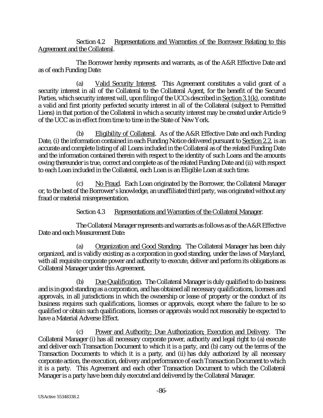 Section 4.2 Representations and Warranties of the Borrower Relating to this Agreement and the Collateral. The Borrower hereby represents and warrants, as of the A&R Effective Date and as of each Funding Date: (a) Valid Security Interest. This Agreement constitutes a valid grant of a security interest in all of the Collateral to the Collateral Agent, for the benefit of the Secured Parties, which security interest will, upon filing of the UCCs described in Section 3.1(k), constitute a valid and first priority perfected security interest in all of the Collateral (subject to Permitted Liens) in that portion of the Collateral in which a security interest may be created under Article 9 of the UCC as in effect from time to time in the State of New York. (b) Eligibility of Collateral. As of the A&R Effective Date and each Funding Date, (i) the information contained in each Funding Notice delivered pursuant to Section 2.2, is an accurate and complete listing of all Loans included in the Collateral as of the related Funding Date and the information contained therein with respect to the identity of such Loans and the amounts owing thereunder is true, correct and complete as of the related Funding Date and (ii) with respect to each Loan included in the Collateral, each Loan is an Eligible Loan at such time. (c) No Fraud. Each Loan originated by the Borrower, the Collateral Manager or, to the best of the Borrower’s knowledge, an unaffiliated third party, was originated without any fraud or material misrepresentation. Section 4.3 Representations and Warranties of the Collateral Manager. The Collateral Manager represents and warrants as follows as of the A&R Effective Date and each Measurement Date: (a) Organization and Good Standing. The Collateral Manager has been duly organized, and is validly existing as a corporation in good standing, under the laws of Maryland, with all requisite corporate power and authority to execute, deliver and perform its obligations as Collateral Manager under this Agreement. (b) Due Qualification. The Collateral Manager is duly qualified to do business and is in good standing as a corporation, and has obtained all necessary qualifications, licenses and approvals, in all jurisdictions in which the ownership or lease of property or the conduct of its business requires such qualifications, licenses or approvals, except where the failure to be so qualified or obtain such qualifications, licenses or approvals would not reasonably be expected to have a Material Adverse Effect. (c) Power and Authority; Due Authorization; Execution and Delivery. The Collateral Manager (i) has all necessary corporate power, authority and legal right to (a) execute and deliver each Transaction Document to which it is a party, and (b) carry out the terms of the Transaction Documents to which it is a party, and (ii) has duly authorized by all necessary corporate action, the execution, delivery and performance of each Transaction Document to which it is a party. This Agreement and each other Transaction Document to which the Collateral Manager is a party have been duly executed and delivered by the Collateral Manager. -86- USActive 55348338.2