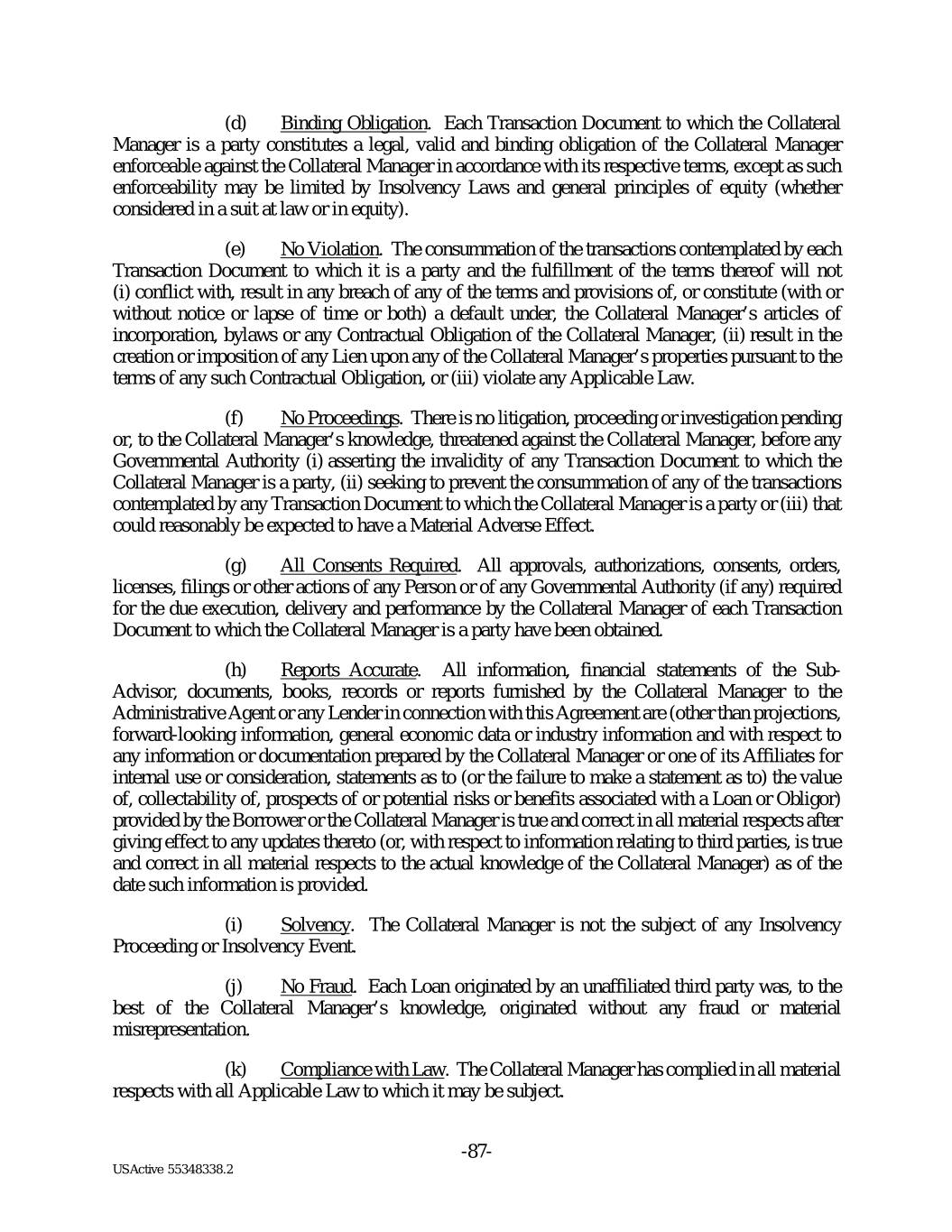 (d) Binding Obligation. Each Transaction Document to which the Collateral Manager is a party constitutes a legal, valid and binding obligation of the Collateral Manager enforceable against the Collateral Manager in accordance with its respective terms, except as such enforceability may be limited by Insolvency Laws and general principles of equity (whether considered in a suit at law or in equity). (e) No Violation. The consummation of the transactions contemplated by each Transaction Document to which it is a party and the fulfillment of the terms thereof will not (i) conflict with, result in any breach of any of the terms and provisions of, or constitute (with or without notice or lapse of time or both) a default under, the Collateral Manager’s articles of incorporation, bylaws or any Contractual Obligation of the Collateral Manager, (ii) result in the creation or imposition of any Lien upon any of the Collateral Manager’s properties pursuant to the terms of any such Contractual Obligation, or (iii) violate any Applicable Law. (f) No Proceedings. There is no litigation, proceeding or investigation pending or, to the Collateral Manager’s knowledge, threatened against the Collateral Manager, before any Governmental Authority (i) asserting the invalidity of any Transaction Document to which the Collateral Manager is a party, (ii) seeking to prevent the consummation of any of the transactions contemplated by any Transaction Document to which the Collateral Manager is a party or (iii) that could reasonably be expected to have a Material Adverse Effect. (g) All Consents Required. All approvals, authorizations, consents, orders, licenses, filings or other actions of any Person or of any Governmental Authority (if any) required for the due execution, delivery and performance by the Collateral Manager of each Transaction Document to which the Collateral Manager is a party have been obtained. (h) Reports Accurate. All information, financial statements of the Sub- Advisor, documents, books, records or reports furnished by the Collateral Manager to the Administrative Agent or any Lender in connection with this Agreement are (other than projections, forward-looking information, general economic data or industry information and with respect to any information or documentation prepared by the Collateral Manager or one of its Affiliates for internal use or consideration, statements as to (or the failure to make a statement as to) the value of, collectability of, prospects of or potential risks or benefits associated with a Loan or Obligor) provided by the Borrower or the Collateral Manager is true and correct in all material respects after giving effect to any updates thereto (or, with respect to information relating to third parties, is true and correct in all material respects to the actual knowledge of the Collateral Manager) as of the date such information is provided. (i) Solvency. The Collateral Manager is not the subject of any Insolvency Proceeding or Insolvency Event. (j) No Fraud. Each Loan originated by an unaffiliated third party was, to the best of the Collateral Manager’s knowledge, originated without any fraud or material misrepresentation. (k) Compliance with Law. The Collateral Manager has complied in all material respects with all Applicable Law to which it may be subject. -87- USActive 55348338.2