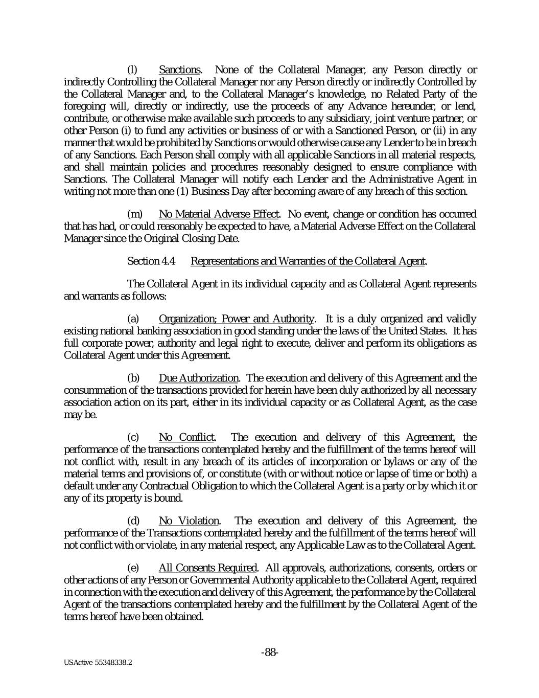 (l) Sanctions. None of the Collateral Manager, any Person directly or indirectly Controlling the Collateral Manager nor any Person directly or indirectly Controlled by the Collateral Manager and, to the Collateral Manager’s knowledge, no Related Party of the foregoing will, directly or indirectly, use the proceeds of any Advance hereunder, or lend, contribute, or otherwise make available such proceeds to any subsidiary, joint venture partner, or other Person (i) to fund any activities or business of or with a Sanctioned Person, or (ii) in any manner that would be prohibited by Sanctions or would otherwise cause any Lender to be in breach of any Sanctions. Each Person shall comply with all applicable Sanctions in all material respects, and shall maintain policies and procedures reasonably designed to ensure compliance with Sanctions. The Collateral Manager will notify each Lender and the Administrative Agent in writing not more than one (1) Business Day after becoming aware of any breach of this section. (m) No Material Adverse Effect. No event, change or condition has occurred that has had, or could reasonably be expected to have, a Material Adverse Effect on the Collateral Manager since the Original Closing Date. Section 4.4 Representations and Warranties of the Collateral Agent. The Collateral Agent in its individual capacity and as Collateral Agent represents and warrants as follows: (a) Organization; Power and Authority. It is a duly organized and validly existing national banking association in good standing under the laws of the United States. It has full corporate power, authority and legal right to execute, deliver and perform its obligations as Collateral Agent under this Agreement. (b) Due Authorization. The execution and delivery of this Agreement and the consummation of the transactions provided for herein have been duly authorized by all necessary association action on its part, either in its individual capacity or as Collateral Agent, as the case may be. (c) No Conflict. The execution and delivery of this Agreement, the performance of the transactions contemplated hereby and the fulfillment of the terms hereof will not conflict with, result in any breach of its articles of incorporation or bylaws or any of the material terms and provisions of, or constitute (with or without notice or lapse of time or both) a default under any Contractual Obligation to which the Collateral Agent is a party or by which it or any of its property is bound. (d) No Violation. The execution and delivery of this Agreement, the performance of the Transactions contemplated hereby and the fulfillment of the terms hereof will not conflict with or violate, in any material respect, any Applicable Law as to the Collateral Agent. (e) All Consents Required. All approvals, authorizations, consents, orders or other actions of any Person or Governmental Authority applicable to the Collateral Agent, required in connection with the execution and delivery of this Agreement, the performance by the Collateral Agent of the transactions contemplated hereby and the fulfillment by the Collateral Agent of the terms hereof have been obtained. -88- USActive 55348338.2