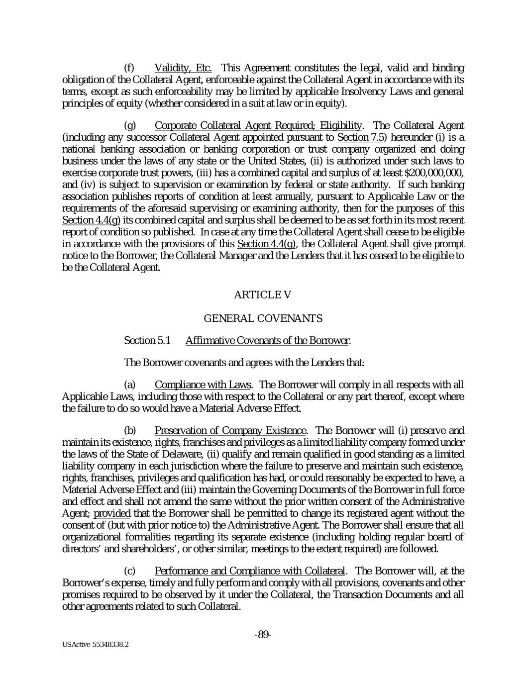 (f) Validity, Etc. This Agreement constitutes the legal, valid and binding obligation of the Collateral Agent, enforceable against the Collateral Agent in accordance with its terms, except as such enforceability may be limited by applicable Insolvency Laws and general principles of equity (whether considered in a suit at law or in equity). (g) Corporate Collateral Agent Required; Eligibility. The Collateral Agent (including any successor Collateral Agent appointed pursuant to Section 7.5) hereunder (i) is a national banking association or banking corporation or trust company organized and doing business under the laws of any state or the United States, (ii) is authorized under such laws to exercise corporate trust powers, (iii) has a combined capital and surplus of at least $200,000,000, and (iv) is subject to supervision or examination by federal or state authority. If such banking association publishes reports of condition at least annually, pursuant to Applicable Law or the requirements of the aforesaid supervising or examining authority, then for the purposes of this Section 4.4(g) its combined capital and surplus shall be deemed to be as set forth in its most recent report of condition so published. In case at any time the Collateral Agent shall cease to be eligible in accordance with the provisions of this Section 4.4(g), the Collateral Agent shall give prompt notice to the Borrower, the Collateral Manager and the Lenders that it has ceased to be eligible to be the Collateral Agent. ARTICLE V GENERAL COVENANTS Section 5.1 Affirmative Covenants of the Borrower. The Borrower covenants and agrees with the Lenders that: (a) Compliance with Laws. The Borrower will comply in all respects with all Applicable Laws, including those with respect to the Collateral or any part thereof, except where the failure to do so would have a Material Adverse Effect. (b) Preservation of Company Existence. The Borrower will (i) preserve and maintain its existence, rights, franchises and privileges as a limited liability company formed under the laws of the State of Delaware, (ii) qualify and remain qualified in good standing as a limited liability company in each jurisdiction where the failure to preserve and maintain such existence, rights, franchises, privileges and qualification has had, or could reasonably be expected to have, a Material Adverse Effect and (iii) maintain the Governing Documents of the Borrower in full force and effect and shall not amend the same without the prior written consent of the Administrative Agent; provided that the Borrower shall be permitted to change its registered agent without the consent of (but with prior notice to) the Administrative Agent. The Borrower shall ensure that all organizational formalities regarding its separate existence (including holding regular board of directors’ and shareholders’, or other similar, meetings to the extent required) are followed. (c) Performance and Compliance with Collateral. The Borrower will, at the Borrower’s expense, timely and fully perform and comply with all provisions, covenants and other promises required to be observed by it under the Collateral, the Transaction Documents and all other agreements related to such Collateral. -89- USActive 55348338.2