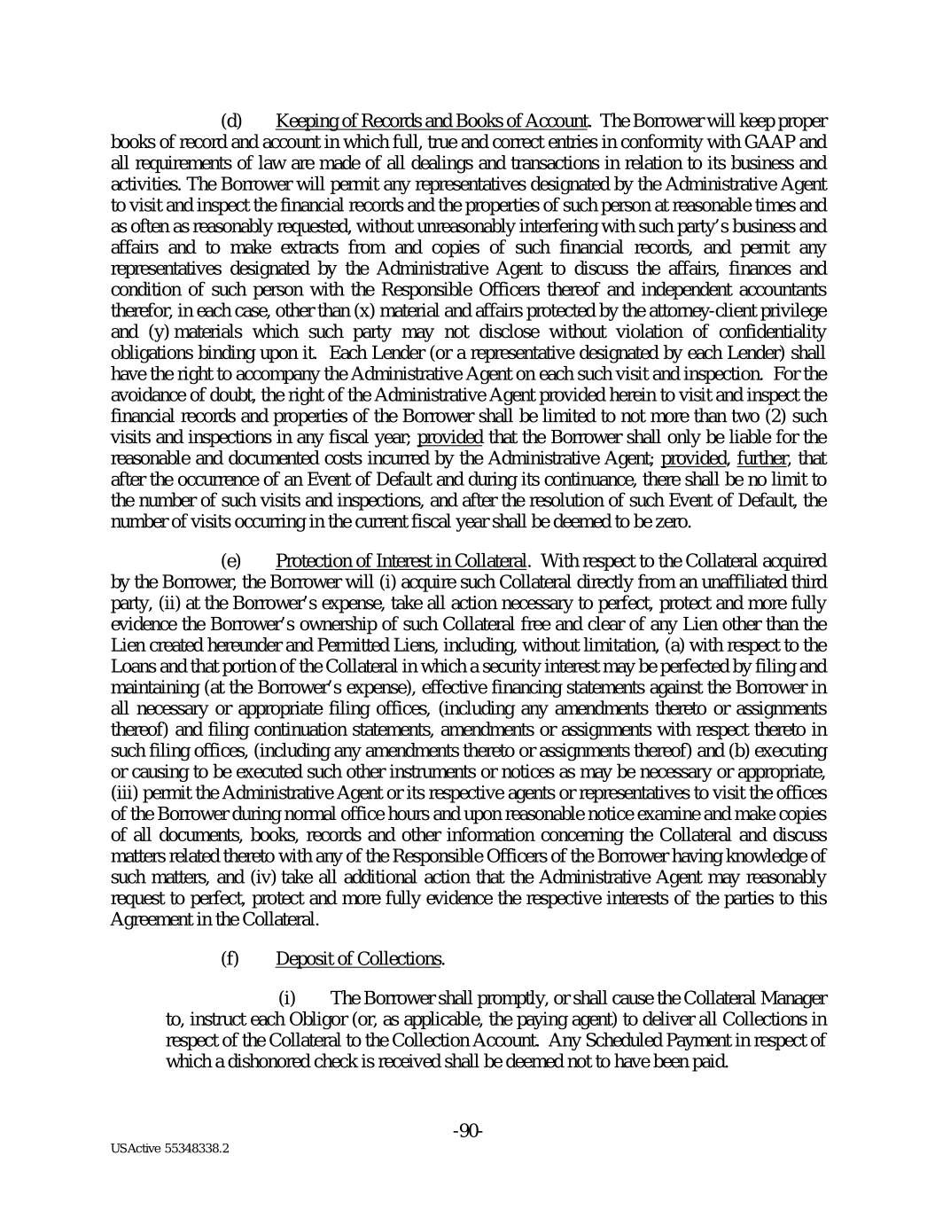 (d) Keeping of Records and Books of Account. The Borrower will keep proper books of record and account in which full, true and correct entries in conformity with GAAP and all requirements of law are made of all dealings and transactions in relation to its business and activities. The Borrower will permit any representatives designated by the Administrative Agent to visit and inspect the financial records and the properties of such person at reasonable times and as often as reasonably requested, without unreasonably interfering with such party’s business and affairs and to make extracts from and copies of such financial records, and permit any representatives designated by the Administrative Agent to discuss the affairs, finances and condition of such person with the Responsible Officers thereof and independent accountants therefor, in each case, other than (x) material and affairs protected by the attorney-client privilege and (y) materials which such party may not disclose without violation of confidentiality obligations binding upon it. Each Lender (or a representative designated by each Lender) shall have the right to accompany the Administrative Agent on each such visit and inspection. For the avoidance of doubt, the right of the Administrative Agent provided herein to visit and inspect the financial records and properties of the Borrower shall be limited to not more than two (2) such visits and inspections in any fiscal year; provided that the Borrower shall only be liable for the reasonable and documented costs incurred by the Administrative Agent; provided, further, that after the occurrence of an Event of Default and during its continuance, there shall be no limit to the number of such visits and inspections, and after the resolution of such Event of Default, the number of visits occurring in the current fiscal year shall be deemed to be zero. (e) Protection of Interest in Collateral. With respect to the Collateral acquired by the Borrower, the Borrower will (i) acquire such Collateral directly from an unaffiliated third party, (ii) at the Borrower’s expense, take all action necessary to perfect, protect and more fully evidence the Borrower’s ownership of such Collateral free and clear of any Lien other than the Lien created hereunder and Permitted Liens, including, without limitation, (a) with respect to the Loans and that portion of the Collateral in which a security interest may be perfected by filing and maintaining (at the Borrower’s expense), effective financing statements against the Borrower in all necessary or appropriate filing offices, (including any amendments thereto or assignments thereof) and filing continuation statements, amendments or assignments with respect thereto in such filing offices, (including any amendments thereto or assignments thereof) and (b) executing or causing to be executed such other instruments or notices as may be necessary or appropriate, (iii) permit the Administrative Agent or its respective agents or representatives to visit the offices of the Borrower during normal office hours and upon reasonable notice examine and make copies of all documents, books, records and other information concerning the Collateral and discuss matters related thereto with any of the Responsible Officers of the Borrower having knowledge of such matters, and (iv) take all additional action that the Administrative Agent may reasonably request to perfect, protect and more fully evidence the respective interests of the parties to this Agreement in the Collateral. (f) Deposit of Collections. (i) The Borrower shall promptly, or shall cause the Collateral Manager to, instruct each Obligor (or, as applicable, the paying agent) to deliver all Collections in respect of the Collateral to the Collection Account. Any Scheduled Payment in respect of which a dishonored check is received shall be deemed not to have been paid. -90- USActive 55348338.2