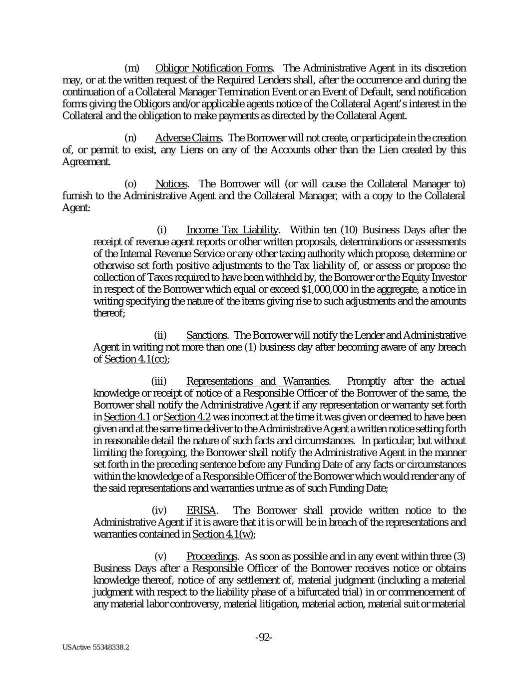 (m) Obligor Notification Forms. The Administrative Agent in its discretion may, or at the written request of the Required Lenders shall, after the occurrence and during the continuation of a Collateral Manager Termination Event or an Event of Default, send notification forms giving the Obligors and/or applicable agents notice of the Collateral Agent’s interest in the Collateral and the obligation to make payments as directed by the Collateral Agent. (n) Adverse Claims. The Borrower will not create, or participate in the creation of, or permit to exist, any Liens on any of the Accounts other than the Lien created by this Agreement. (o) Notices. The Borrower will (or will cause the Collateral Manager to) furnish to the Administrative Agent and the Collateral Manager, with a copy to the Collateral Agent: (i) Income Tax Liability. Within ten (10) Business Days after the receipt of revenue agent reports or other written proposals, determinations or assessments of the Internal Revenue Service or any other taxing authority which propose, determine or otherwise set forth positive adjustments to the Tax liability of, or assess or propose the collection of Taxes required to have been withheld by, the Borrower or the Equity Investor in respect of the Borrower which equal or exceed $1,000,000 in the aggregate, a notice in writing specifying the nature of the items giving rise to such adjustments and the amounts thereof; (ii) Sanctions. The Borrower will notify the Lender and Administrative Agent in writing not more than one (1) business day after becoming aware of any breach of Section 4.1(cc); (iii) Representations and Warranties. Promptly after the actual knowledge or receipt of notice of a Responsible Officer of the Borrower of the same, the Borrower shall notify the Administrative Agent if any representation or warranty set forth in Section 4.1 or Section 4.2 was incorrect at the time it was given or deemed to have been given and at the same time deliver to the Administrative Agent a written notice setting forth in reasonable detail the nature of such facts and circumstances. In particular, but without limiting the foregoing, the Borrower shall notify the Administrative Agent in the manner set forth in the preceding sentence before any Funding Date of any facts or circumstances within the knowledge of a Responsible Officer of the Borrower which would render any of the said representations and warranties untrue as of such Funding Date; (iv) ERISA. The Borrower shall provide written notice to the Administrative Agent if it is aware that it is or will be in breach of the representations and warranties contained in Section 4.1(w); (v) Proceedings. As soon as possible and in any event within three (3) Business Days after a Responsible Officer of the Borrower receives notice or obtains knowledge thereof, notice of any settlement of, material judgment (including a material judgment with respect to the liability phase of a bifurcated trial) in or commencement of any material labor controversy, material litigation, material action, material suit or material -92- USActive 55348338.2