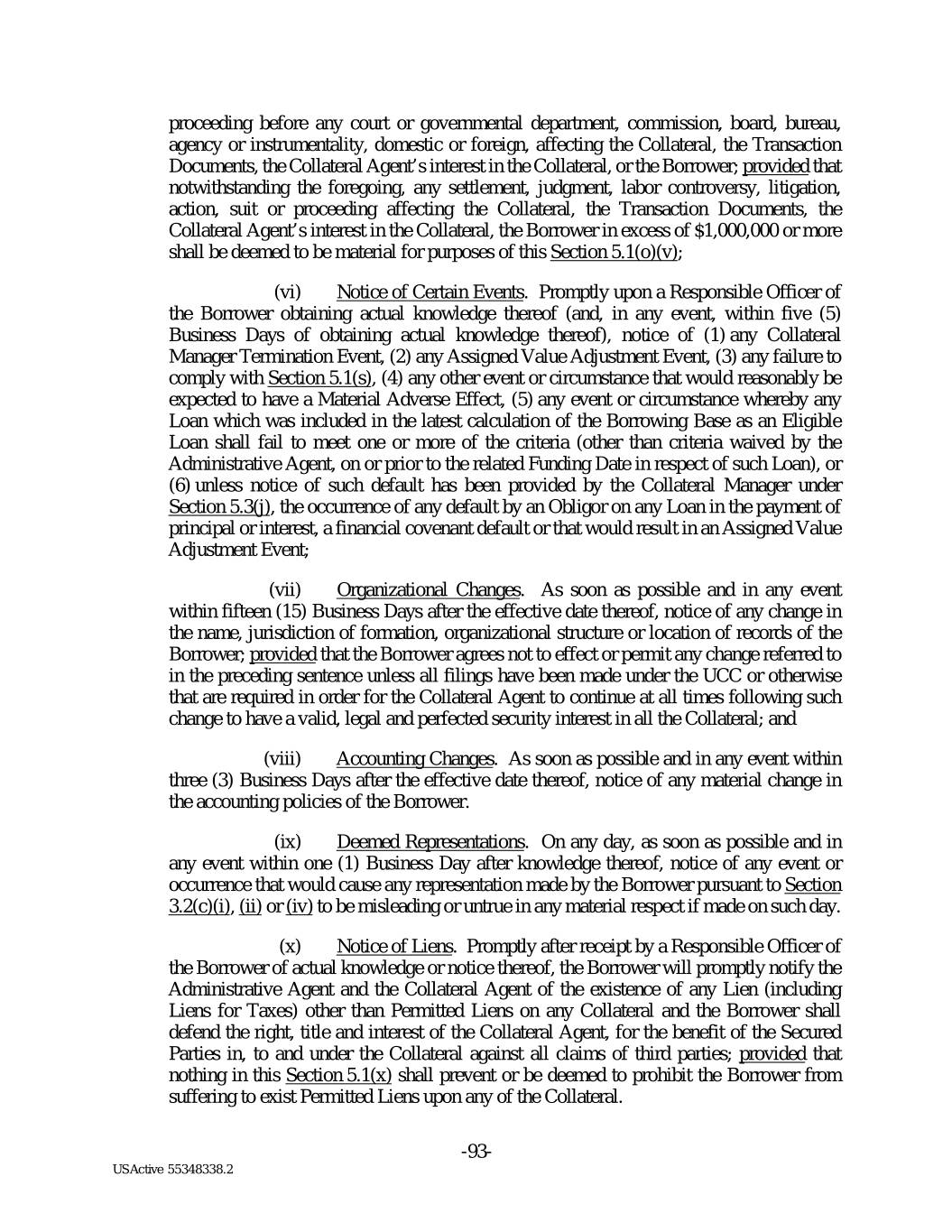 proceeding before any court or governmental department, commission, board, bureau, agency or instrumentality, domestic or foreign, affecting the Collateral, the Transaction Documents, the Collateral Agent’s interest in the Collateral, or the Borrower; provided that notwithstanding the foregoing, any settlement, judgment, labor controversy, litigation, action, suit or proceeding affecting the Collateral, the Transaction Documents, the Collateral Agent’s interest in the Collateral, the Borrower in excess of $1,000,000 or more shall be deemed to be material for purposes of this Section 5.1(o)(v); (vi) Notice of Certain Events. Promptly upon a Responsible Officer of the Borrower obtaining actual knowledge thereof (and, in any event, within five (5) Business Days of obtaining actual knowledge thereof), notice of (1) any Collateral Manager Termination Event, (2) any Assigned Value Adjustment Event, (3) any failure to comply with Section 5.1(s), (4) any other event or circumstance that would reasonably be expected to have a Material Adverse Effect, (5) any event or circumstance whereby any Loan which was included in the latest calculation of the Borrowing Base as an Eligible Loan shall fail to meet one or more of the criteria (other than criteria waived by the Administrative Agent, on or prior to the related Funding Date in respect of such Loan), or (6) unless notice of such default has been provided by the Collateral Manager under Section 5.3(j), the occurrence of any default by an Obligor on any Loan in the payment of principal or interest, a financial covenant default or that would result in an Assigned Value Adjustment Event; (vii) Organizational Changes. As soon as possible and in any event within fifteen (15) Business Days after the effective date thereof, notice of any change in the name, jurisdiction of formation, organizational structure or location of records of the Borrower; provided that the Borrower agrees not to effect or permit any change referred to in the preceding sentence unless all filings have been made under the UCC or otherwise that are required in order for the Collateral Agent to continue at all times following such change to have a valid, legal and perfected security interest in all the Collateral; and (viii) Accounting Changes. As soon as possible and in any event within three (3) Business Days after the effective date thereof, notice of any material change in the accounting policies of the Borrower. (ix) Deemed Representations. On any day, as soon as possible and in any event within one (1) Business Day after knowledge thereof, notice of any event or occurrence that would cause any representation made by the Borrower pursuant to Section 3.2(c)(i), (ii) or (iv) to be misleading or untrue in any material respect if made on such day. (x) Notice of Liens. Promptly after receipt by a Responsible Officer of the Borrower of actual knowledge or notice thereof, the Borrower will promptly notify the Administrative Agent and the Collateral Agent of the existence of any Lien (including Liens for Taxes) other than Permitted Liens on any Collateral and the Borrower shall defend the right, title and interest of the Collateral Agent, for the benefit of the Secured Parties in, to and under the Collateral against all claims of third parties; provided that nothing in this Section 5.1(x) shall prevent or be deemed to prohibit the Borrower from suffering to exist Permitted Liens upon any of the Collateral. -93- USActive 55348338.2
