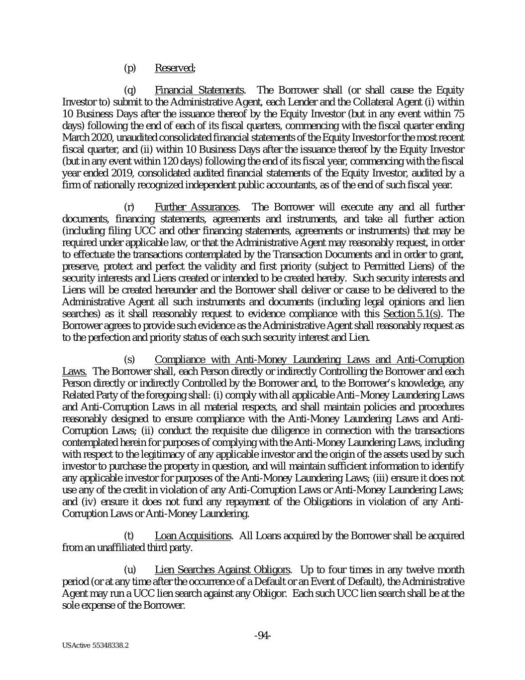 (p) Reserved; (q) Financial Statements. The Borrower shall (or shall cause the Equity Investor to) submit to the Administrative Agent, each Lender and the Collateral Agent (i) within 10 Business Days after the issuance thereof by the Equity Investor (but in any event within 75 days) following the end of each of its fiscal quarters, commencing with the fiscal quarter ending March 2020, unaudited consolidated financial statements of the Equity Investor for the most recent fiscal quarter, and (ii) within 10 Business Days after the issuance thereof by the Equity Investor (but in any event within 120 days) following the end of its fiscal year, commencing with the fiscal year ended 2019, consolidated audited financial statements of the Equity Investor, audited by a firm of nationally recognized independent public accountants, as of the end of such fiscal year. (r) Further Assurances. The Borrower will execute any and all further documents, financing statements, agreements and instruments, and take all further action (including filing UCC and other financing statements, agreements or instruments) that may be required under applicable law, or that the Administrative Agent may reasonably request, in order to effectuate the transactions contemplated by the Transaction Documents and in order to grant, preserve, protect and perfect the validity and first priority (subject to Permitted Liens) of the security interests and Liens created or intended to be created hereby. Such security interests and Liens will be created hereunder and the Borrower shall deliver or cause to be delivered to the Administrative Agent all such instruments and documents (including legal opinions and lien searches) as it shall reasonably request to evidence compliance with this Section 5.1(s). The Borrower agrees to provide such evidence as the Administrative Agent shall reasonably request as to the perfection and priority status of each such security interest and Lien. (s) Compliance with Anti-Money Laundering Laws and Anti-Corruption Laws. The Borrower shall, each Person directly or indirectly Controlling the Borrower and each Person directly or indirectly Controlled by the Borrower and, to the Borrower’s knowledge, any Related Party of the foregoing shall: (i) comply with all applicable Anti–Money Laundering Laws and Anti-Corruption Laws in all material respects, and shall maintain policies and procedures reasonably designed to ensure compliance with the Anti-Money Laundering Laws and Anti- Corruption Laws; (ii) conduct the requisite due diligence in connection with the transactions contemplated herein for purposes of complying with the Anti-Money Laundering Laws, including with respect to the legitimacy of any applicable investor and the origin of the assets used by such investor to purchase the property in question, and will maintain sufficient information to identify any applicable investor for purposes of the Anti-Money Laundering Laws; (iii) ensure it does not use any of the credit in violation of any Anti-Corruption Laws or Anti-Money Laundering Laws; and (iv) ensure it does not fund any repayment of the Obligations in violation of any Anti- Corruption Laws or Anti-Money Laundering. (t) Loan Acquisitions. All Loans acquired by the Borrower shall be acquired from an unaffiliated third party. (u) Lien Searches Against Obligors. Up to four times in any twelve month period (or at any time after the occurrence of a Default or an Event of Default), the Administrative Agent may run a UCC lien search against any Obligor. Each such UCC lien search shall be at the sole expense of the Borrower. -94- USActive 55348338.2
