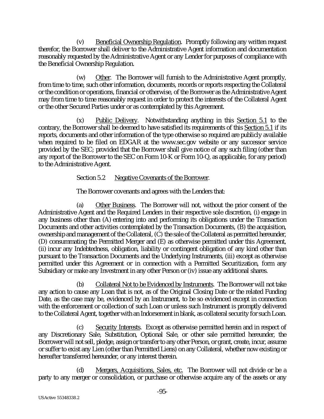 (v) Beneficial Ownership Regulation. Promptly following any written request therefor, the Borrower shall deliver to the Administrative Agent information and documentation reasonably requested by the Administrative Agent or any Lender for purposes of compliance with the Beneficial Ownership Regulation. (w) Other. The Borrower will furnish to the Administrative Agent promptly, from time to time, such other information, documents, records or reports respecting the Collateral or the condition or operations, financial or otherwise, of the Borrower as the Administrative Agent may from time to time reasonably request in order to protect the interests of the Collateral Agent or the other Secured Parties under or as contemplated by this Agreement. (x) Public Delivery. Notwithstanding anything in this Section 5.1 to the contrary, the Borrower shall be deemed to have satisfied its requirements of this Section 5.1 if its reports, documents and other information of the type otherwise so required are publicly available when required to be filed on EDGAR at the www.sec.gov website or any successor service provided by the SEC; provided that the Borrower shall give notice of any such filing (other than any report of the Borrower to the SEC on Form 10-K or Form 10-Q, as applicable, for any period) to the Administrative Agent. Section 5.2 Negative Covenants of the Borrower. The Borrower covenants and agrees with the Lenders that: (a) Other Business. The Borrower will not, without the prior consent of the Administrative Agent and the Required Lenders in their respective sole discretion, (i) engage in any business other than (A) entering into and performing its obligations under the Transaction Documents and other activities contemplated by the Transaction Documents, (B) the acquisition, ownership and management of the Collateral, (C) the sale of the Collateral as permitted hereunder, (D) consummating the Permitted Merger and (E) as otherwise permitted under this Agreement, (ii) incur any Indebtedness, obligation, liability or contingent obligation of any kind other than pursuant to the Transaction Documents and the Underlying Instruments, (iii) except as otherwise permitted under this Agreement or in connection with a Permitted Securitization, form any Subsidiary or make any Investment in any other Person or (iv) issue any additional shares. (b) Collateral Not to be Evidenced by Instruments. The Borrower will not take any action to cause any Loan that is not, as of the Original Closing Date or the related Funding Date, as the case may be, evidenced by an Instrument, to be so evidenced except in connection with the enforcement or collection of such Loan or unless such Instrument is promptly delivered to the Collateral Agent, together with an Indorsement in blank, as collateral security for such Loan. (c) Security Interests. Except as otherwise permitted herein and in respect of any Discretionary Sale, Substitution, Optional Sale, or other sale permitted hereunder, the Borrower will not sell, pledge, assign or transfer to any other Person, or grant, create, incur, assume or suffer to exist any Lien (other than Permitted Liens) on any Collateral, whether now existing or hereafter transferred hereunder, or any interest therein. (d) Mergers, Acquisitions, Sales, etc. The Borrower will not divide or be a party to any merger or consolidation, or purchase or otherwise acquire any of the assets or any -95- USActive 55348338.2