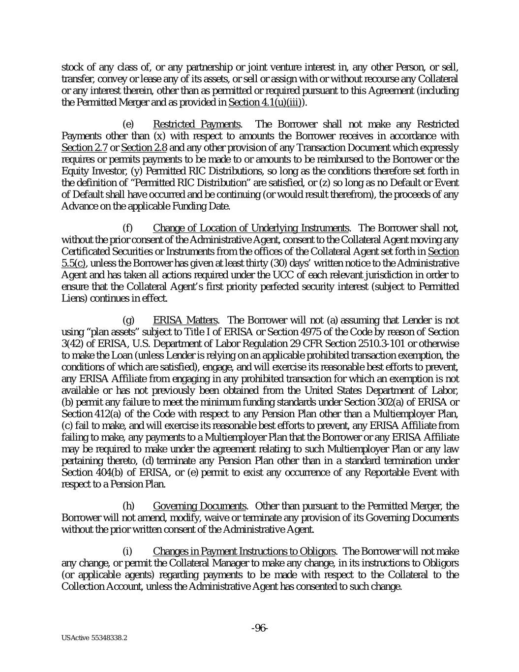 stock of any class of, or any partnership or joint venture interest in, any other Person, or sell, transfer, convey or lease any of its assets, or sell or assign with or without recourse any Collateral or any interest therein, other than as permitted or required pursuant to this Agreement (including the Permitted Merger and as provided in Section 4.1(u)(iii)). (e) Restricted Payments. The Borrower shall not make any Restricted Payments other than (x) with respect to amounts the Borrower receives in accordance with Section 2.7 or Section 2.8 and any other provision of any Transaction Document which expressly requires or permits payments to be made to or amounts to be reimbursed to the Borrower or the Equity Investor, (y) Permitted RIC Distributions, so long as the conditions therefore set forth in the definition of “Permitted RIC Distribution” are satisfied, or (z) so long as no Default or Event of Default shall have occurred and be continuing (or would result therefrom), the proceeds of any Advance on the applicable Funding Date. (f) Change of Location of Underlying Instruments. The Borrower shall not, without the prior consent of the Administrative Agent, consent to the Collateral Agent moving any Certificated Securities or Instruments from the offices of the Collateral Agent set forth in Section 5.5(c), unless the Borrower has given at least thirty (30) days’ written notice to the Administrative Agent and has taken all actions required under the UCC of each relevant jurisdiction in order to ensure that the Collateral Agent’s first priority perfected security interest (subject to Permitted Liens) continues in effect. (g) ERISA Matters. The Borrower will not (a) assuming that Lender is not using “plan assets” subject to Title I of ERISA or Section 4975 of the Code by reason of Section 3(42) of ERISA, U.S. Department of Labor Regulation 29 CFR Section 2510.3-101 or otherwise to make the Loan (unless Lender is relying on an applicable prohibited transaction exemption, the conditions of which are satisfied), engage, and will exercise its reasonable best efforts to prevent, any ERISA Affiliate from engaging in any prohibited transaction for which an exemption is not available or has not previously been obtained from the United States Department of Labor, (b) permit any failure to meet the minimum funding standards under Section 302(a) of ERISA or Section 412(a) of the Code with respect to any Pension Plan other than a Multiemployer Plan, (c) fail to make, and will exercise its reasonable best efforts to prevent, any ERISA Affiliate from failing to make, any payments to a Multiemployer Plan that the Borrower or any ERISA Affiliate may be required to make under the agreement relating to such Multiemployer Plan or any law pertaining thereto, (d) terminate any Pension Plan other than in a standard termination under Section 404(b) of ERISA, or (e) permit to exist any occurrence of any Reportable Event with respect to a Pension Plan. (h) Governing Documents. Other than pursuant to the Permitted Merger, the Borrower will not amend, modify, waive or terminate any provision of its Governing Documents without the prior written consent of the Administrative Agent. (i) Changes in Payment Instructions to Obligors. The Borrower will not make any change, or permit the Collateral Manager to make any change, in its instructions to Obligors (or applicable agents) regarding payments to be made with respect to the Collateral to the Collection Account, unless the Administrative Agent has consented to such change. -96- USActive 55348338.2