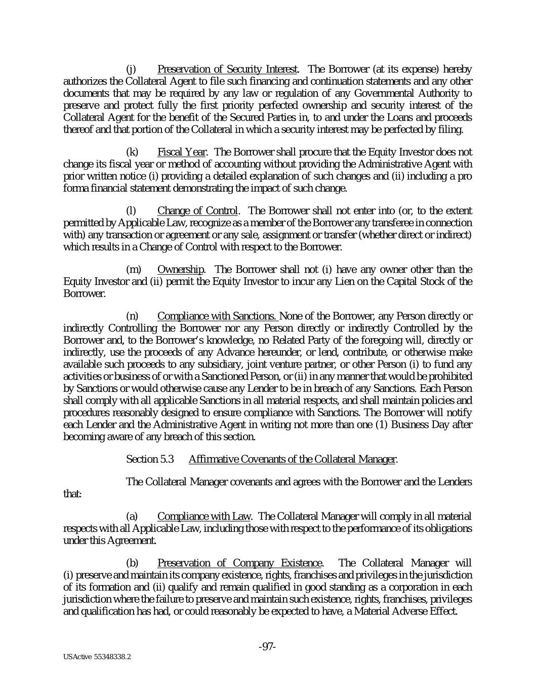(j) Preservation of Security Interest. The Borrower (at its expense) hereby authorizes the Collateral Agent to file such financing and continuation statements and any other documents that may be required by any law or regulation of any Governmental Authority to preserve and protect fully the first priority perfected ownership and security interest of the Collateral Agent for the benefit of the Secured Parties in, to and under the Loans and proceeds thereof and that portion of the Collateral in which a security interest may be perfected by filing. (k) Fiscal Year. The Borrower shall procure that the Equity Investor does not change its fiscal year or method of accounting without providing the Administrative Agent with prior written notice (i) providing a detailed explanation of such changes and (ii) including a pro forma financial statement demonstrating the impact of such change. (l) Change of Control. The Borrower shall not enter into (or, to the extent permitted by Applicable Law, recognize as a member of the Borrower any transferee in connection with) any transaction or agreement or any sale, assignment or transfer (whether direct or indirect) which results in a Change of Control with respect to the Borrower. (m) Ownership. The Borrower shall not (i) have any owner other than the Equity Investor and (ii) permit the Equity Investor to incur any Lien on the Capital Stock of the Borrower. (n) Compliance with Sanctions. None of the Borrower, any Person directly or indirectly Controlling the Borrower nor any Person directly or indirectly Controlled by the Borrower and, to the Borrower’s knowledge, no Related Party of the foregoing will, directly or indirectly, use the proceeds of any Advance hereunder, or lend, contribute, or otherwise make available such proceeds to any subsidiary, joint venture partner, or other Person (i) to fund any activities or business of or with a Sanctioned Person, or (ii) in any manner that would be prohibited by Sanctions or would otherwise cause any Lender to be in breach of any Sanctions. Each Person shall comply with all applicable Sanctions in all material respects, and shall maintain policies and procedures reasonably designed to ensure compliance with Sanctions. The Borrower will notify each Lender and the Administrative Agent in writing not more than one (1) Business Day after becoming aware of any breach of this section. Section 5.3 Affirmative Covenants of the Collateral Manager. The Collateral Manager covenants and agrees with the Borrower and the Lenders that: (a) Compliance with Law. The Collateral Manager will comply in all material respects with all Applicable Law, including those with respect to the performance of its obligations under this Agreement. (b) Preservation of Company Existence. The Collateral Manager will (i) preserve and maintain its company existence, rights, franchises and privileges in the jurisdiction of its formation and (ii) qualify and remain qualified in good standing as a corporation in each jurisdiction where the failure to preserve and maintain such existence, rights, franchises, privileges and qualification has had, or could reasonably be expected to have, a Material Adverse Effect. -97- USActive 55348338.2